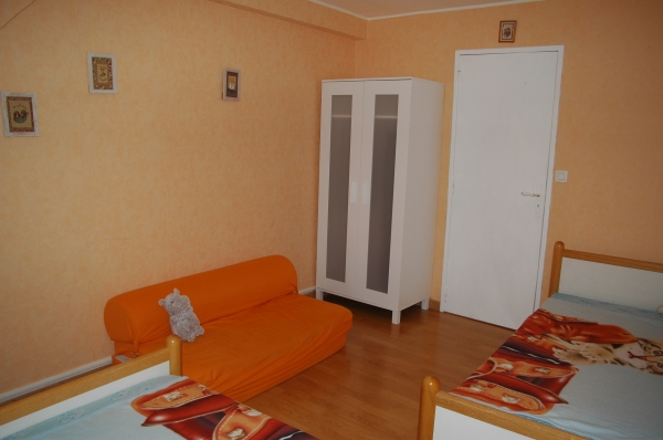 Apartment on the 5th floor of a residence, lift (to the 4th floor). Separate kitchen with dining area, living room with sofa bed (1×140), bedroom (2×90), bathroom, separate WC. Television, DVD player, microwave, dishwasher, washing machine, storeroom.