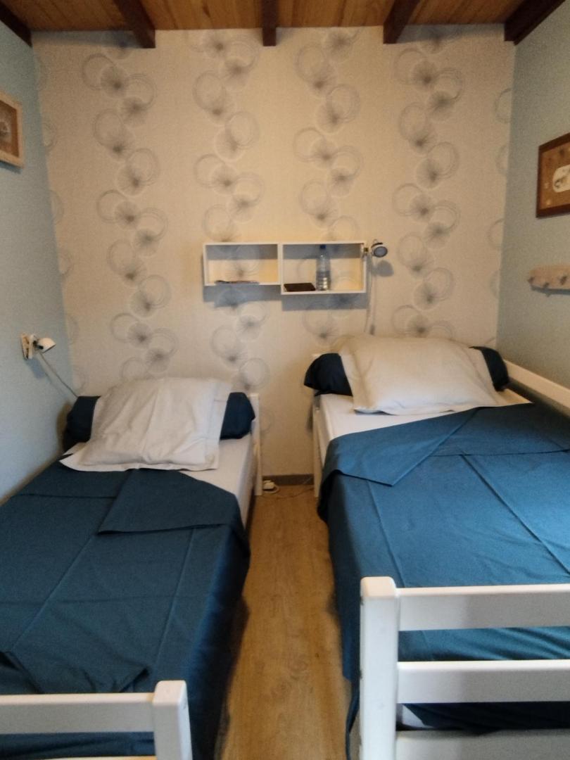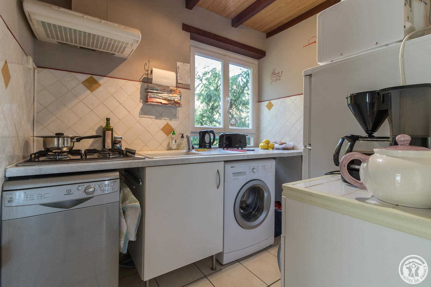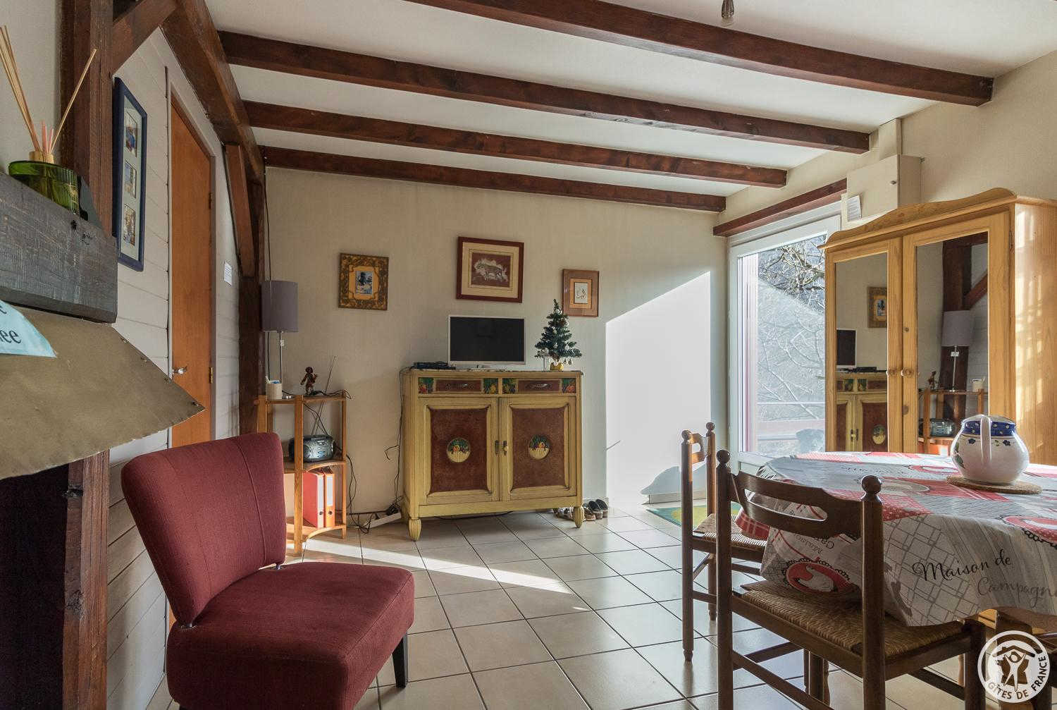 Access to the chalet by a few steps (staircase and private raised terrace): living room, kitchenette, 1 small double bedroom (7.80m²) (1 double bed 140cm), a small children’s bedroom (6m²) (2 single beds 90cm), shower room (hairdryer), WC. Shared electric heating.