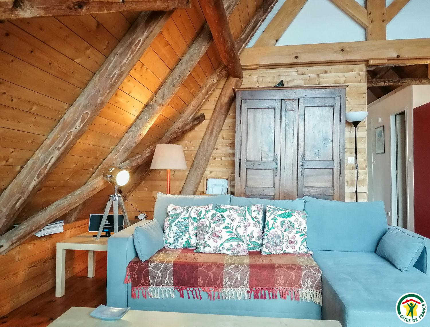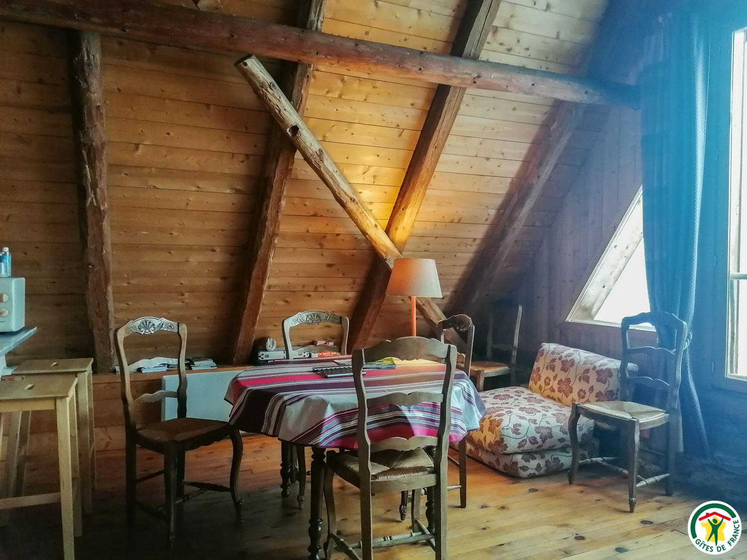 In the village, this stone and slate barn, renovated while preserving the wooden roof structure, adjoins the owners’ house and welcomes you in a mountain setting with a 180° panoramic view of the summits from the living room: les Spijeoles, le Céciré, Superbagnères…