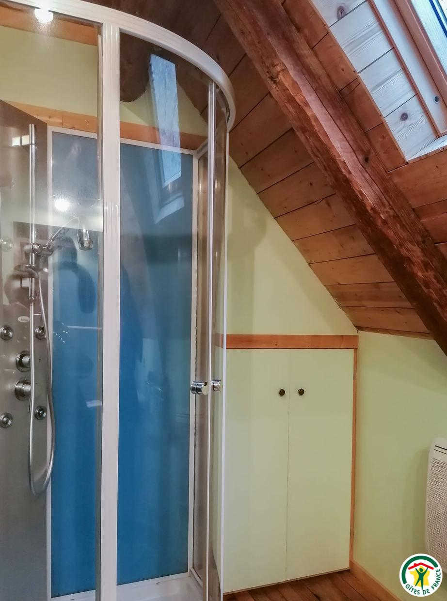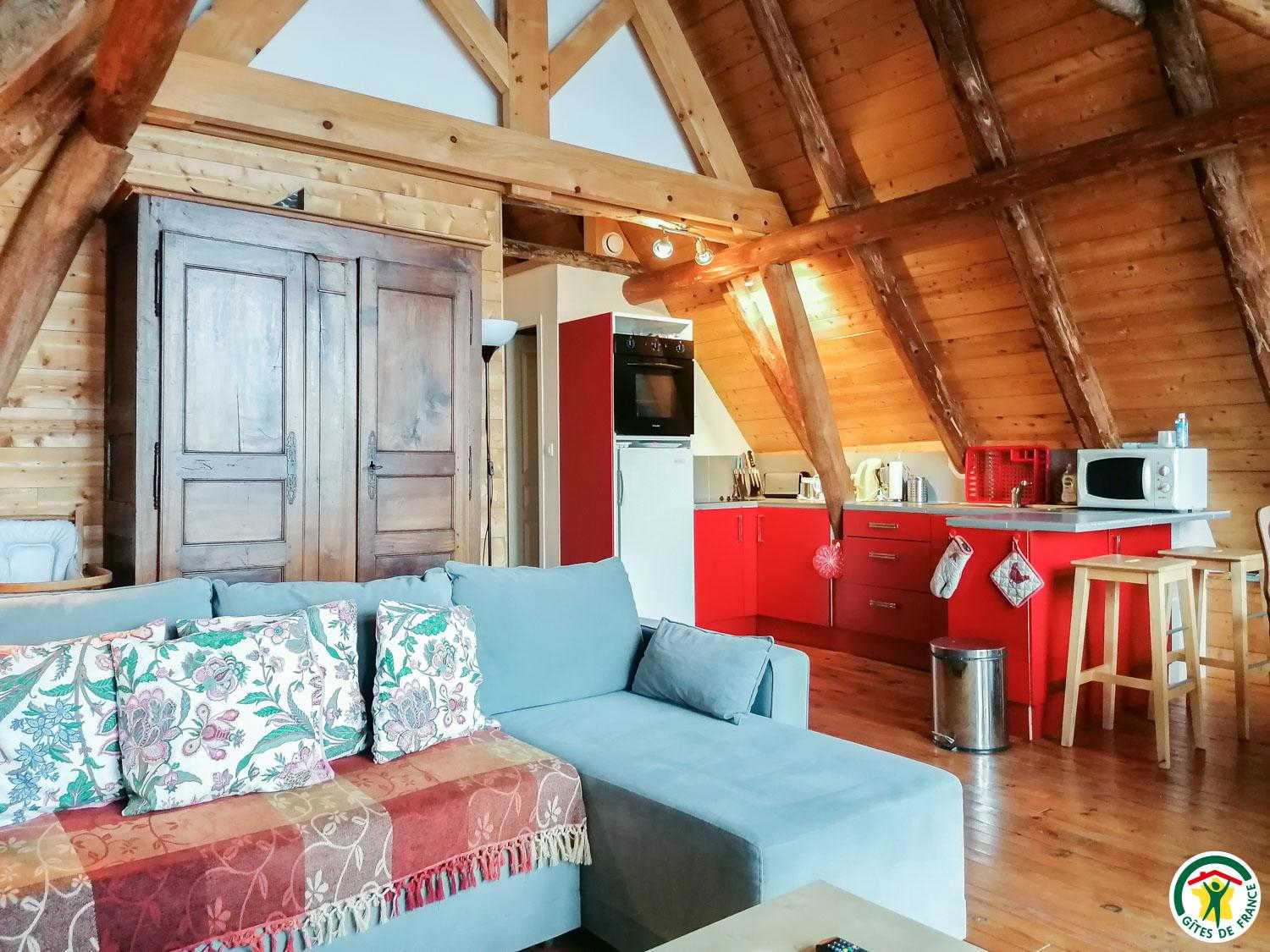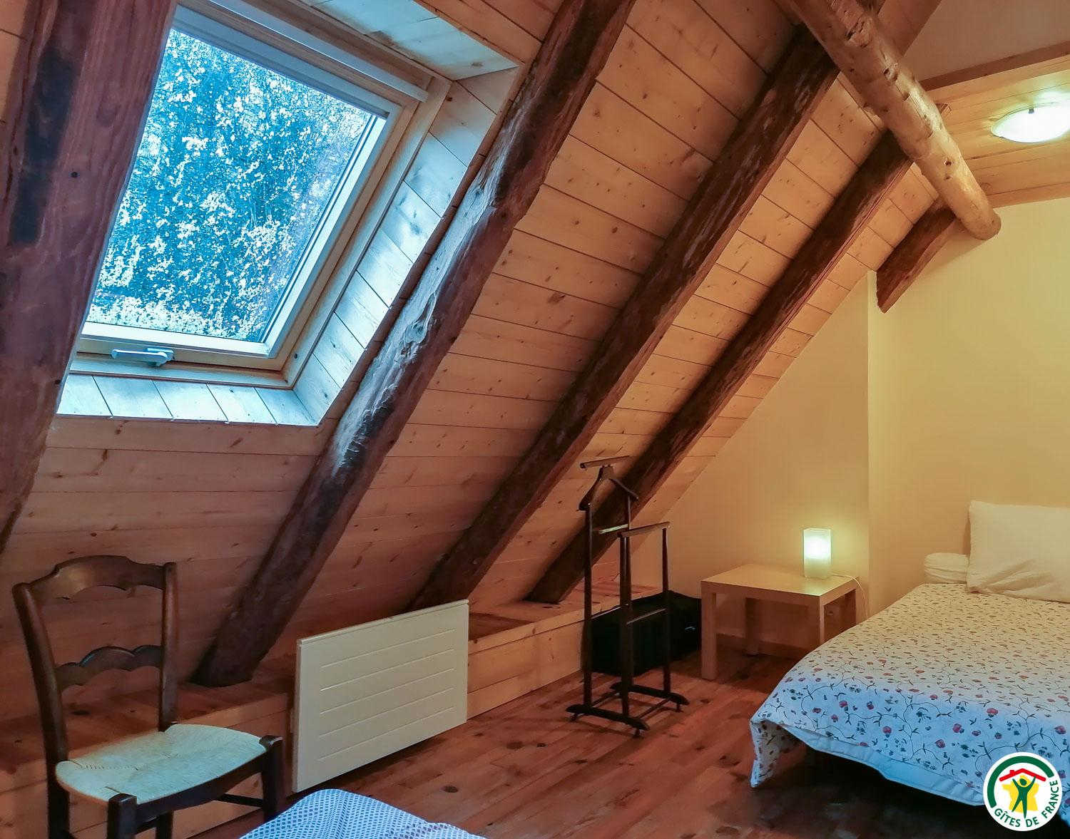 Gîte on one level after descending three steps: entrance, large room (timber frame and glazed gable with panoramic view of the peaks) comprising living room with fitted kitchen, dining area and sitting area (1 x 140cm sofa bed), shower room (multi-jet shower), WC, bedroom (1 x 140cm double bed and 1 x 90cm single bed).