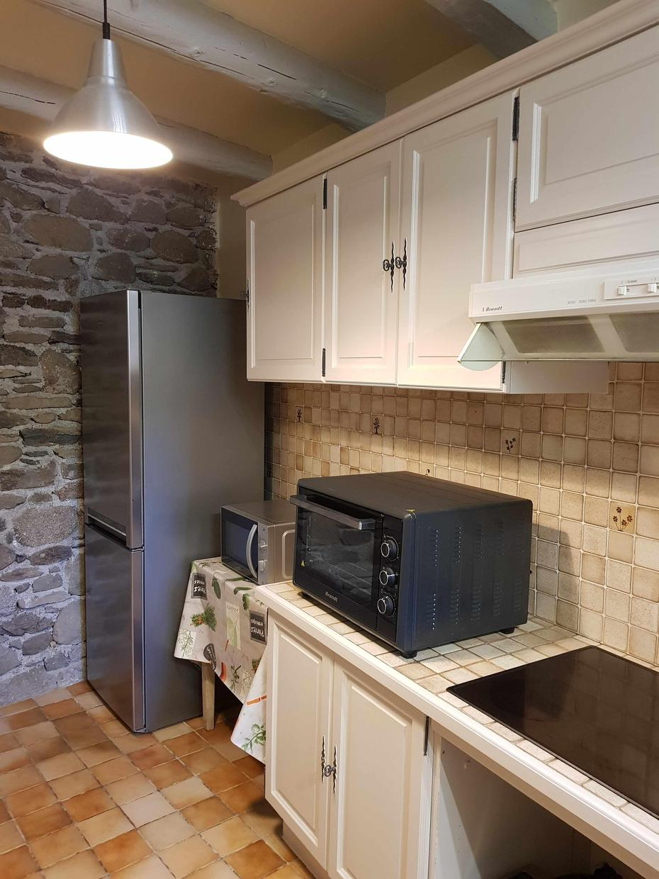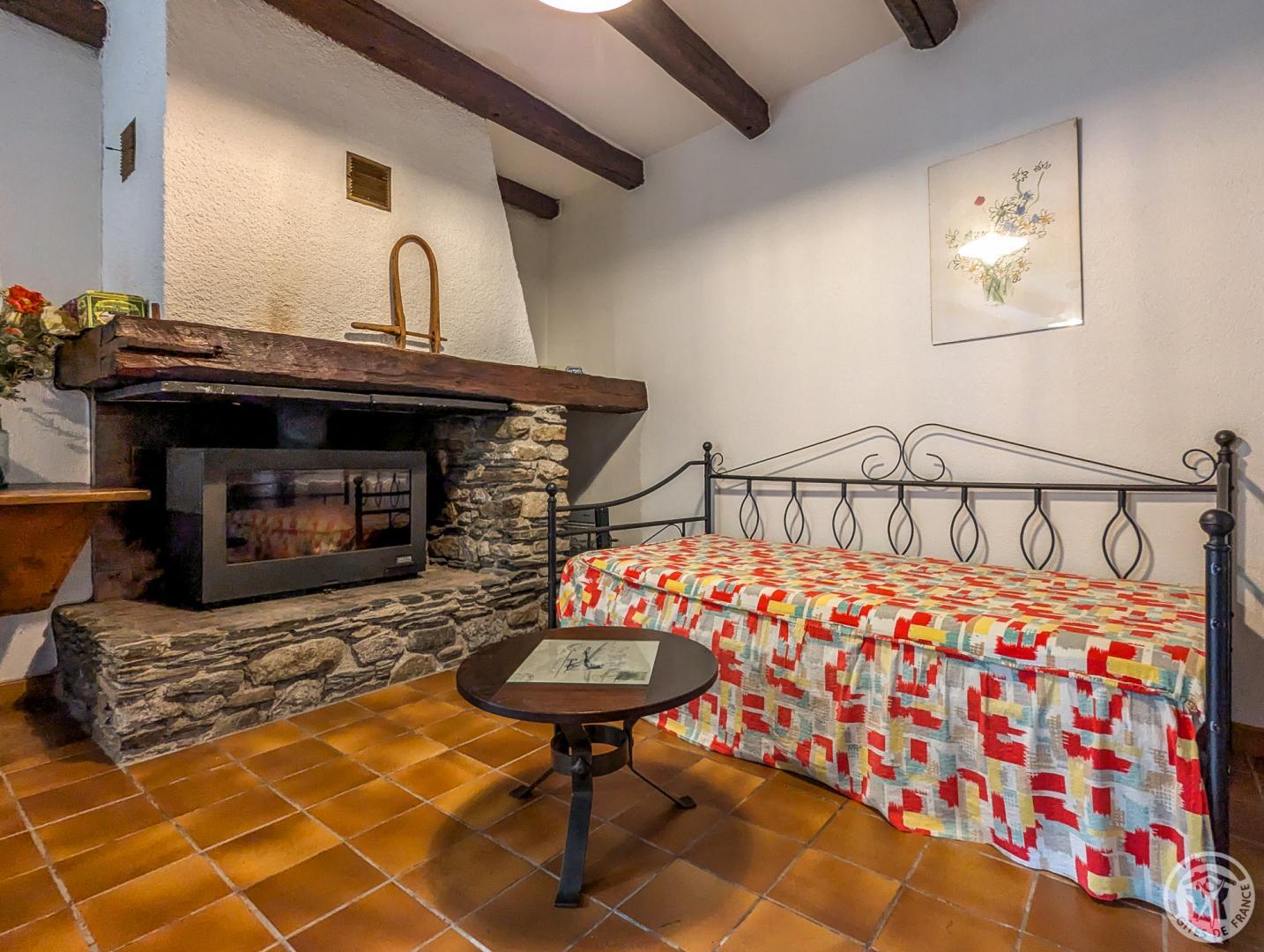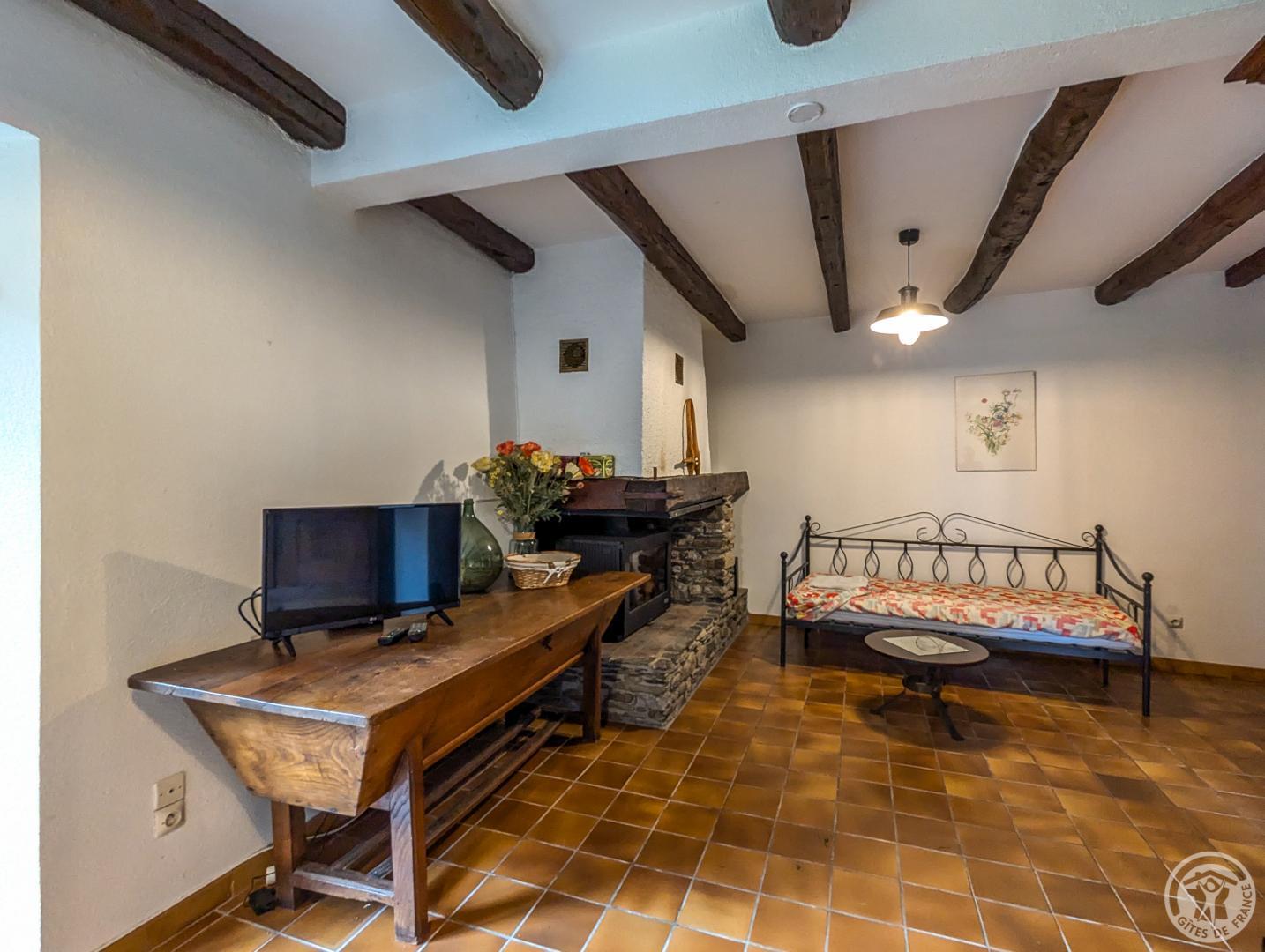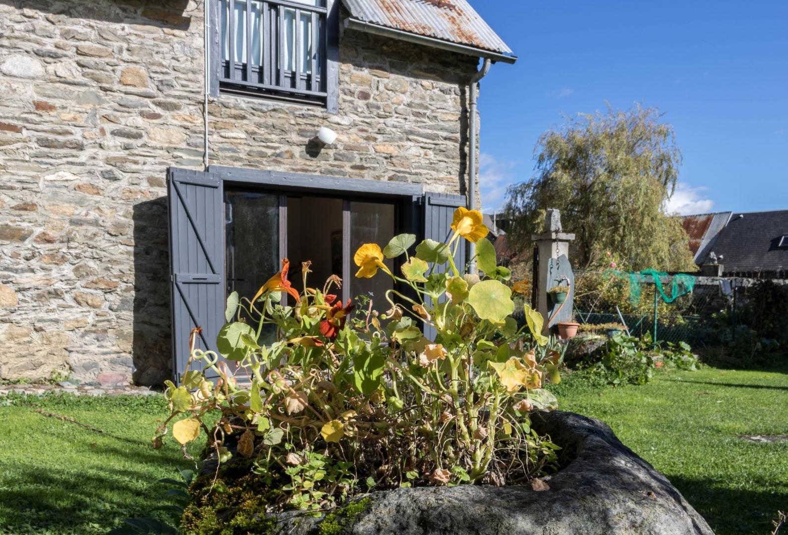 One-storey gîte, vertically adjoining a rental property in summer only, and next door to the owner: living room with dining area and sitting area (sofa bed), separate kitchen, bedroom (1 double bed 140*190cm), bathroom, separate WC. Large, sunny garden most of the day, with space for a car in summer. Public parking on the edge of the garden. Electric heating and first flames lit on arrival, by an insert fireplace. Internet via the owner’s WIFI. Please note that the bedroom window overlooks the owner’s vegetable garden.