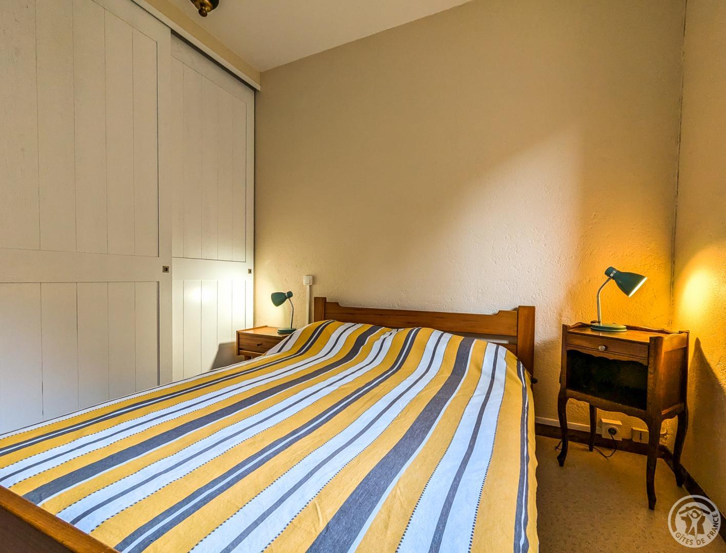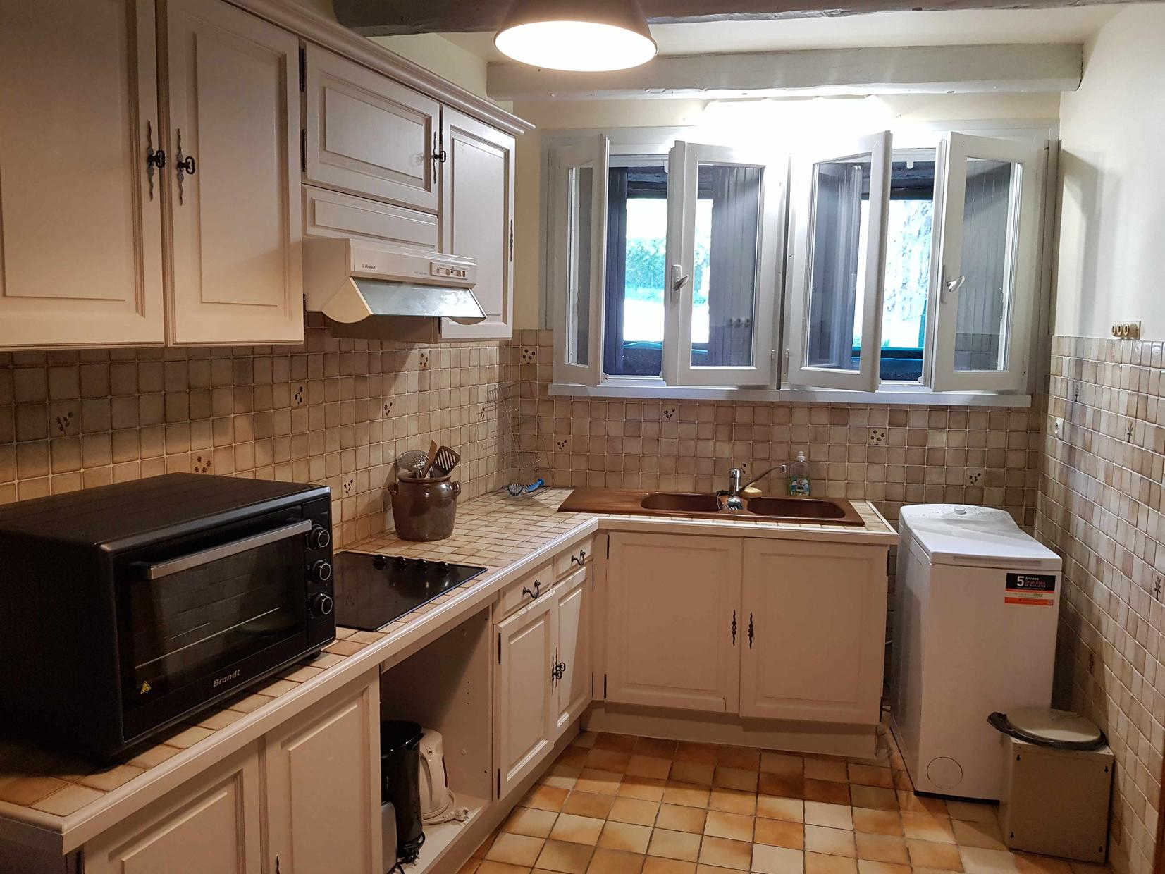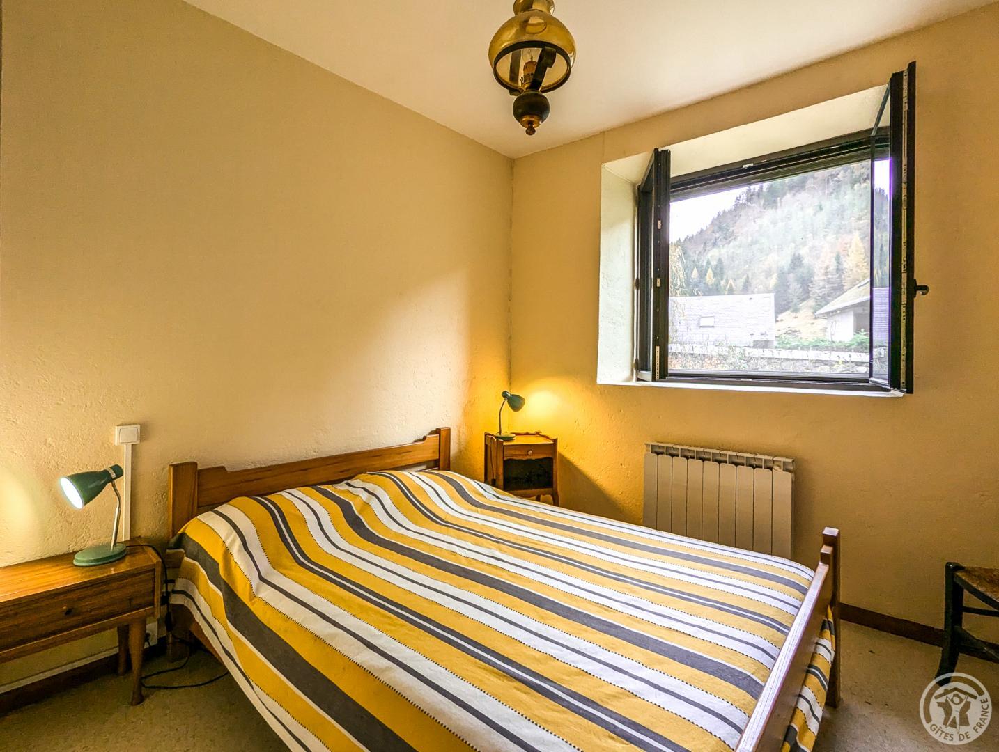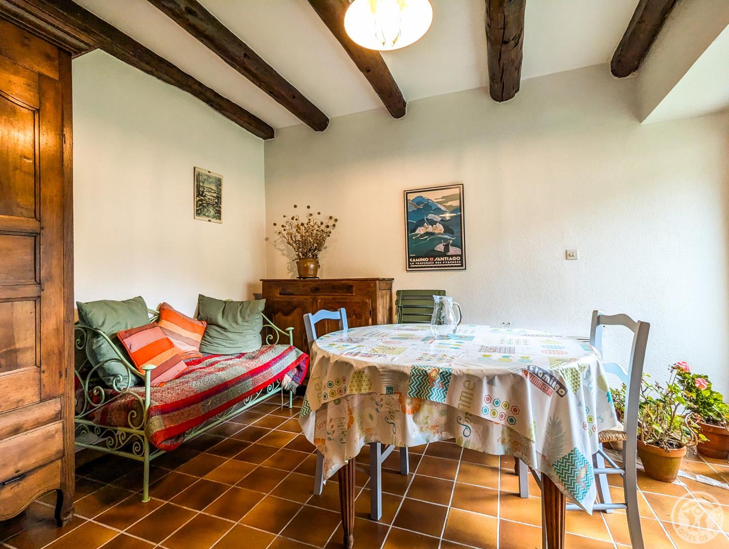 One-storey gîte, vertically adjoining a rental property in summer only, and next door to the owner: living room with dining area and sitting area (sofa bed), separate kitchen, bedroom (1 double bed 140*190cm), bathroom, separate WC. Large, sunny garden most of the day, with space for a car in summer. Public parking on the edge of the garden. Electric heating and first flames lit on arrival, by an insert fireplace. Internet via the owner’s WIFI. Please note that the bedroom window overlooks the owner’s vegetable garden.