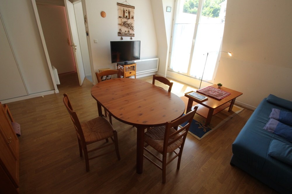 This flat comprises a living room letting in the afternoon sun thanks to its western exposure and large bay window, sofa, television, a west-facing bedroom with a 140 double bed and a wardrobe, a fitted kitchenette (oven, microwave, washing machine, induction hob) closed with window, a bathroom with bath and a separate WC.