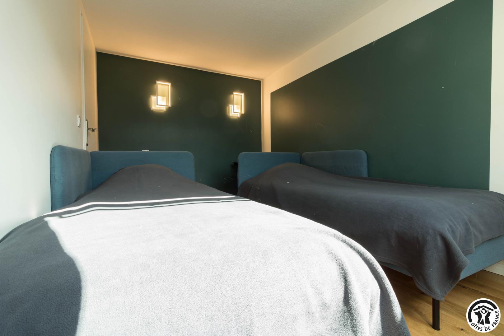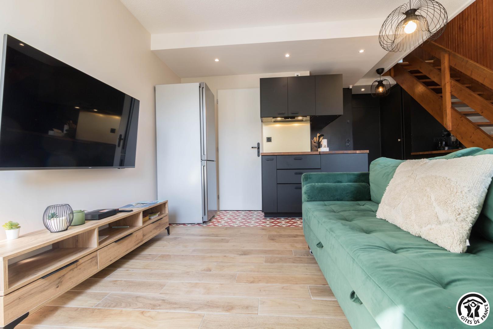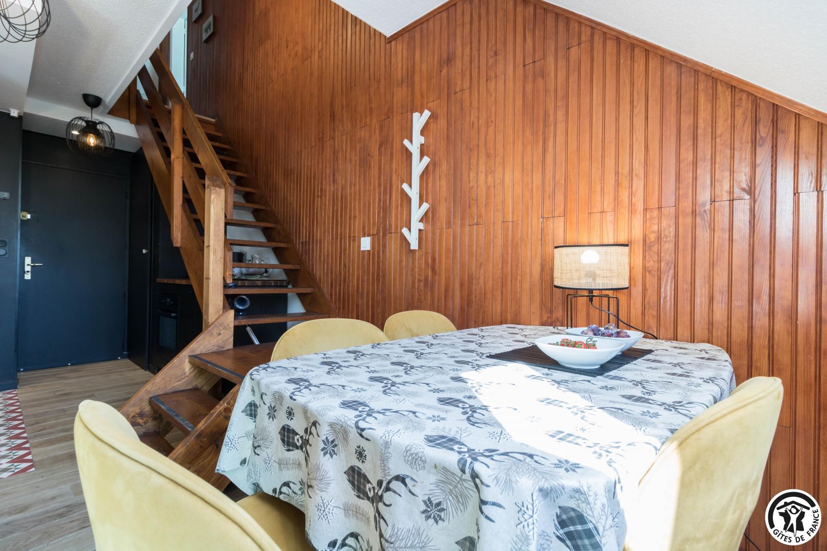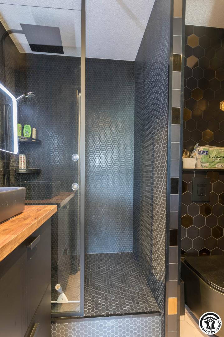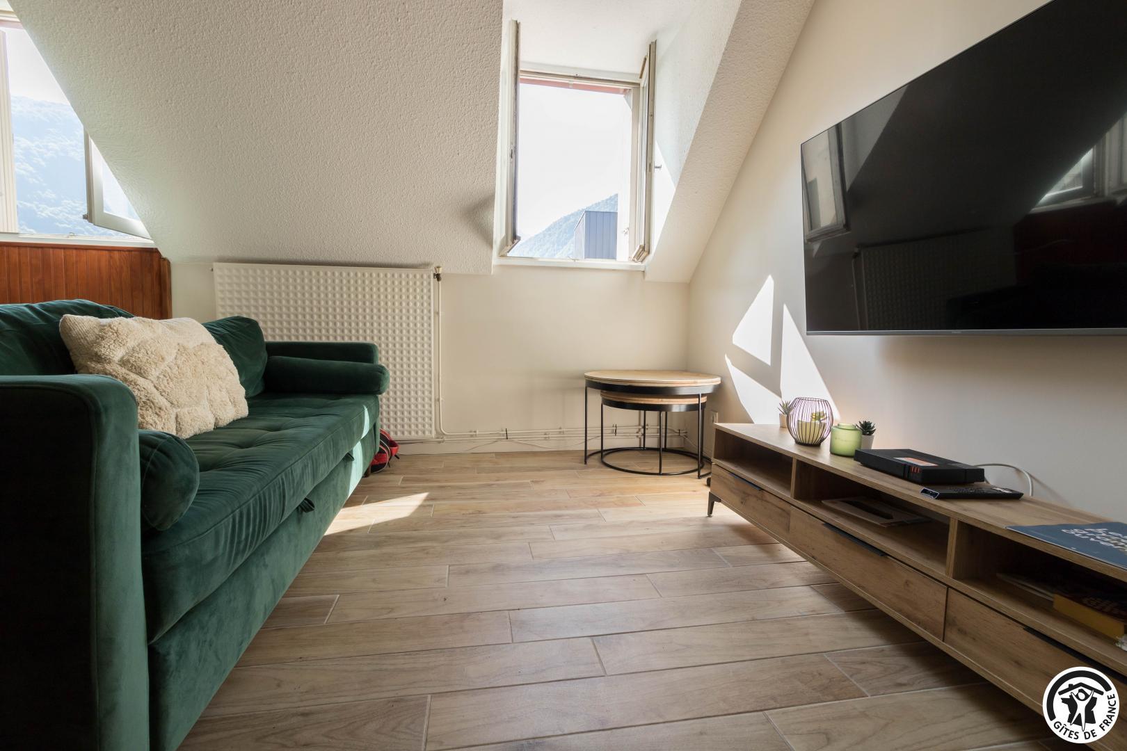 Discover the capital of the Central Pyrenees, thanks to this comfortable self-catering accommodation. This little Pyrenean jewel has everything you need for an unforgettable stay, and its decor is sober and refined. You will have access to a private underground parking space (at -1, accessible to small cars) and next to your parking space, a ski room. The flat is on the fourth floor with lift: entrance, living room (fitted kitchen, dining area and sitting area), shower room/WC. On the first floor, you will find 2 bedrooms (master bedroom: 6.27 loi Carrez and 12.04 on the floor, children’s bedroom: 9.97 loi Carrez and 16.76 on the floor) each with 2 single beds 90*200cm (the beds in the small bedroom can be twinned) and a WC (washing machine).