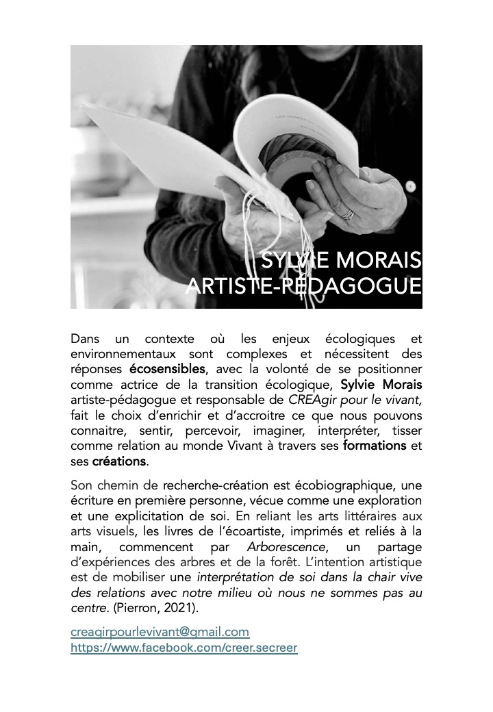 In a context where ecological and environmental issues are complex and require ecologically sensitive responses, and with the desire to position herself as a player in the ecological transition, Sylvie Morais, artist-educator and head of CREAgir pour le vivant, has chosen to enrich and increase what we can know, feel, perceive, imagine, interpret and weave into our relationship with the living world through her training courses and creations.