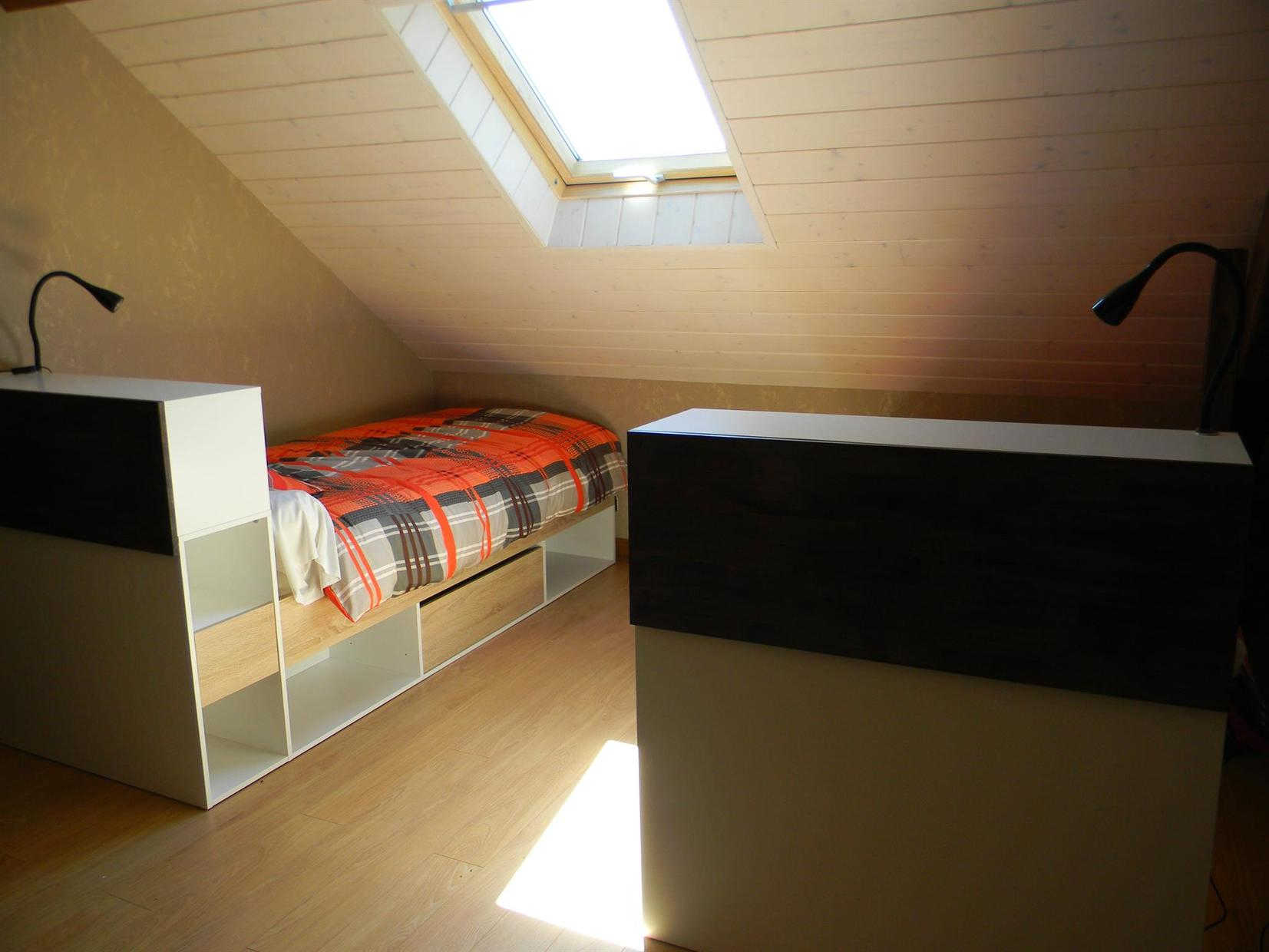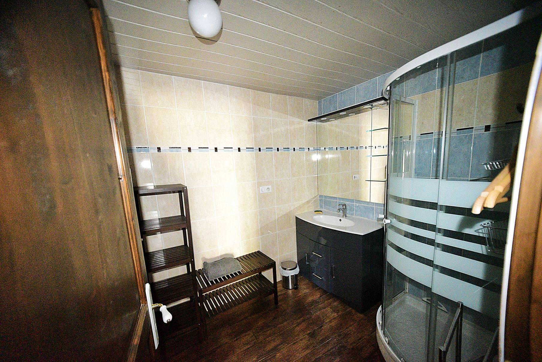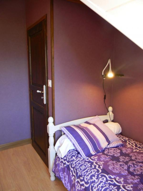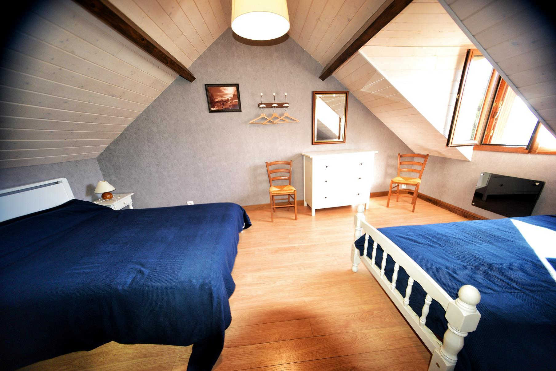 Entrada por la sala de estar con cocina, comedor y sala de estar (estufa de leña), dormitorio con tabique extraíble que puede ampliar la sala de estar (sofá cama doble de 140 cm), WC, cuarto de ducha. Arriba: 2 habitaciones (1 cama de matrimonio (140cm) y 1 cama individual (90cm)) (1 cama de matrimonio (140cm) y 1 cama individual (90cm)), zona de dormir en altillo (2 camas individuales (90cm)), WC con lavabo, cuarto de ducha. Calefacción eléctrica y de leña incluidas. Lavadora. Tenis de mesa. Se admiten animales.