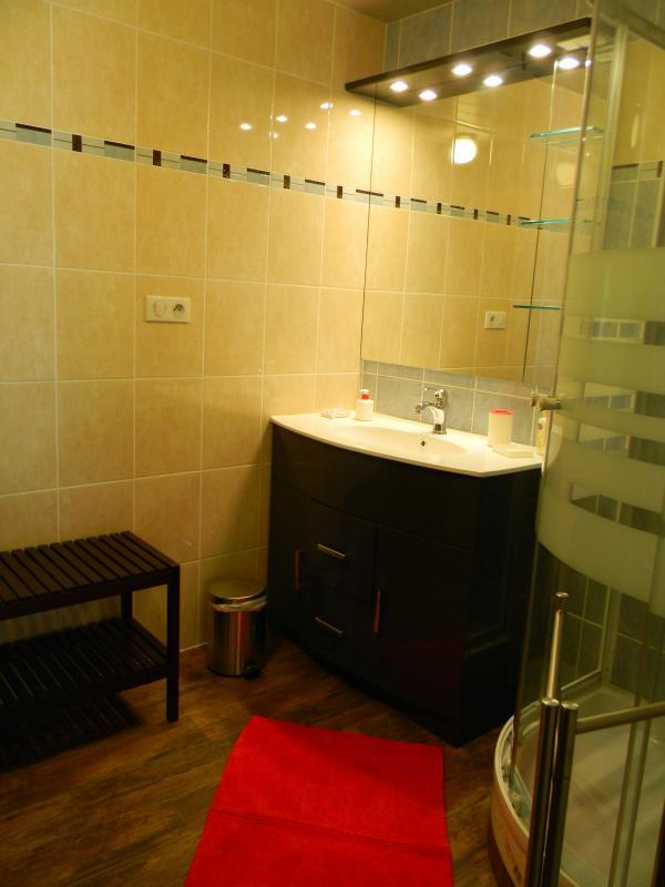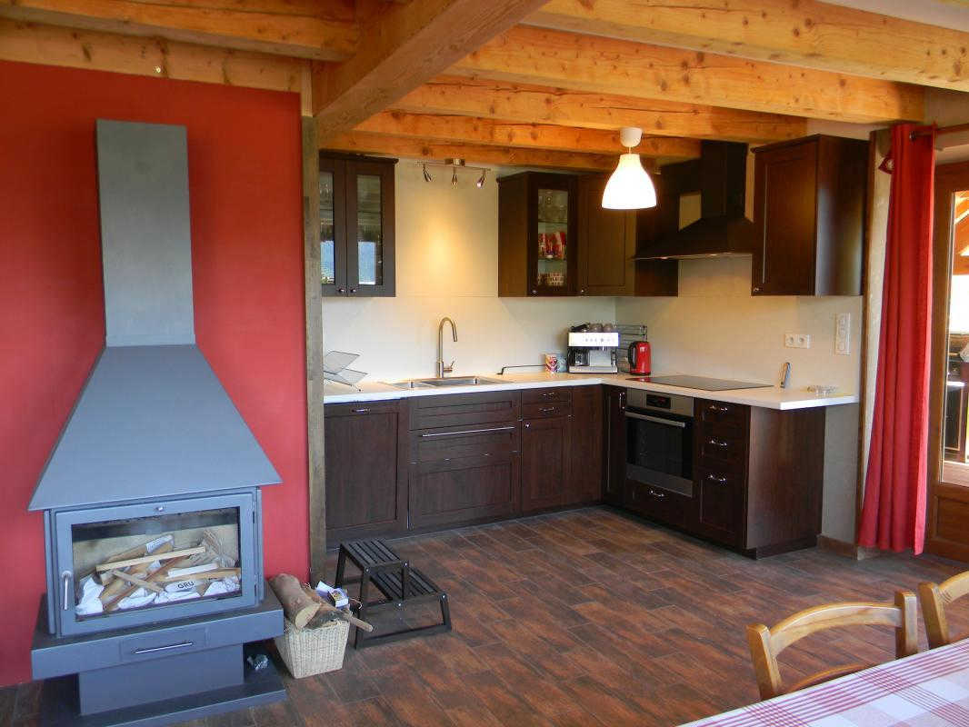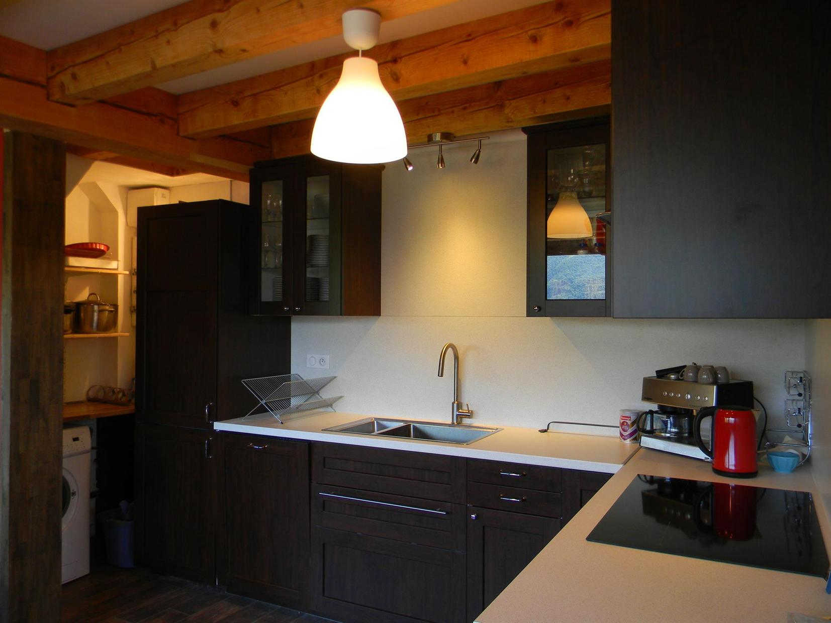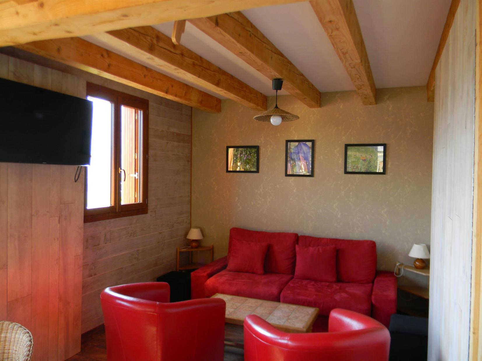 Entrada por la sala de estar con cocina, comedor y sala de estar (estufa de leña), dormitorio con tabique extraíble que puede ampliar la sala de estar (sofá cama doble de 140 cm), WC, cuarto de ducha. Arriba: 2 habitaciones (1 cama de matrimonio (140cm) y 1 cama individual (90cm)) (1 cama de matrimonio (140cm) y 1 cama individual (90cm)), zona de dormir en altillo (2 camas individuales (90cm)), WC con lavabo, cuarto de ducha. Calefacción eléctrica y de leña incluidas. Lavadora. Tenis de mesa. Se admiten animales.