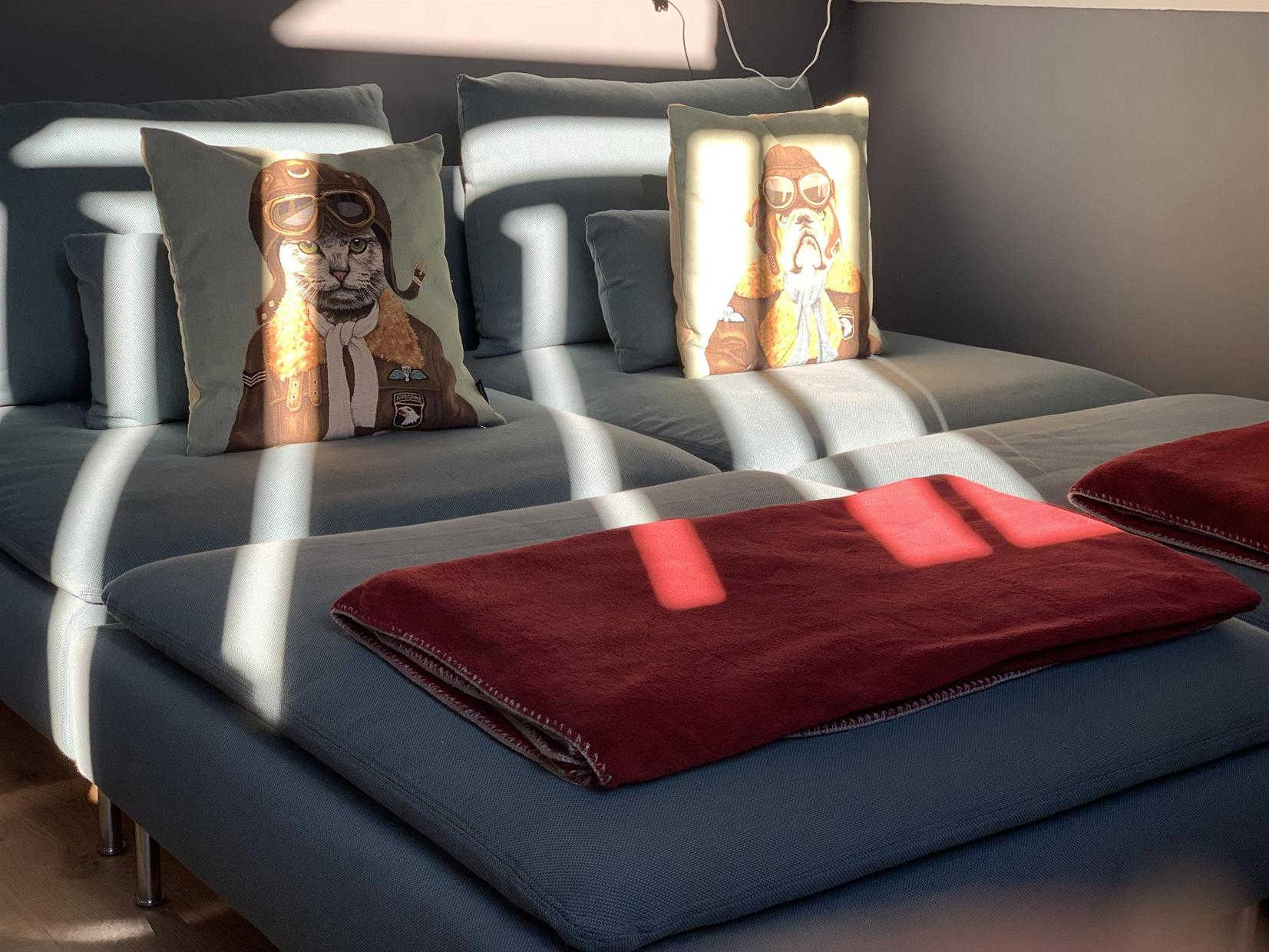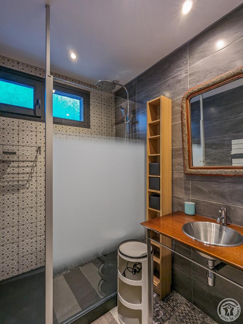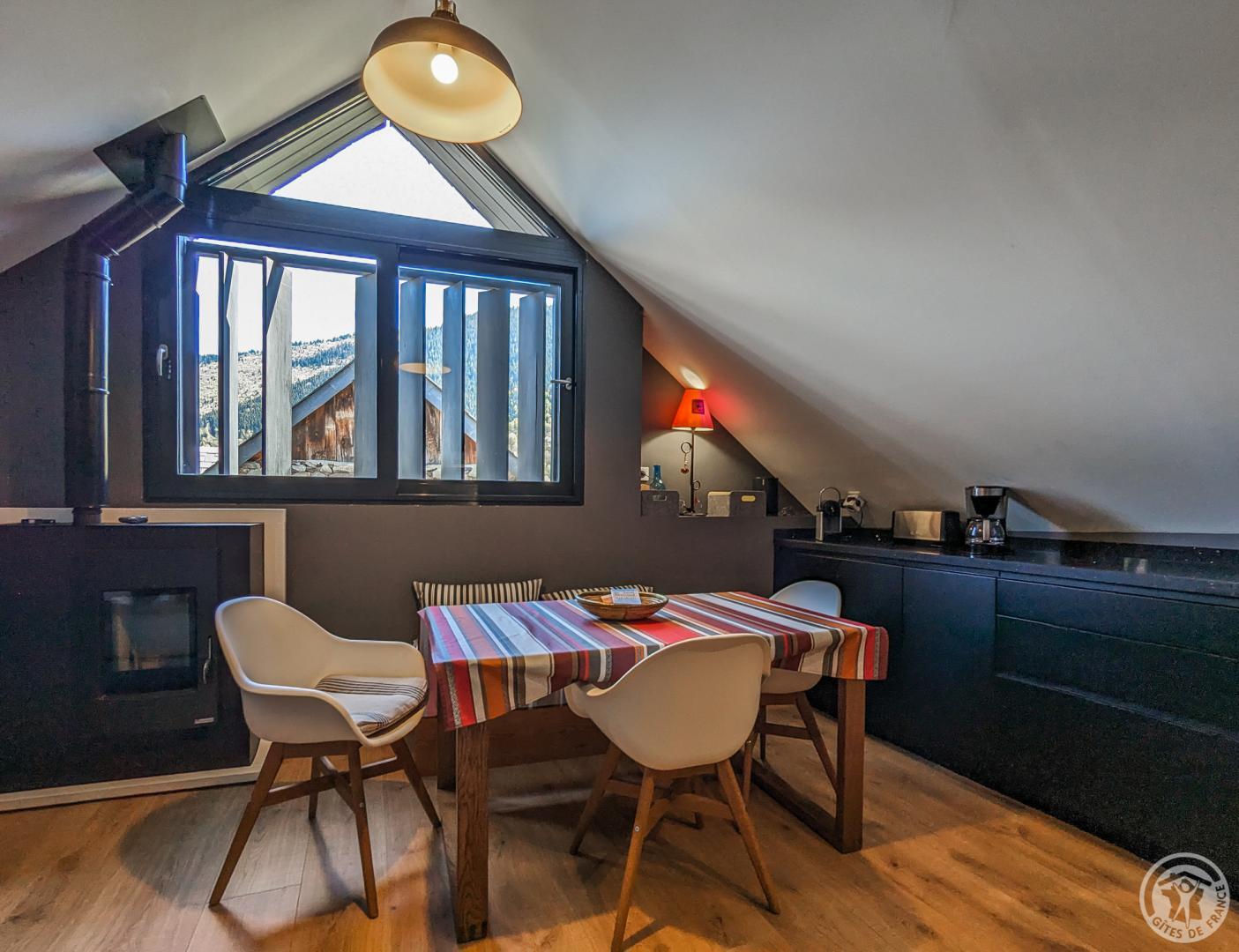Casa rural de una sola planta: entrada, trastero/vestidor y guardaesquís/zapatos, etc… Sala de estar con cocina equipada con vistas a la montaña (estufa de pellets), zona de dormitorio separada de la sala de estar por cortinas, cuarto de ducha, WC separado. Calefacción eléctrica como complemento de la estufa.