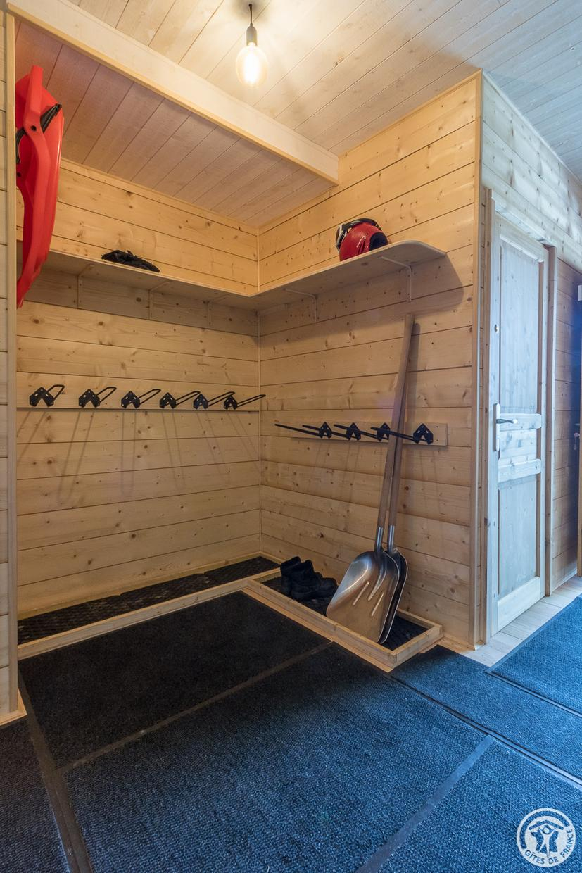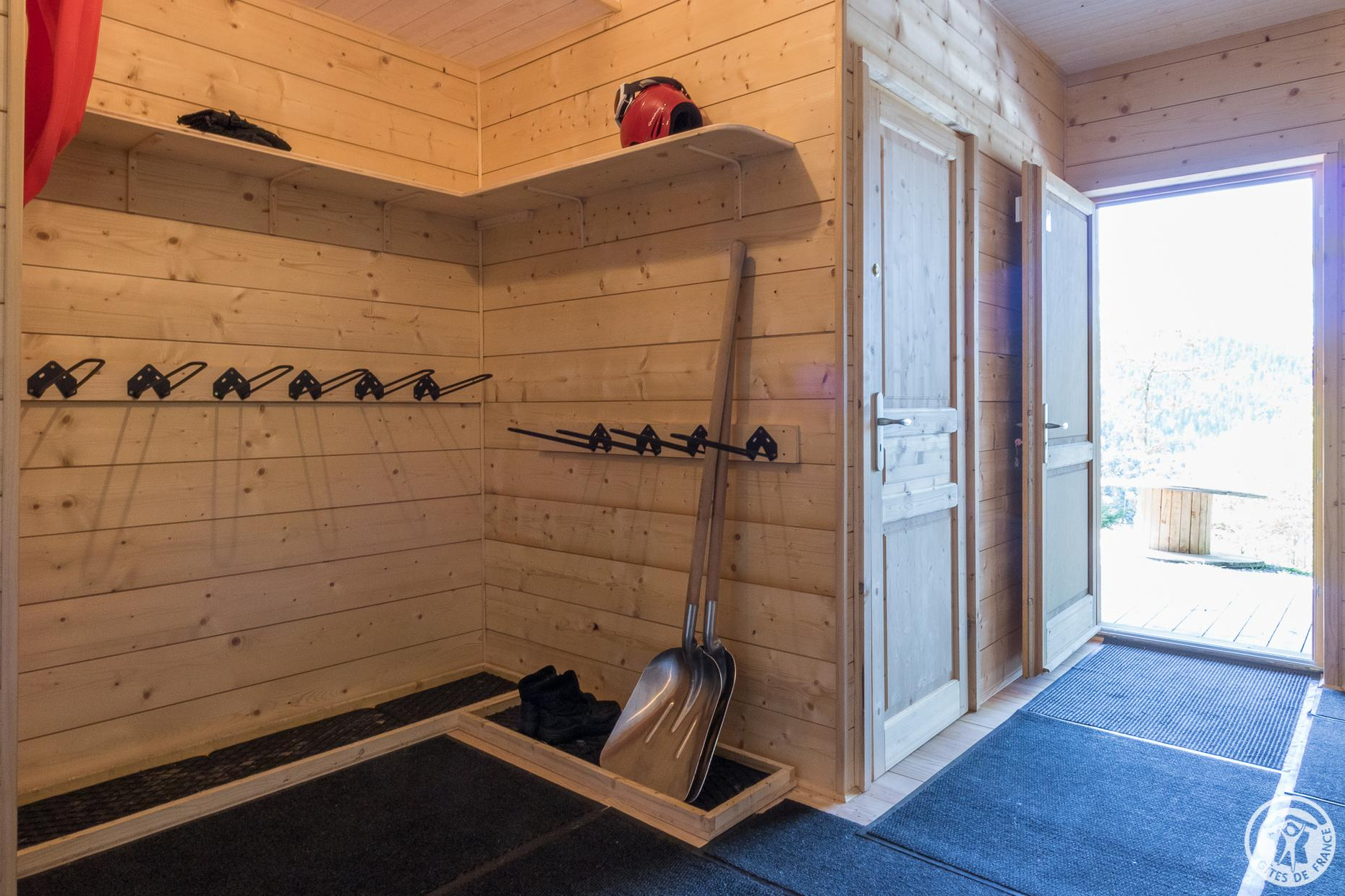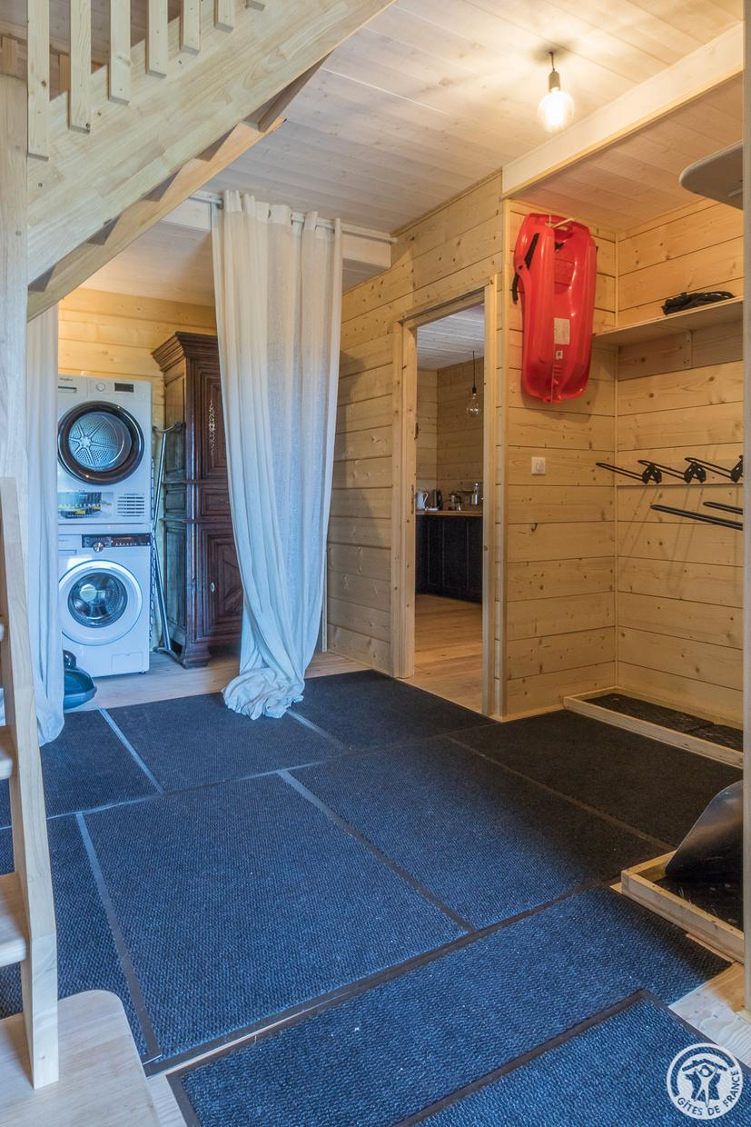 Una escalera conduce a la casa rural desde la carretera de abajo, donde hay aparcamiento disponible. Una gran terraza cubierta privada a la casa rural es el hogar de muebles de jardín y una plancha. También hay una bolera. La gran entrada común da acceso a una zona de lavandería con lavadora y secadora. También hay portaesquís, para que pueda secar su equipo de esquí, botas de montaña o guardar sus bicicletas si lo necesita.
