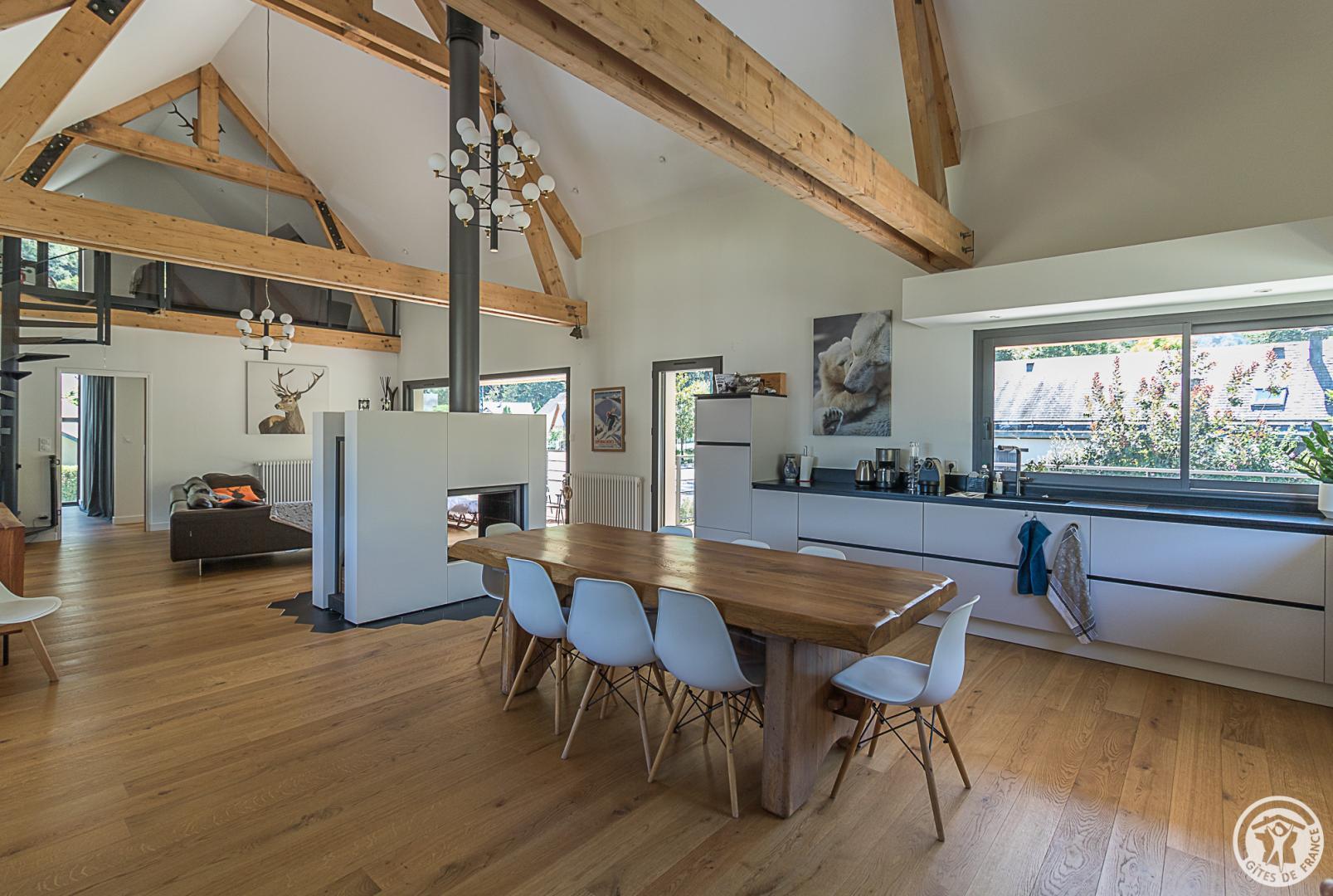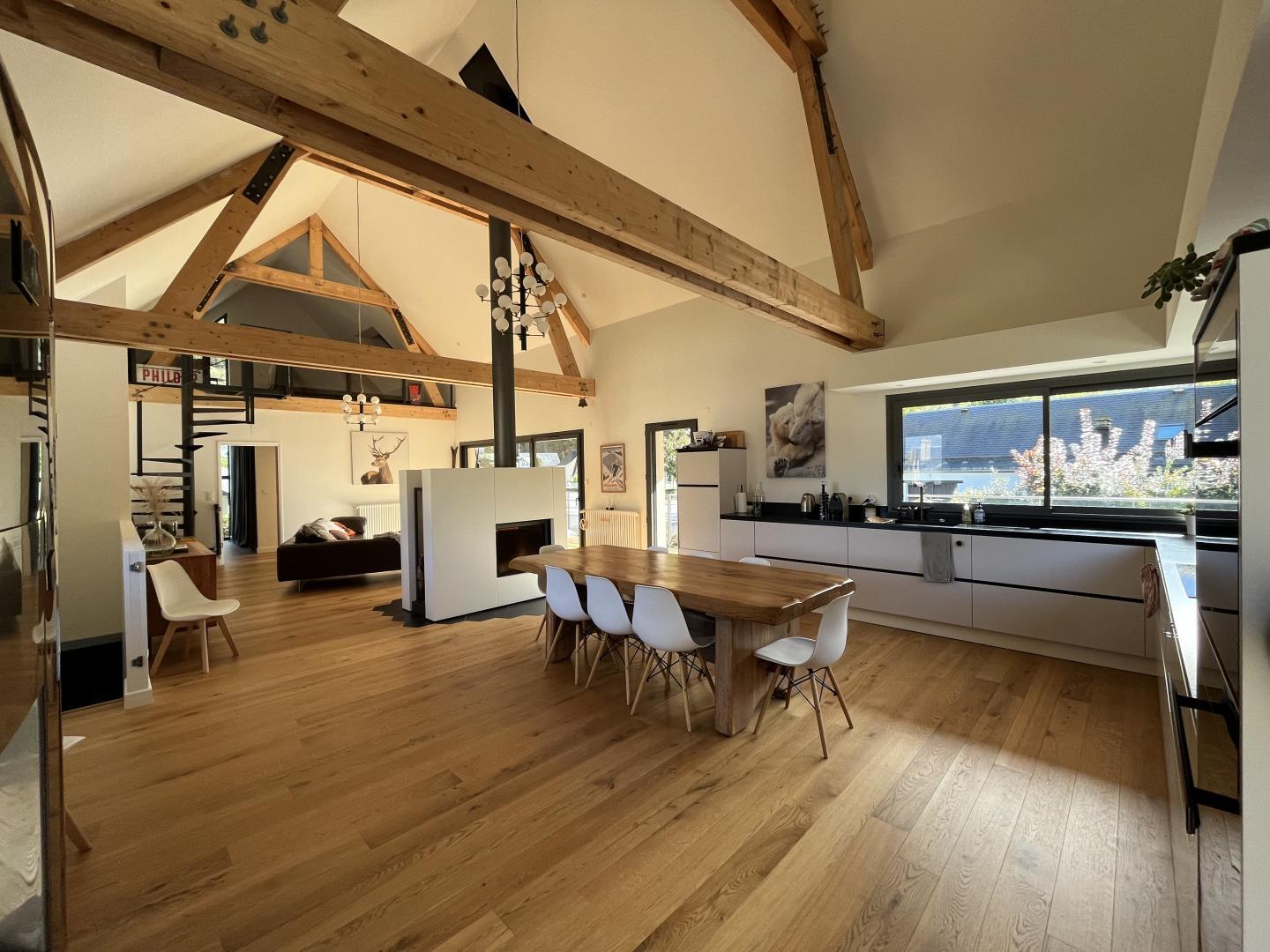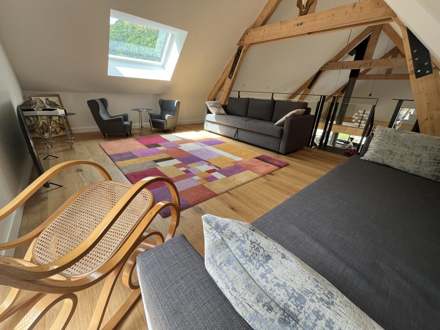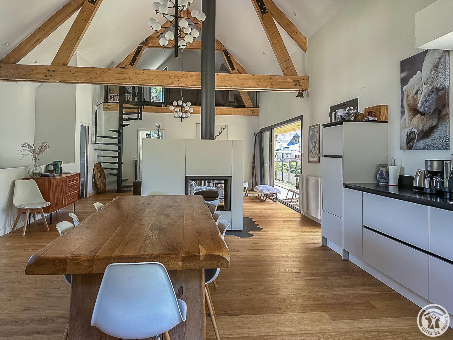 – Arriba: una escalera recta conduce al amplio y espacioso salón (vigas vistas). Una chimenea central da acceso a la cocina americana y al comedor, por un lado, y al salón, por el otro. Habitación (1 cama doble 160x200cm), vestidor, cuarto de ducha, WC separado.