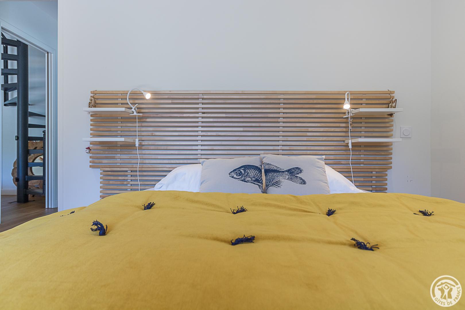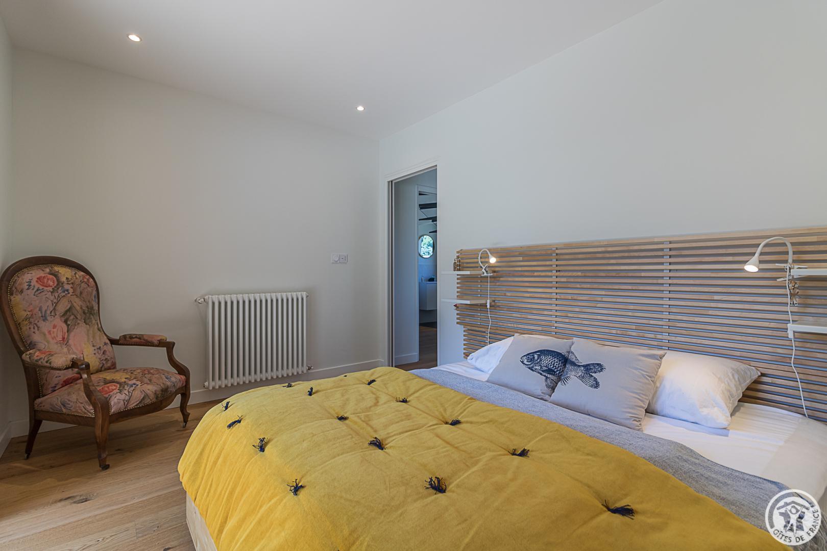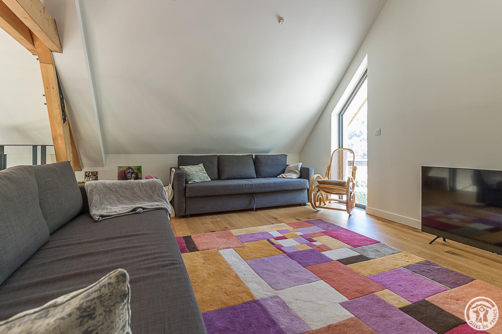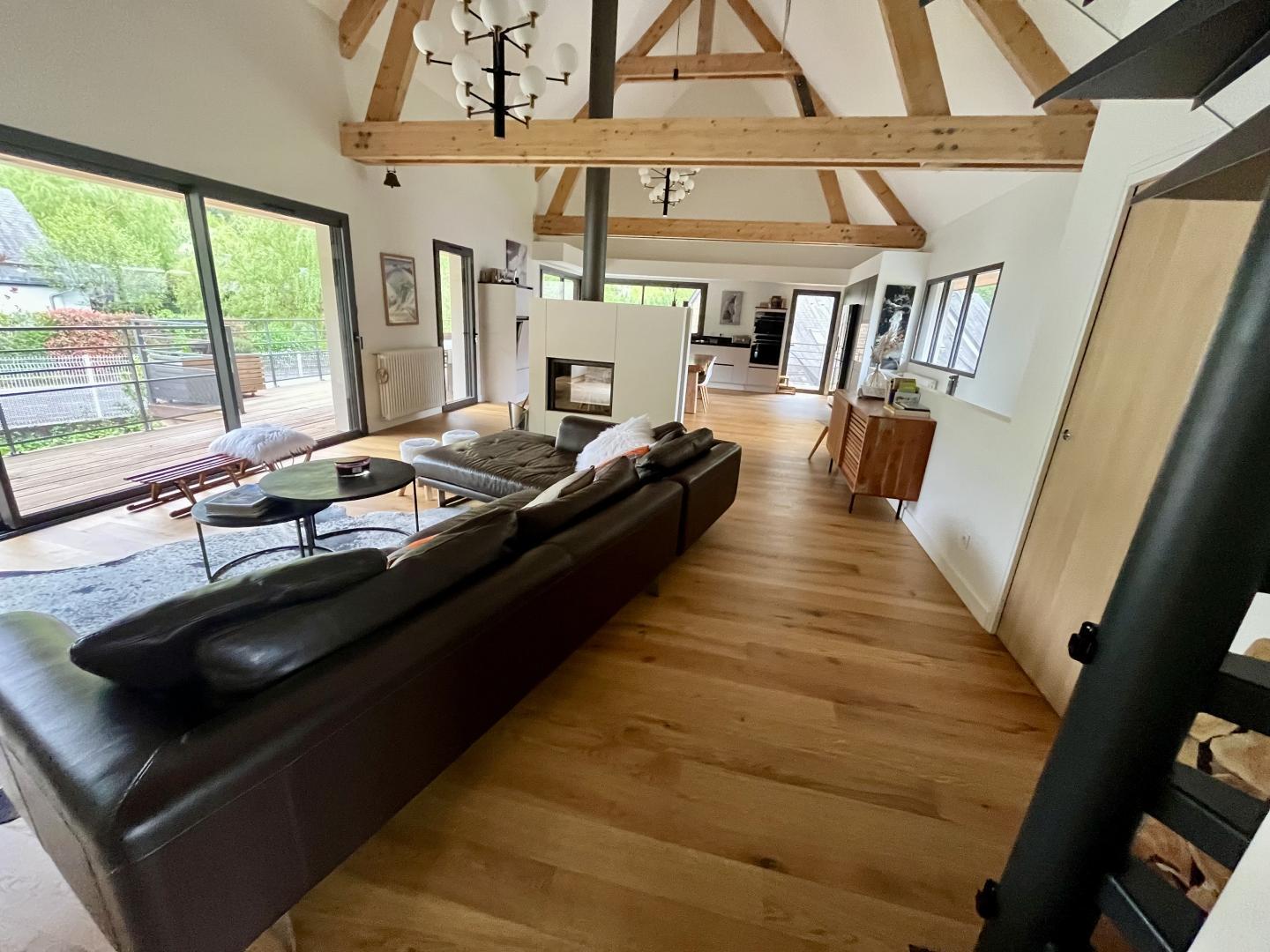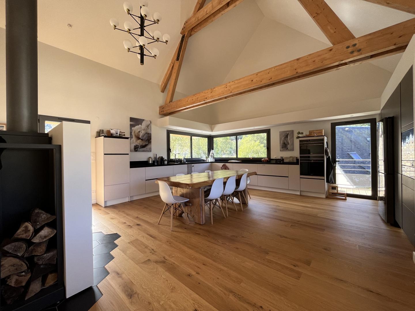 – Arriba: una escalera recta conduce al amplio y espacioso salón (vigas vistas). Una chimenea central da acceso a la cocina americana y al comedor, por un lado, y al salón, por el otro. Habitación (1 cama doble 160x200cm), vestidor, cuarto de ducha, WC separado.