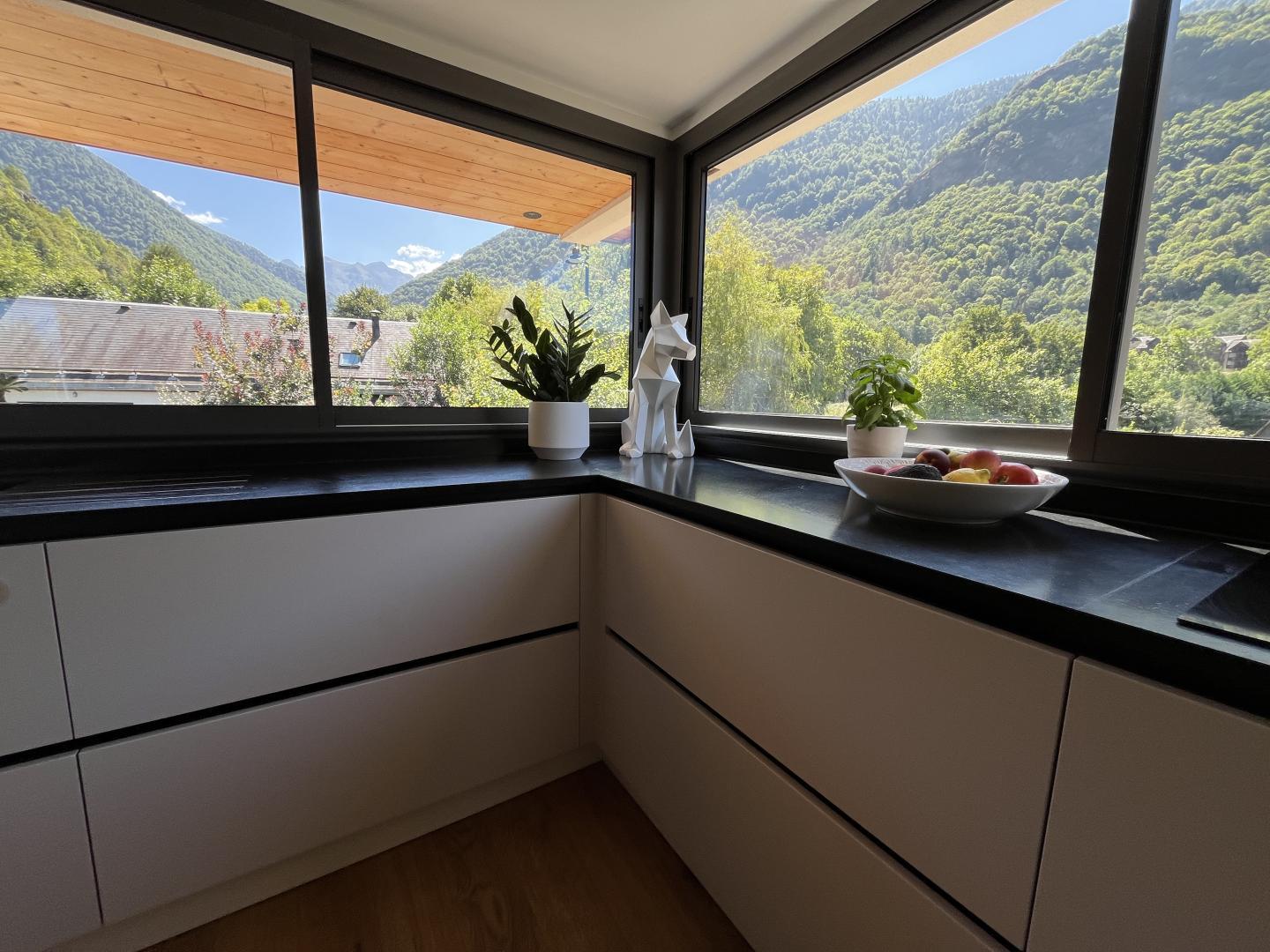 La casa ha sido diseñada para aprovechar al máximo la luz y las vistas de los Pirineos desde todas las habitaciones, y para facilitar el acceso al jardín y a la terraza de arriba a través de grandes ventanales.
