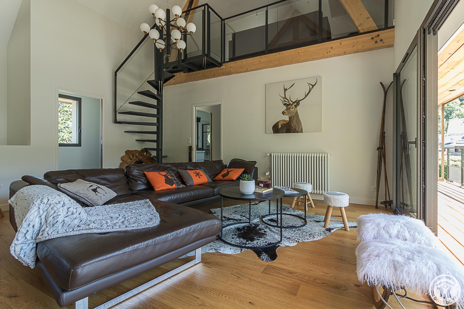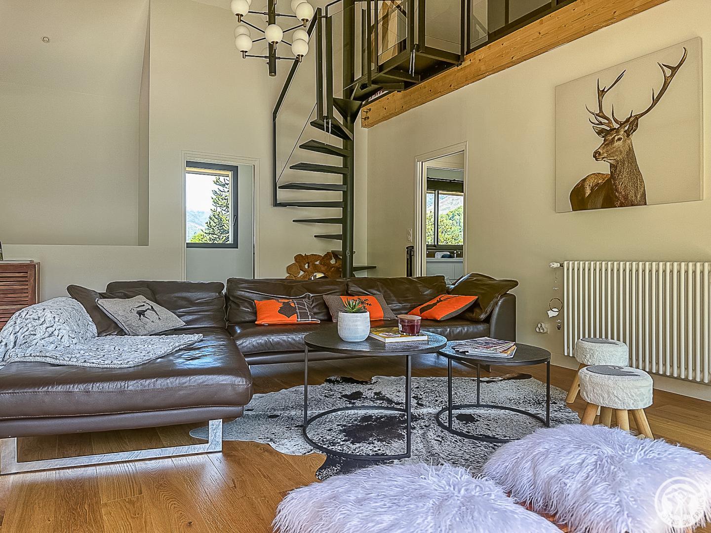– Una escalera de caracol conduce al entresuelo, transformado en sala de televisión.