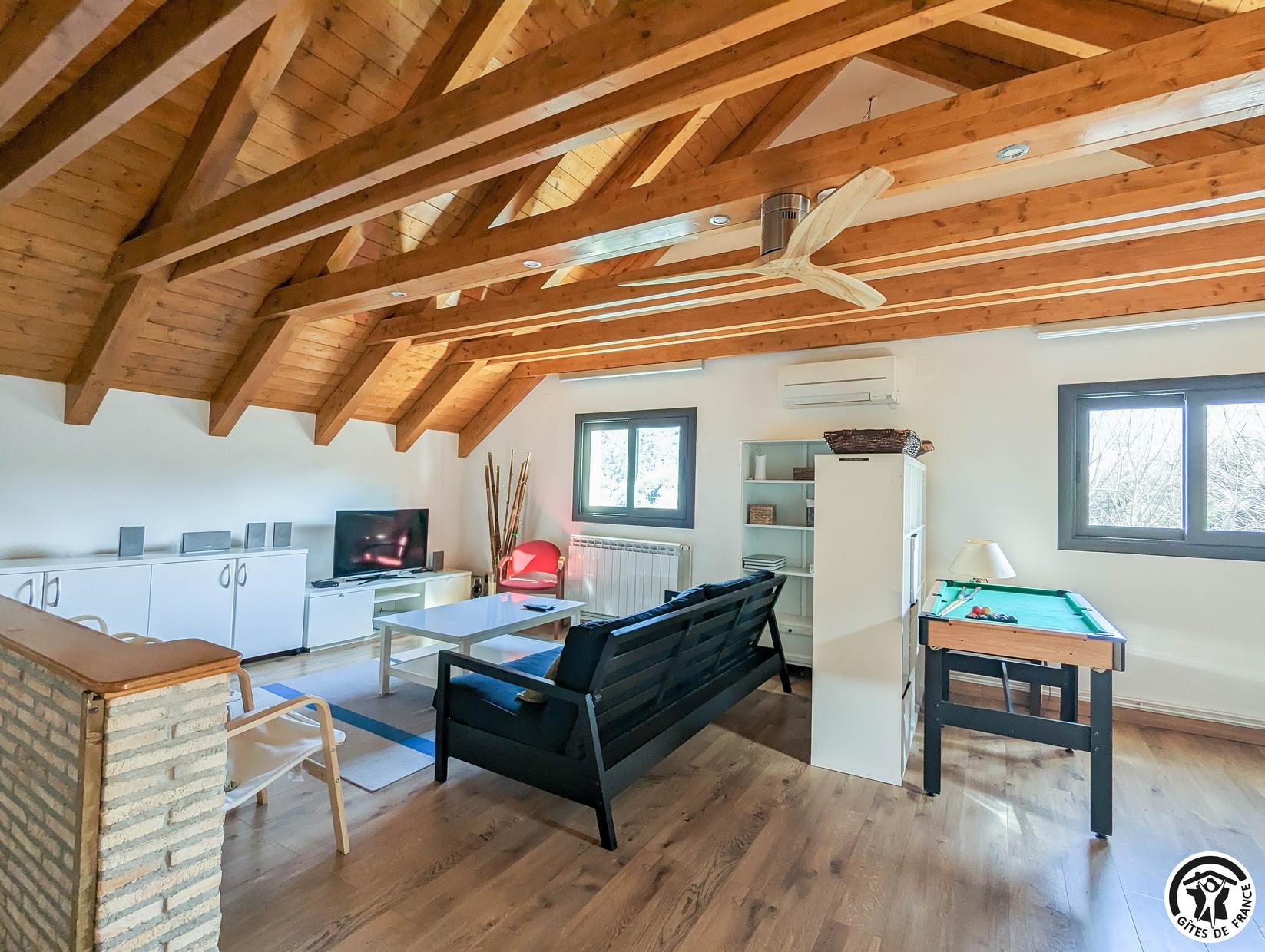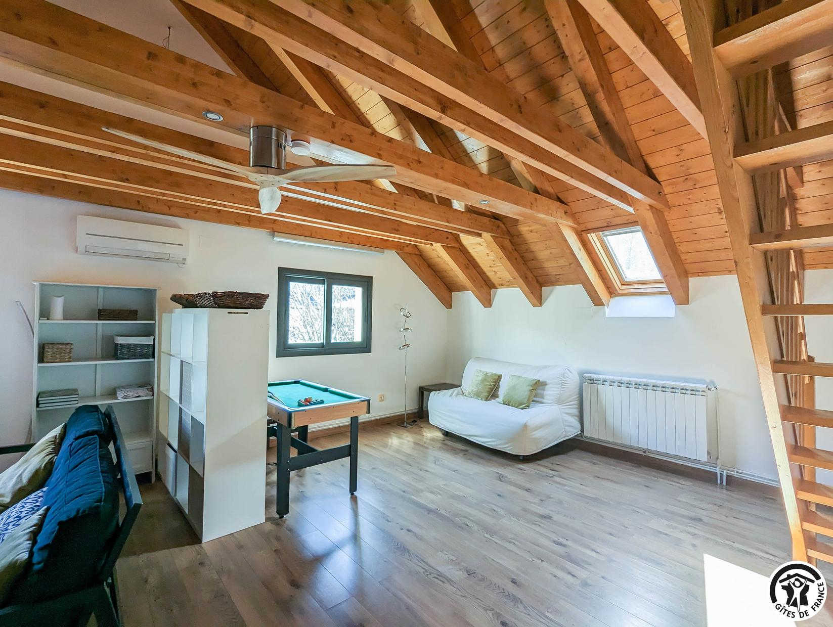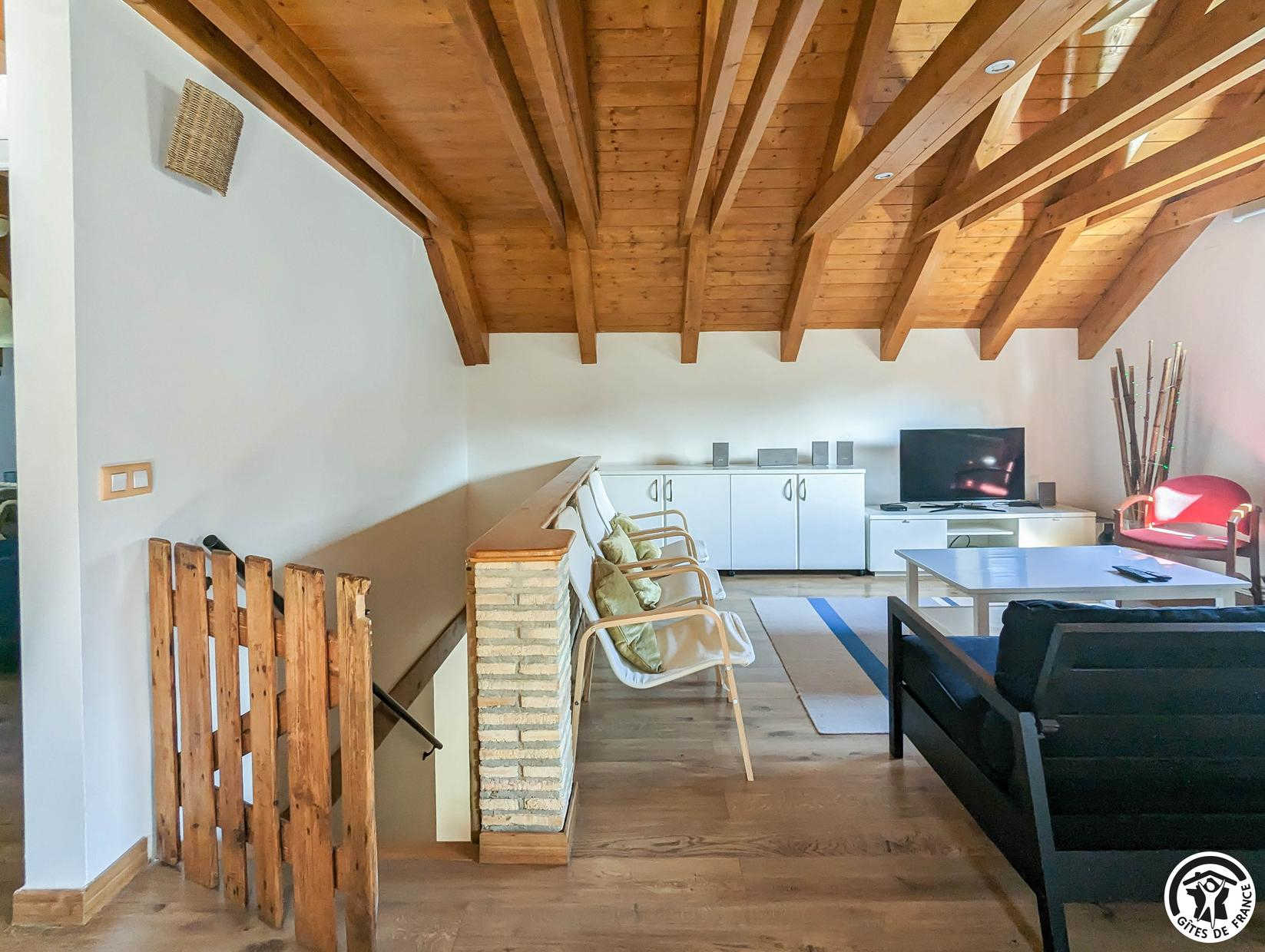 Planta baja: salón, cocina, cuarto de ducha con WC y dormitorio (1 x 160 cama individual), WC. 1ª planta: salón en el entresuelo con zona de dormitorio (1 sofá cama doble de 140 cm), 2 dormitorios (cada uno con 1 cama doble de 140 cm), cuarto de ducha con WC. 2ª planta: pequeña habitación abuhardillada (1 cama doble 140 cm + 1 cama individual 90 cm). Puede utilizarse como cama supletoria. Calefacción eléctrica en cada habitación. Estufa de pellets en el salón. Aire acondicionado reversible en planta baja y 1er piso.