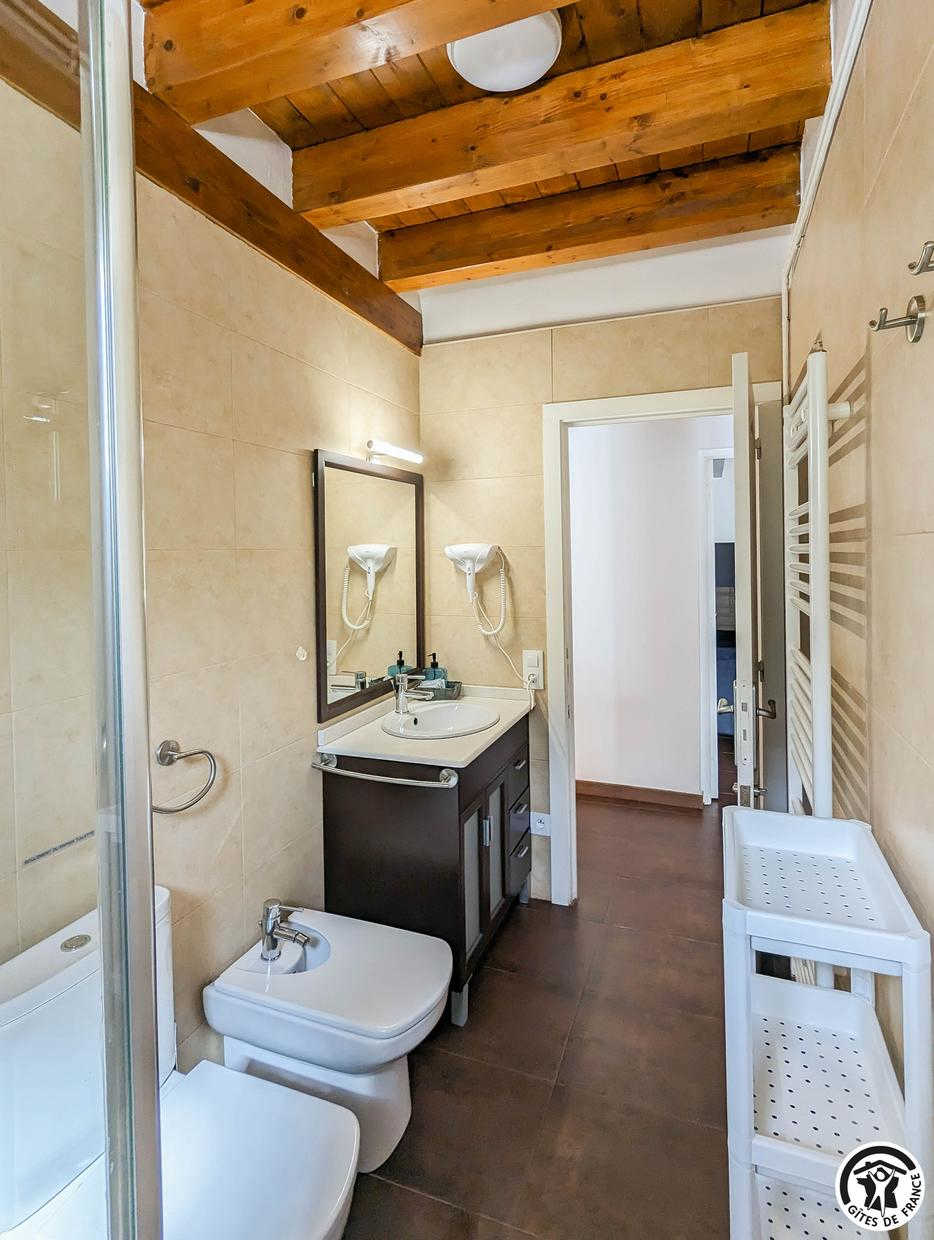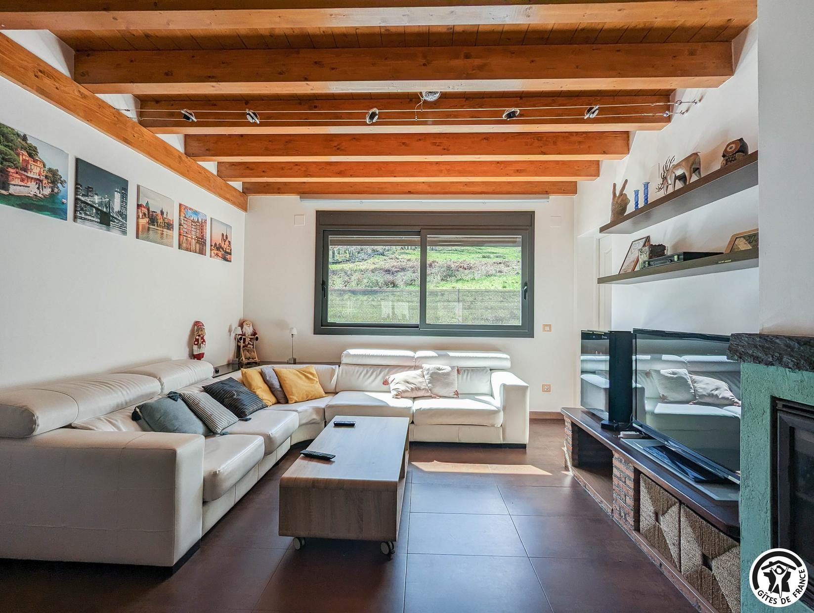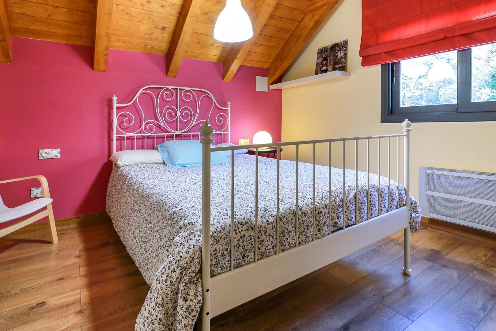 Planta baja: salón, cocina, cuarto de ducha con WC y dormitorio (1 x 160 cama individual), WC. 1ª planta: salón en el entresuelo con zona de dormitorio (1 sofá cama doble de 140 cm), 2 dormitorios (cada uno con 1 cama doble de 140 cm), cuarto de ducha con WC. 2ª planta: pequeña habitación abuhardillada (1 cama doble 140 cm + 1 cama individual 90 cm). Puede utilizarse como cama supletoria. Calefacción eléctrica en cada habitación. Estufa de pellets en el salón. Aire acondicionado reversible en planta baja y 1er piso.