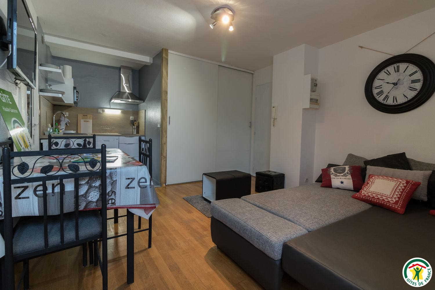 Piso de 28m2: entrada, pequeño salón con zona de cocina (microondas combinado, pequeño frigorífico-congelador, 2 placas de inducción, lavavajillas, lavadora de 4kg), zona de comedor (1 mesa y 4 sillas) y zona de salón (sofá cama para 2 personas 145*190cm, mesa de centro y TV de pantalla plana). 1 habitación (1 cama doble 140*190cm), cuarto de baño con bañera, lavabo y WC. Calefacción eléctrica. Aparcamiento público al pie del piso. Paquete balneario de 3 semanas a 580€. Información sobre los eventos de Pyrénées 31 en: https://www.pyrenees31.com/.