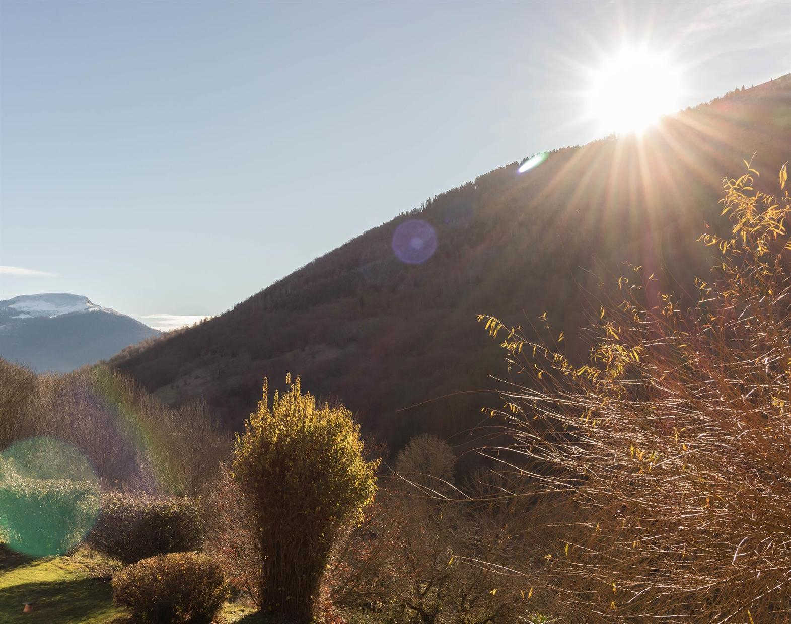 Luminoso estudio orientado al sur con pequeña terraza y espectaculares vistas a la montaña. Sólo para sus ojos y oídos, ¡bramidos de ciervos y venados por la mañana!