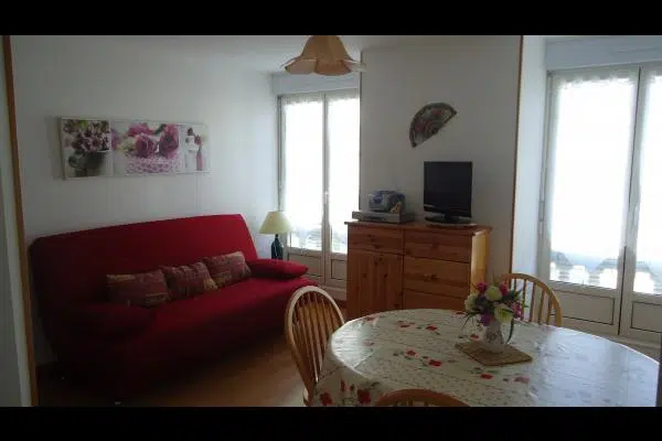 L’appartement se compose d’une kitchenette intégrée équipée, séjour avec espace repas et un canapé convertible en 140 de type Clic-Clac, chambre avec un lit en 140, salle de bain, WC indépendant, cellier.