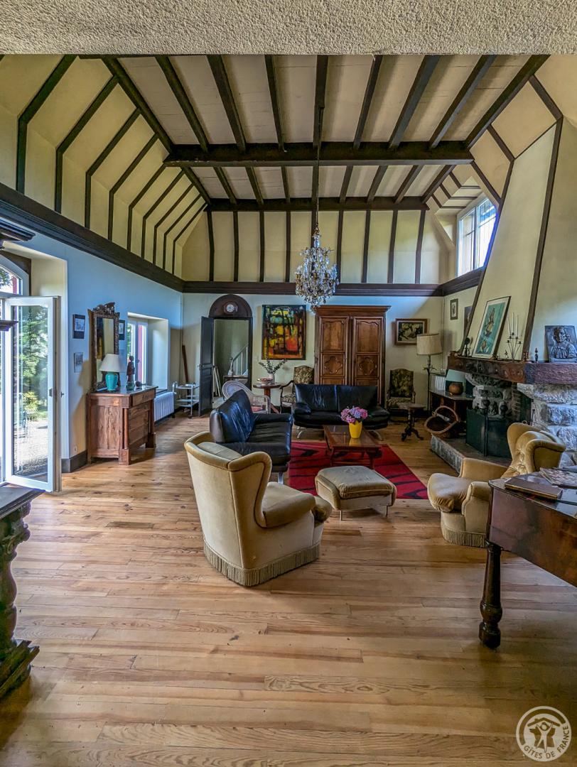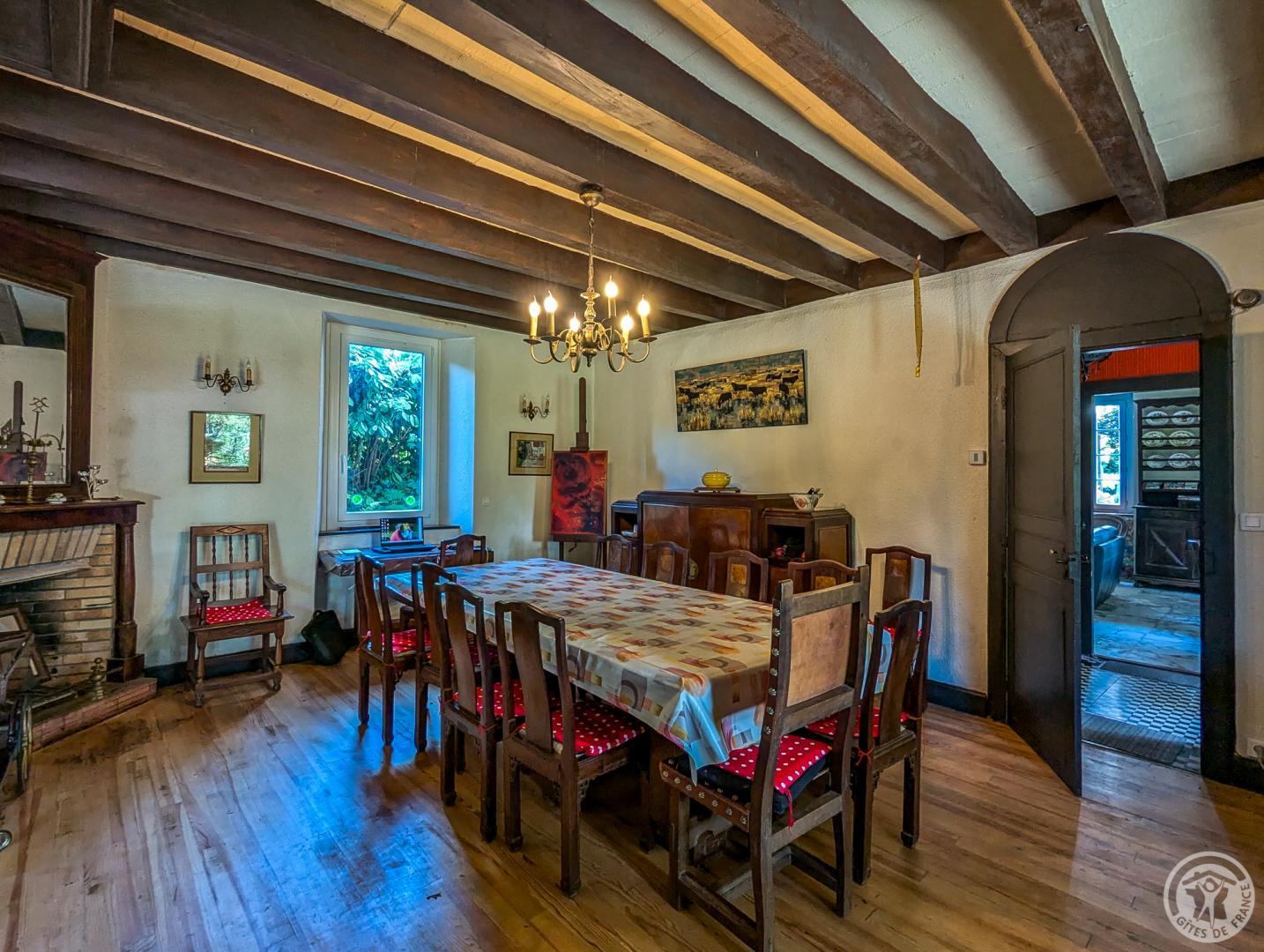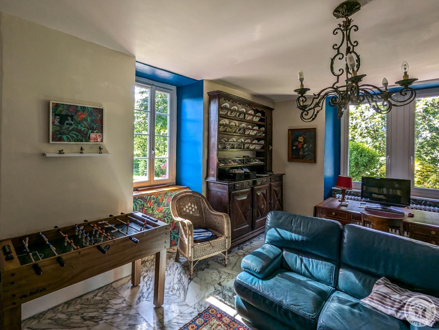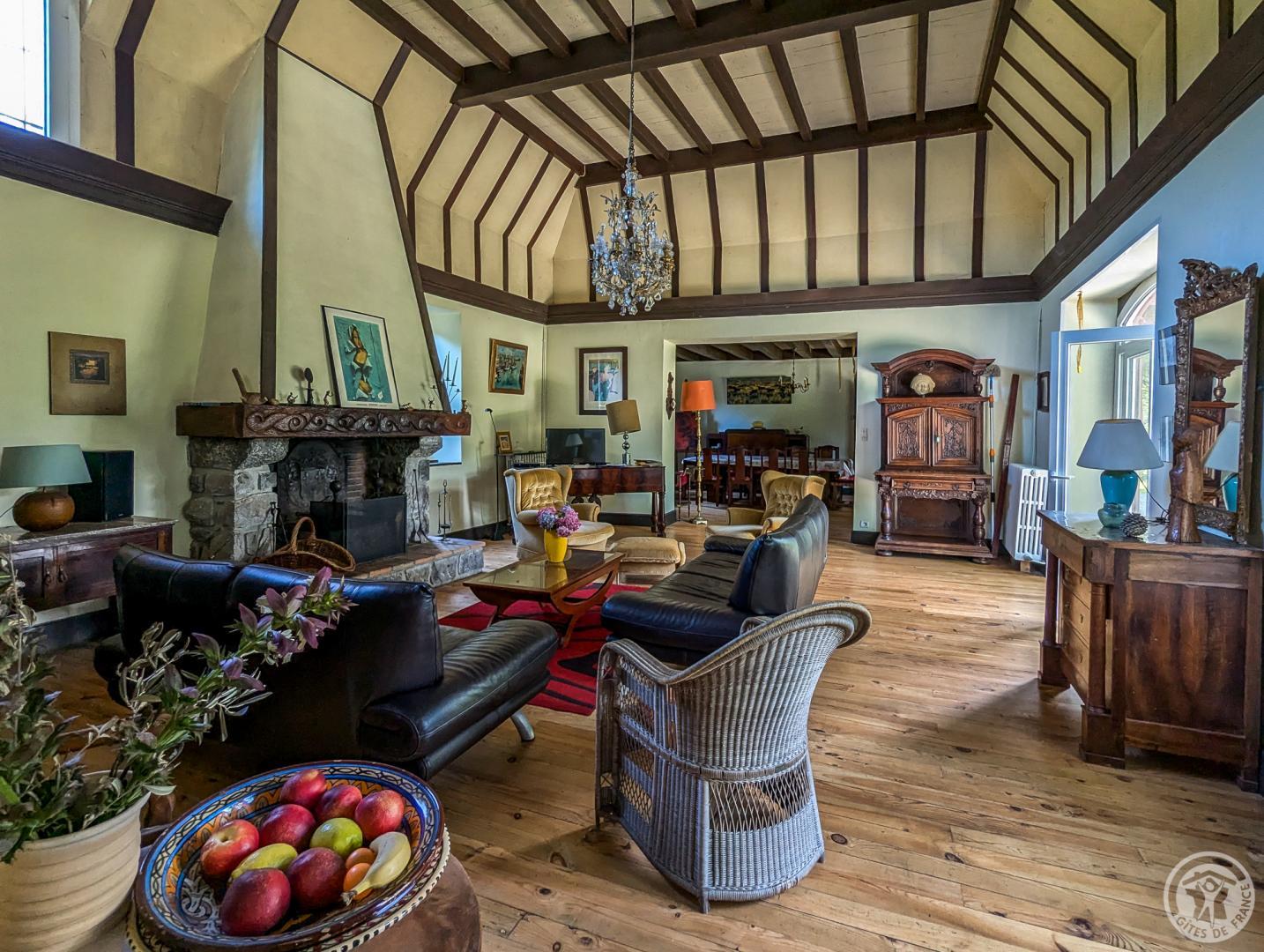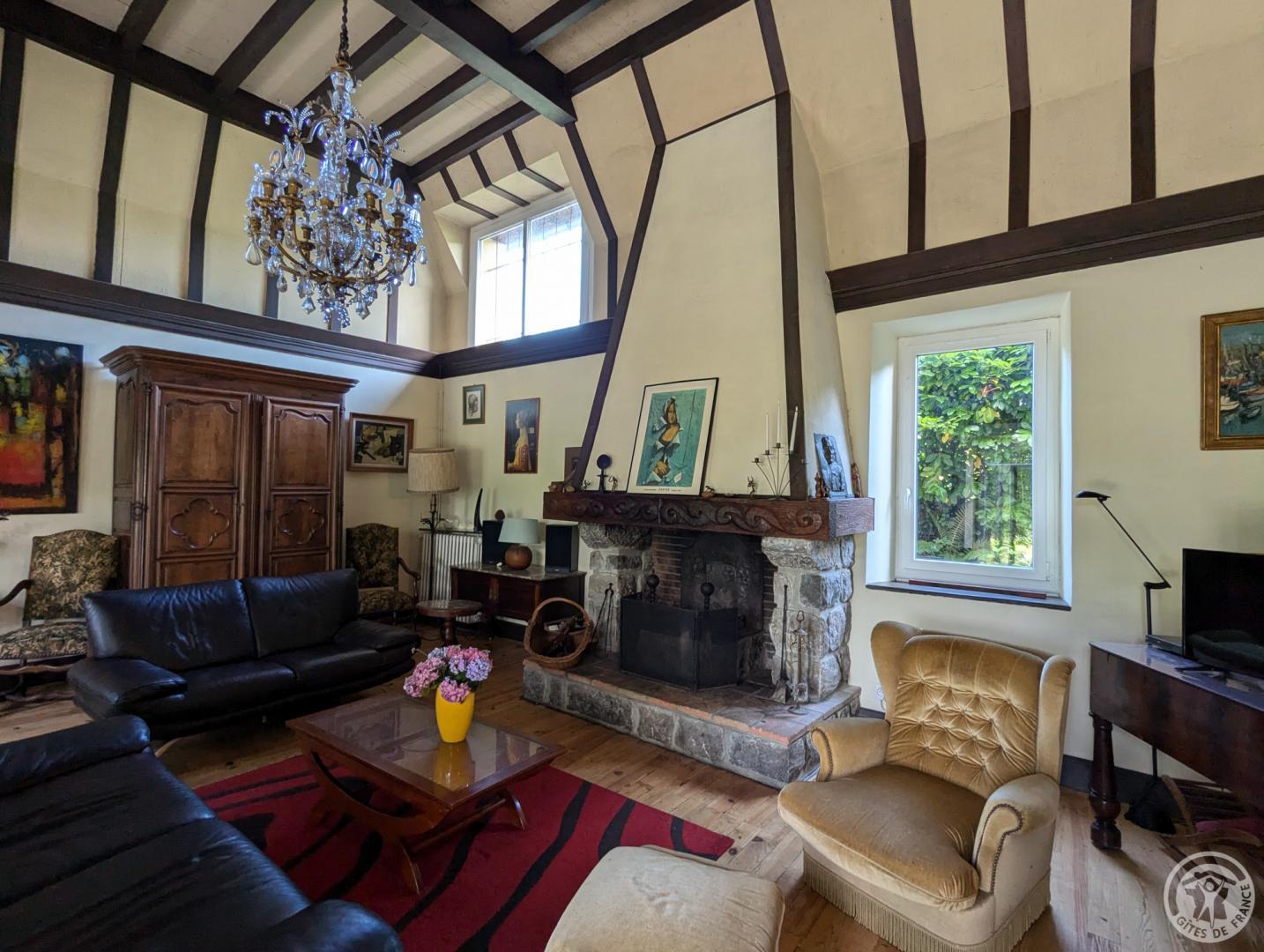 – au rez-de-chaussée : hall d’entrée, cuisine, grand séjour(80m2, avec cheminée), chambre/bureau Jean (canapé convertible en 140cm, grand bureau, chaine hifi et TV), WC.