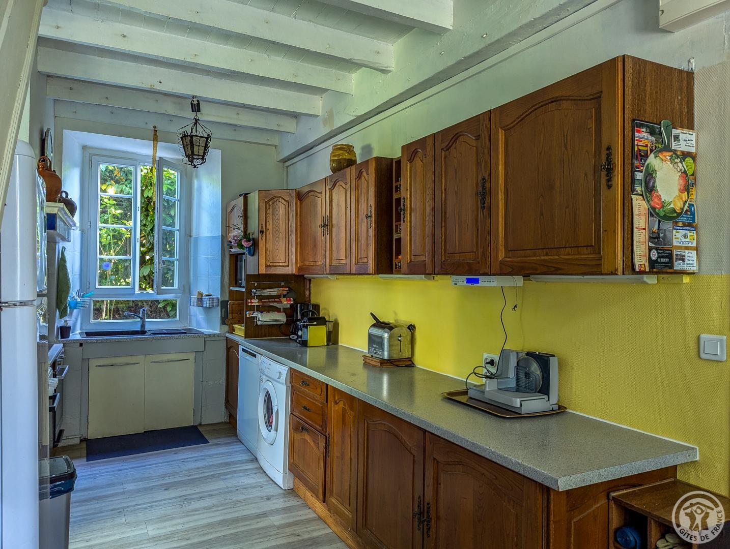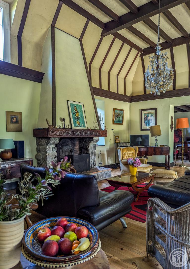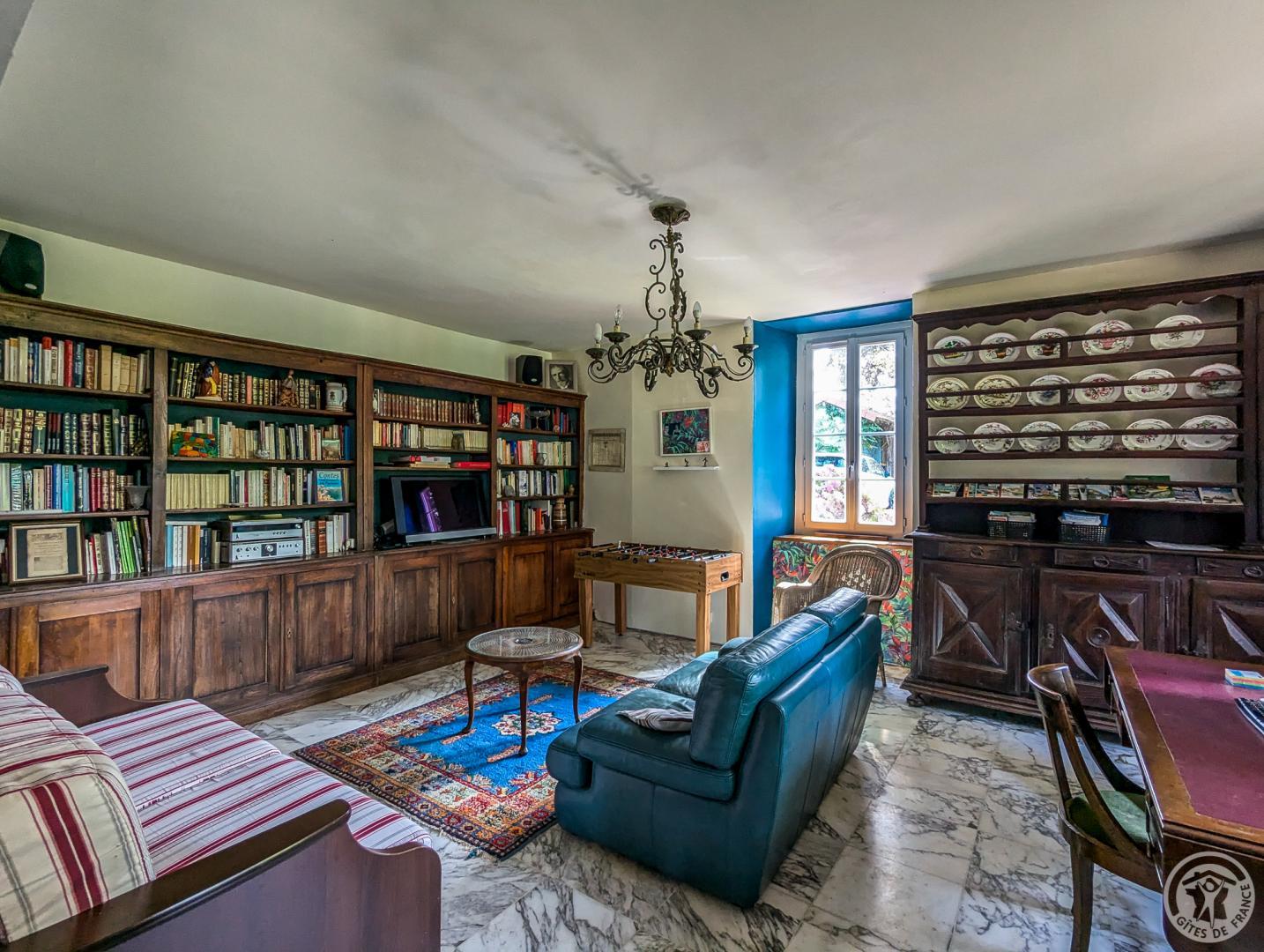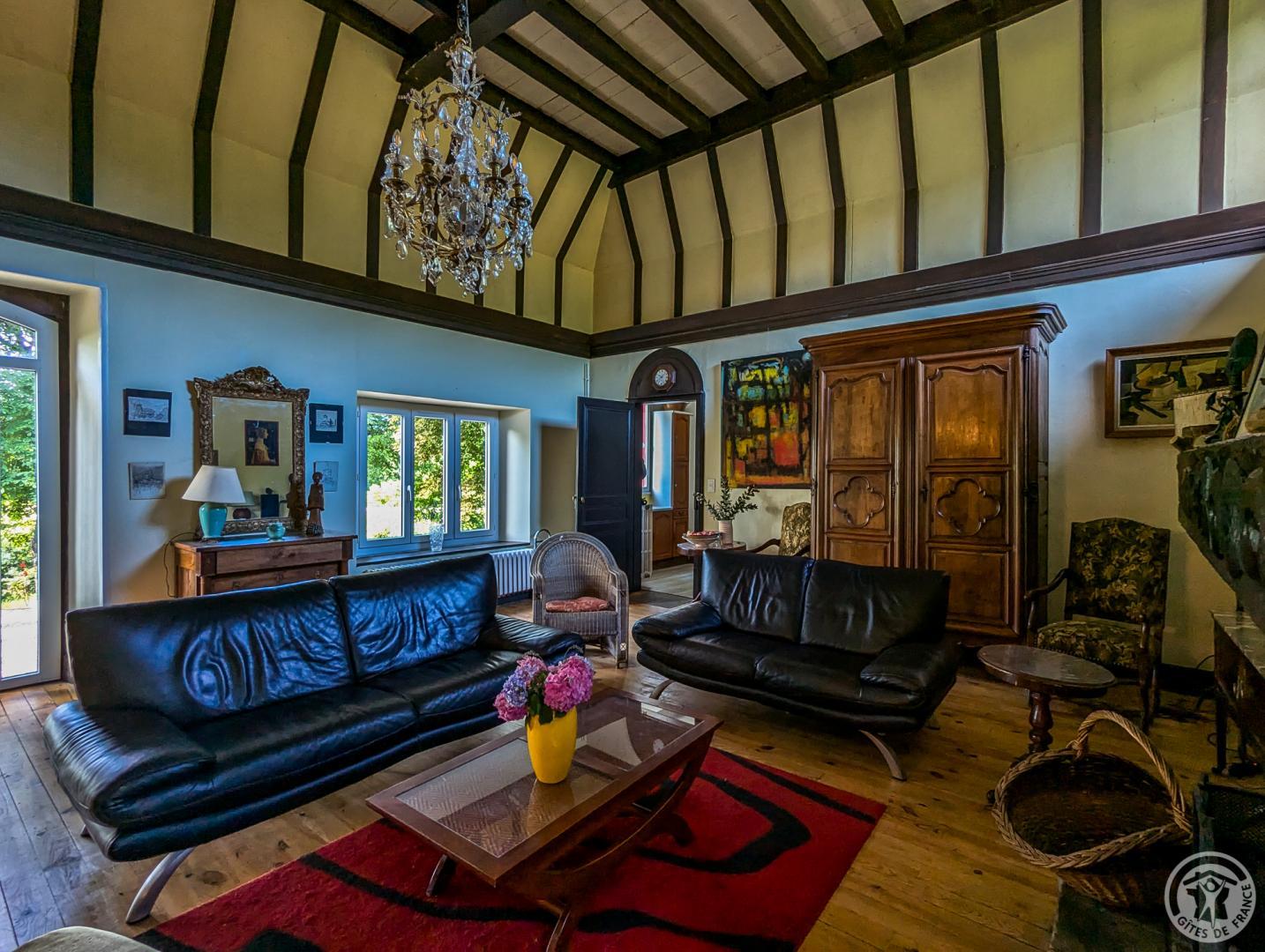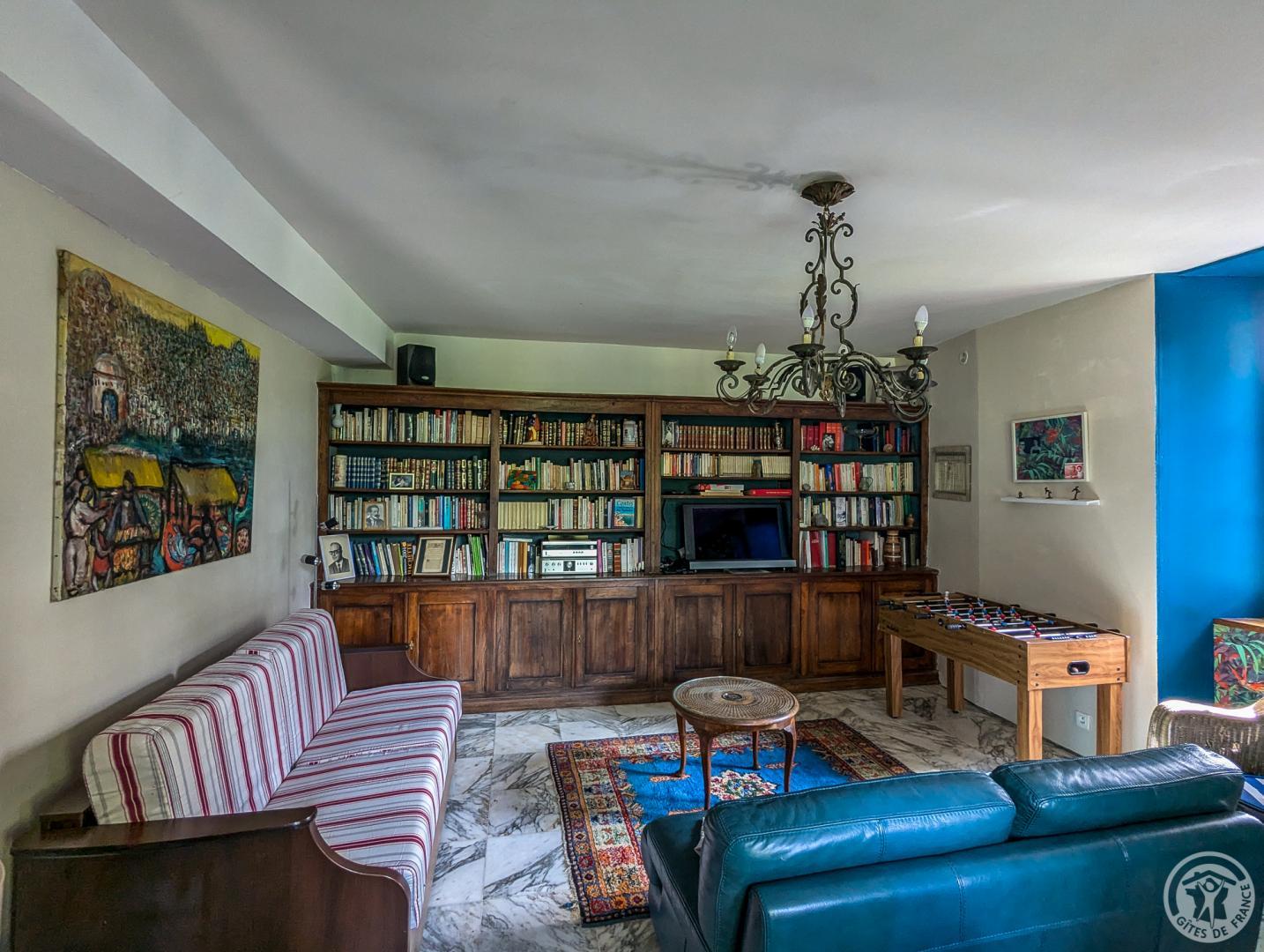 – au rez-de-chaussée : hall d’entrée, cuisine, grand séjour(80m2, avec cheminée), chambre/bureau Jean (canapé convertible en 140cm, grand bureau, chaine hifi et TV), WC.