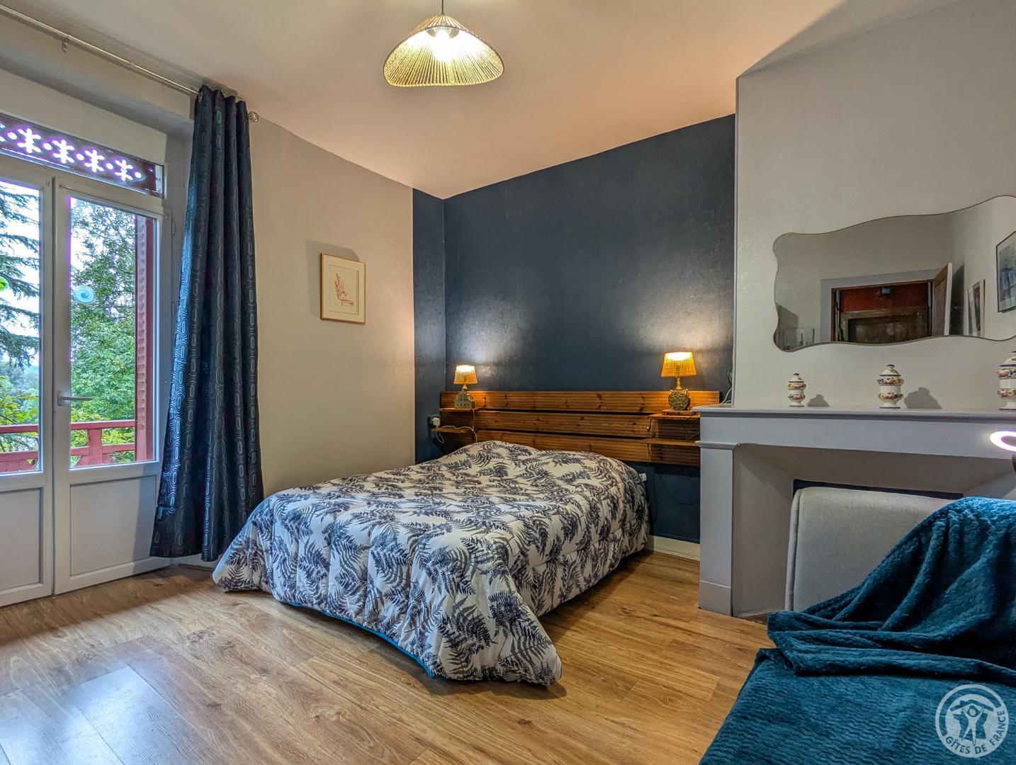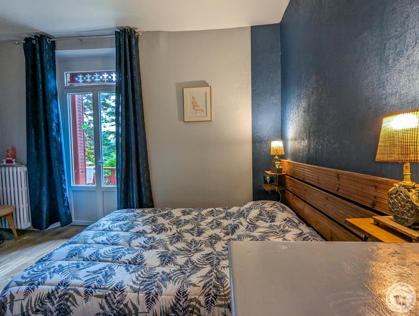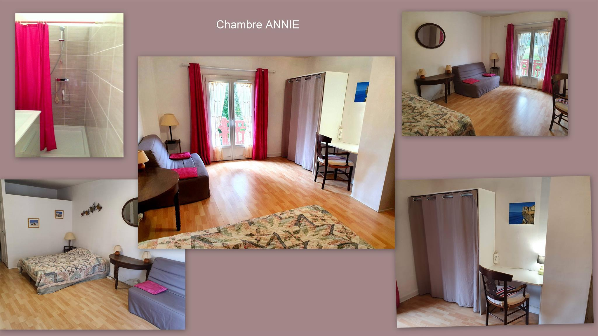 – au 1er étage : chambre Mireille et Jean (1 lit 2 personnes en 140cm + convertible en 140cm + dressing + salle d’eau, chambre Monique (1 lit 2 personnes en 140cm), chambre Claude (1 lit 2 personnes en 140cm + 1 lit méridienne en 80cm), salle de bains. 1/2 palier supérieur : chambre Annie (1 lit 2 personnes en 140cm + 1 canapé convertible 140cm + salle d’eau + balcon).