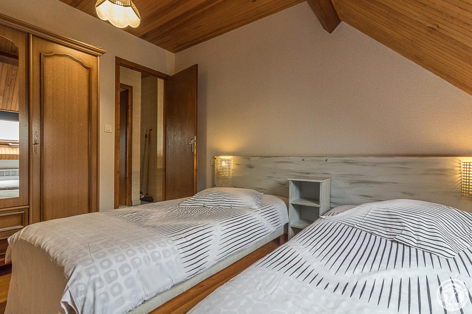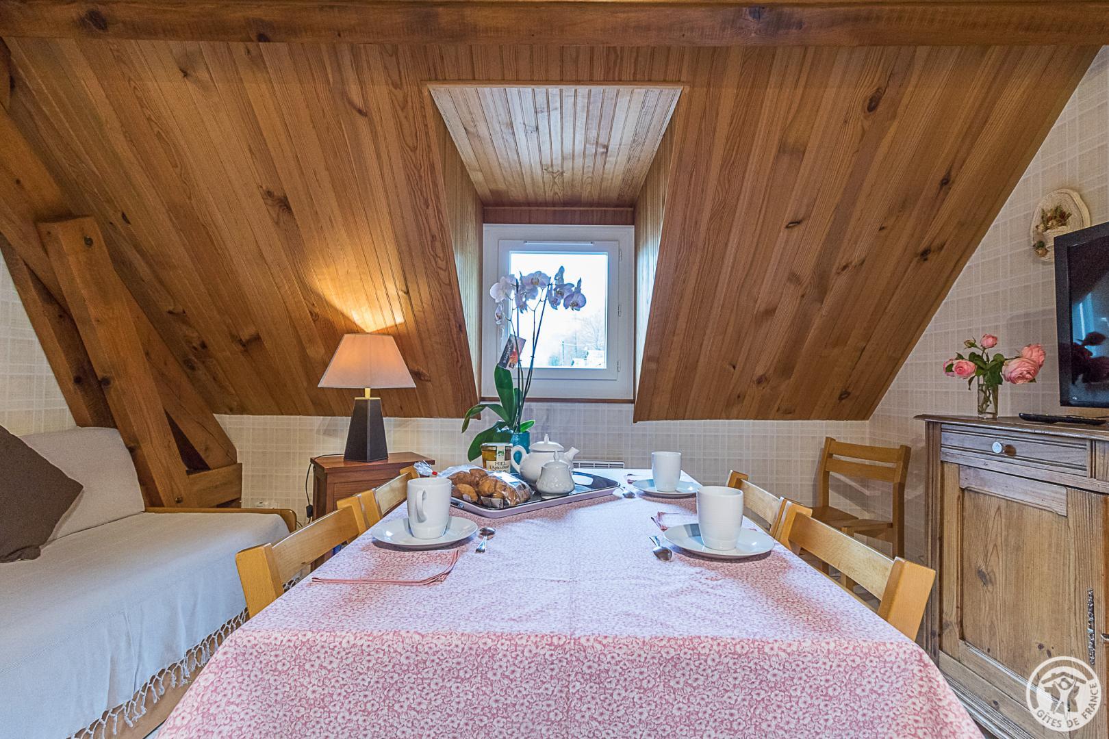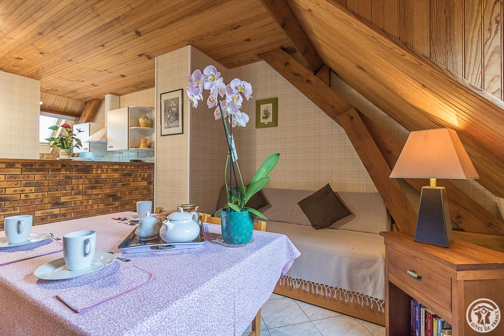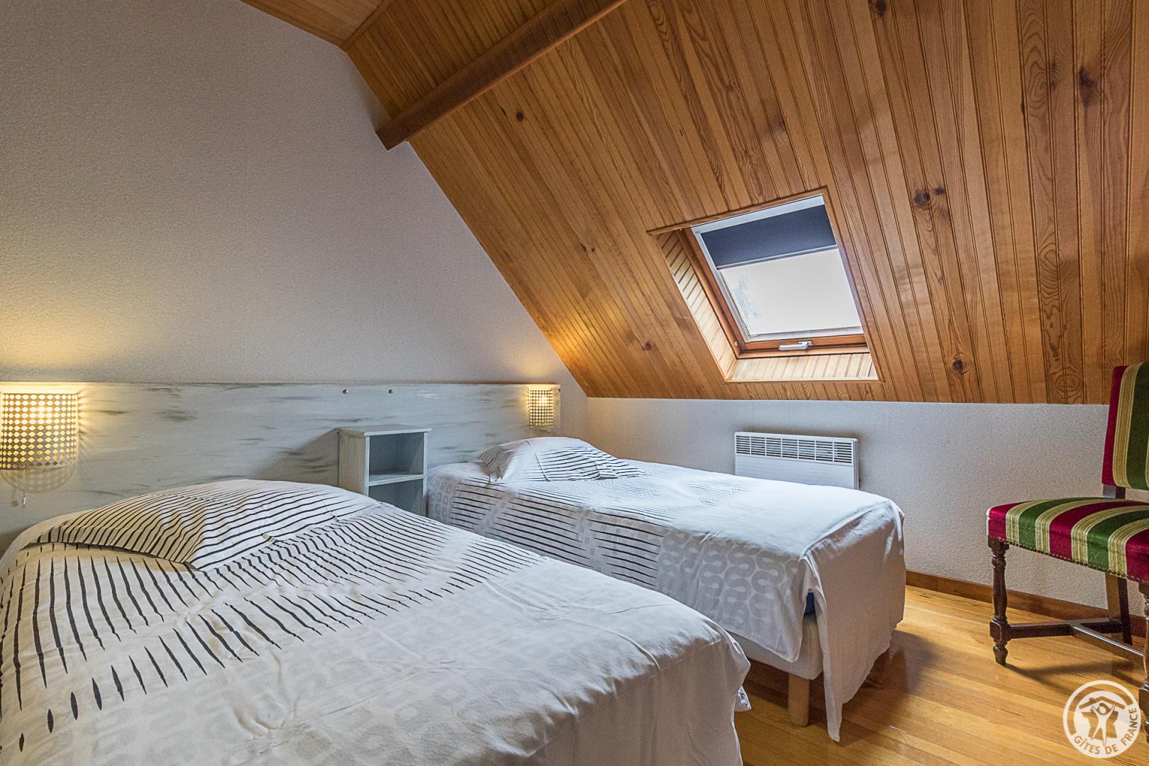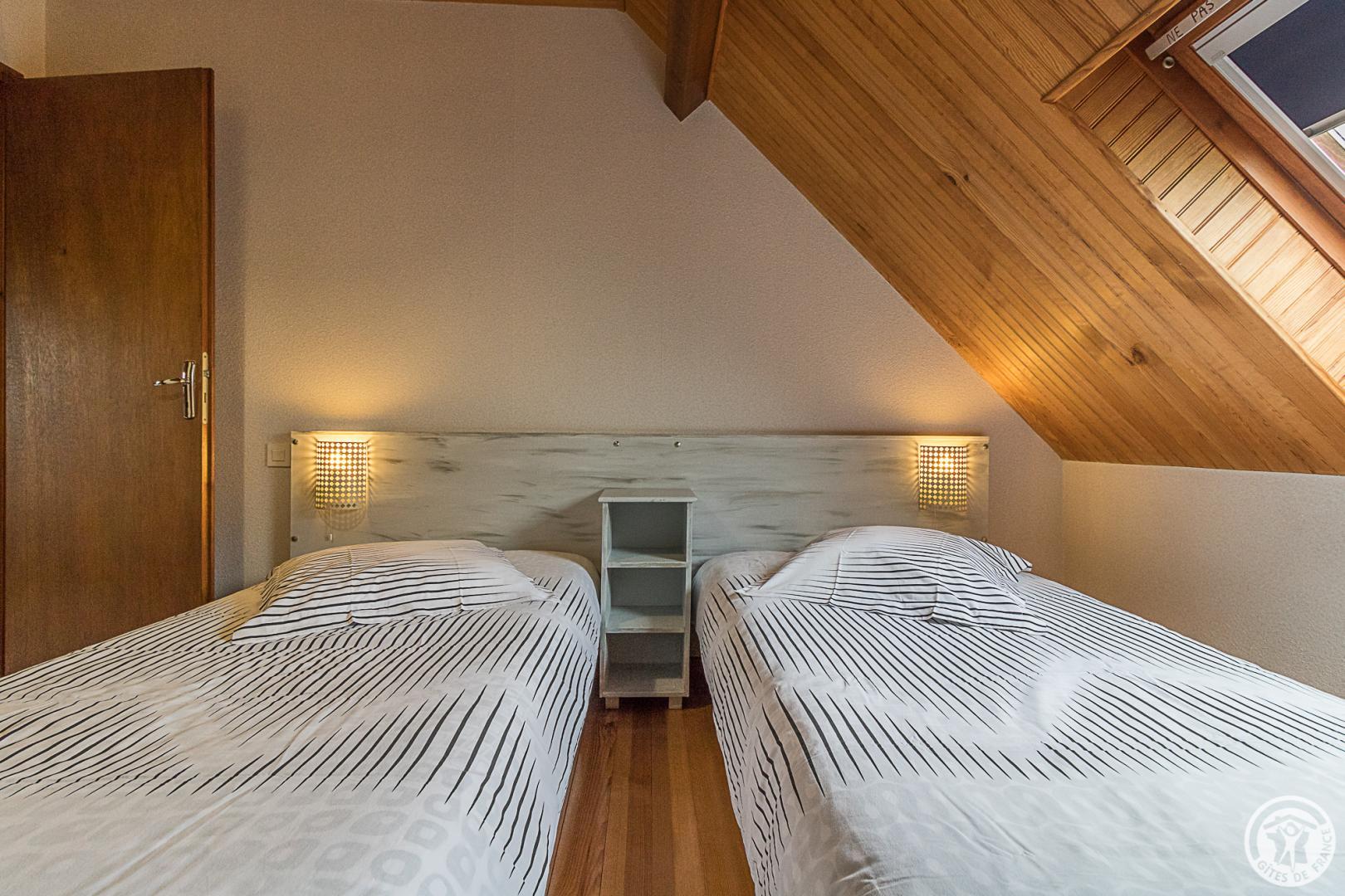 Un escalier extérieur conduit à l’appartement sous combles. La porte ouvre sur la salle de séjour séparée de la cuisine par un bar. Un couloir dessert 2 chambres offrant pour l’une un lit pour 2 personnes en 140cm, pour l’autre 2 lits pour 1 personne en 90cm. La salle de bains/WC se trouve côté cuisine. Chauffage électrique. Connexion Internet Wifi. Matériel bébé à la demande (lit et chaise haute).