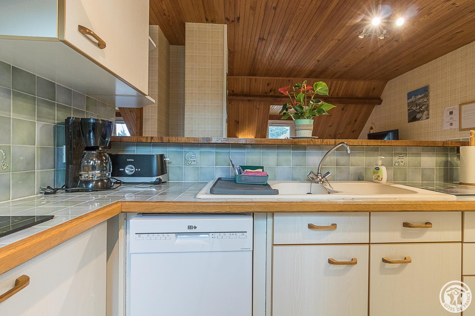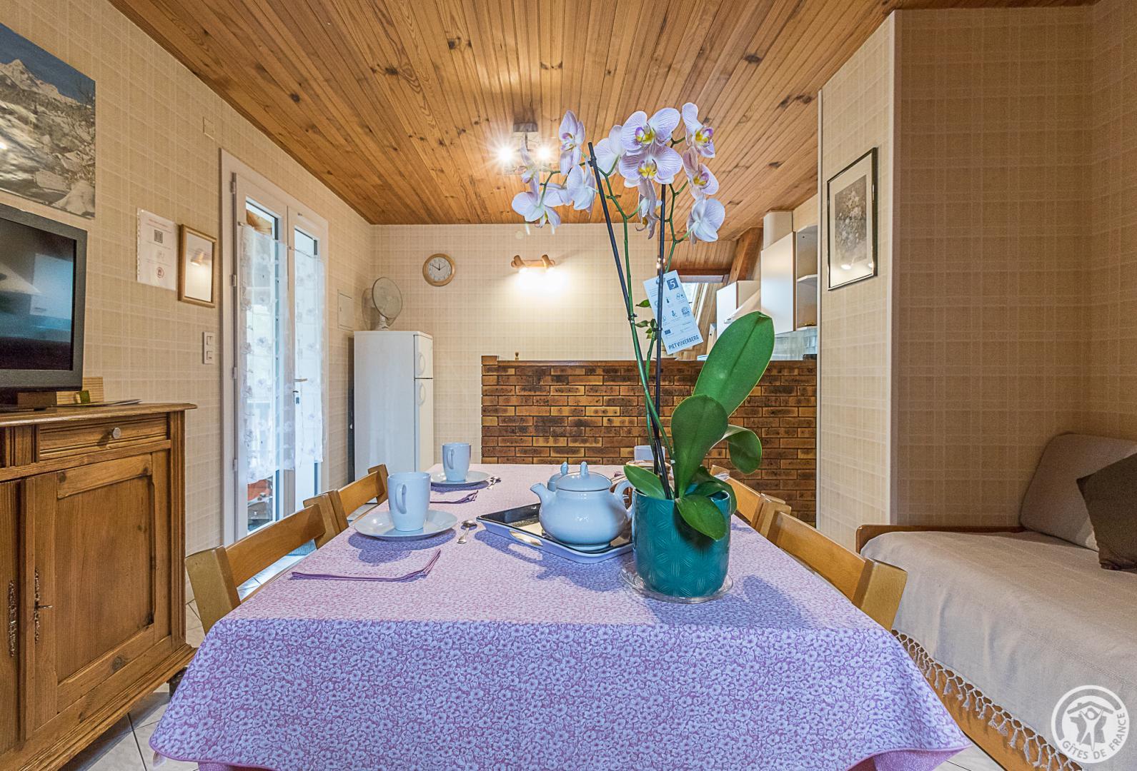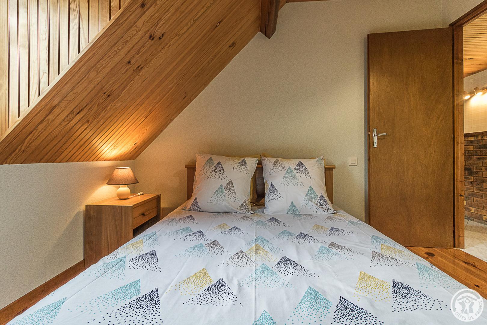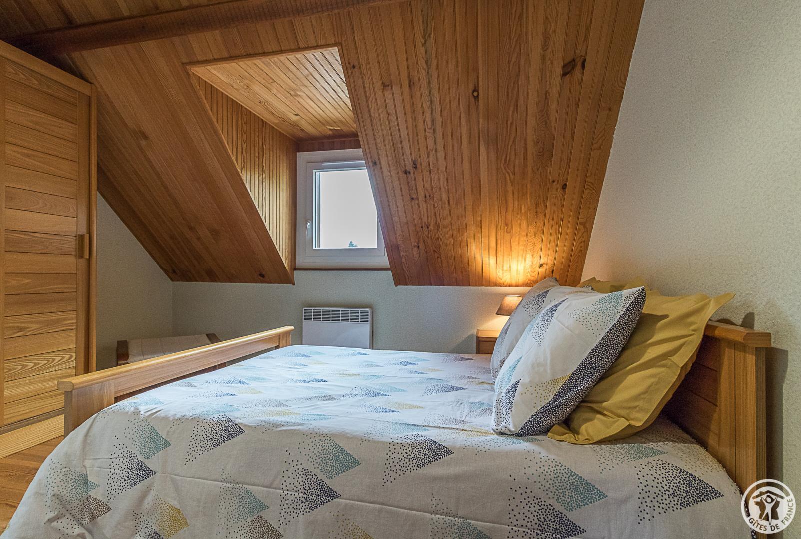 Un escalier extérieur conduit à l’appartement sous combles. La porte ouvre sur la salle de séjour séparée de la cuisine par un bar. Un couloir dessert 2 chambres offrant pour l’une un lit pour 2 personnes en 140cm, pour l’autre 2 lits pour 1 personne en 90cm. La salle de bains/WC se trouve côté cuisine. Chauffage électrique. Connexion Internet Wifi. Matériel bébé à la demande (lit et chaise haute).