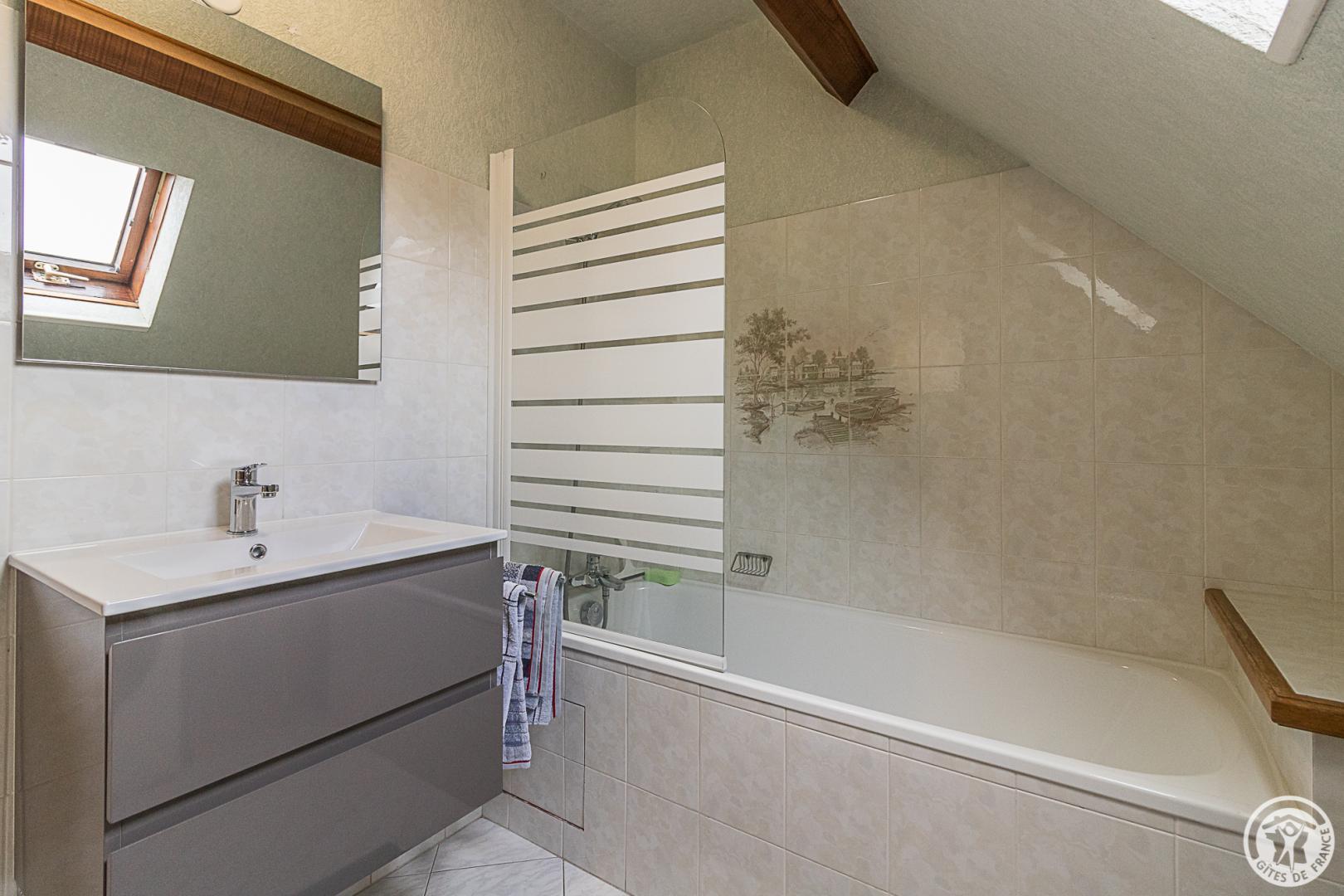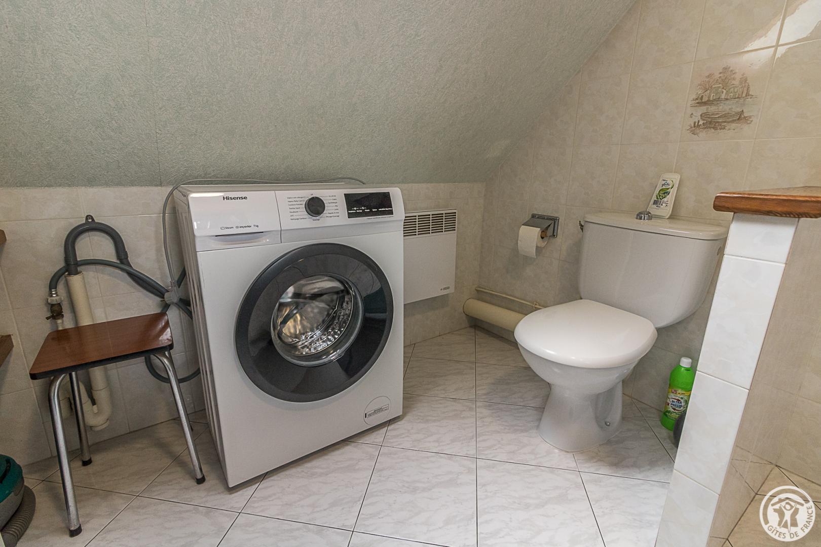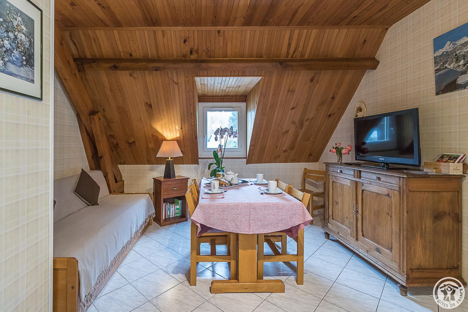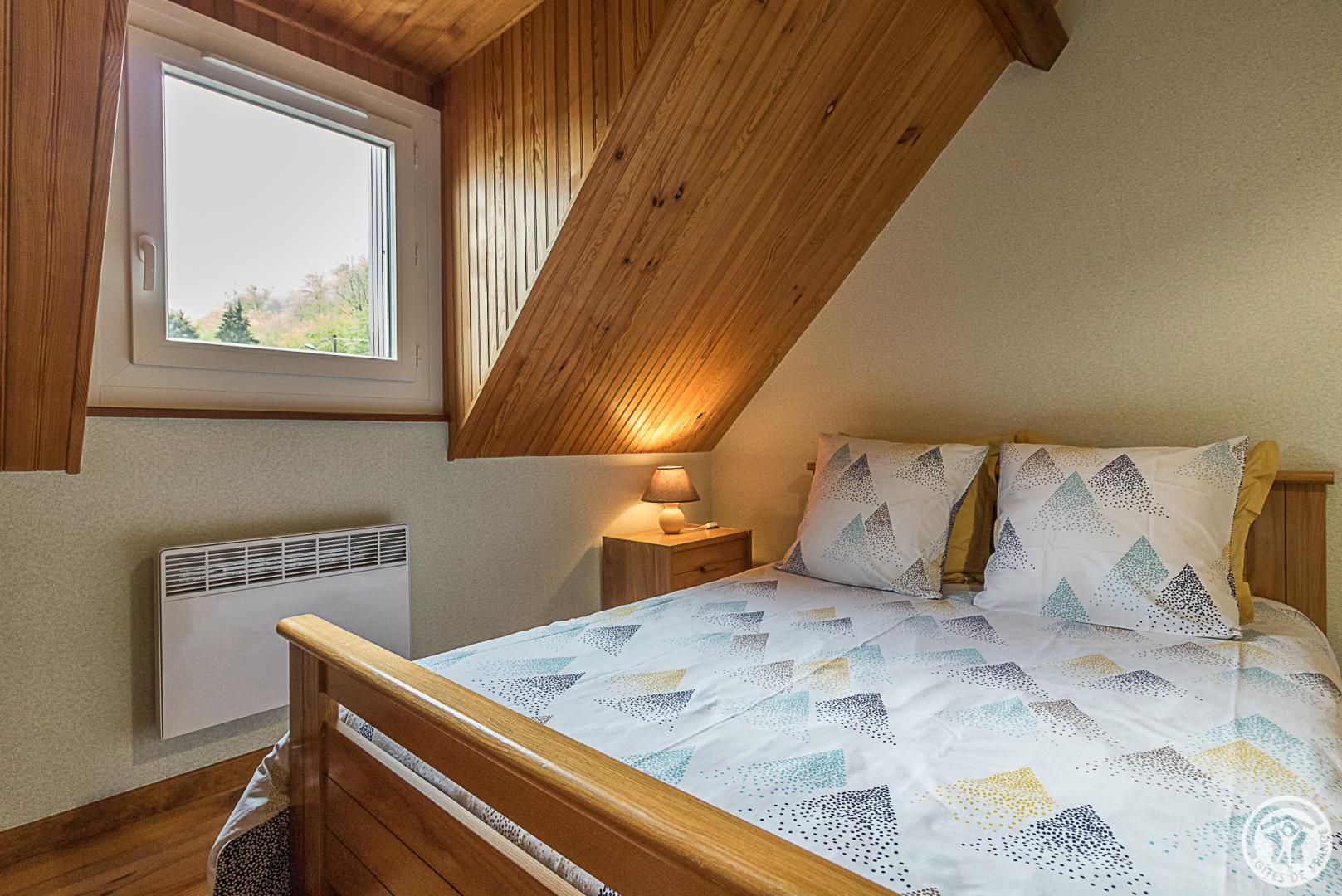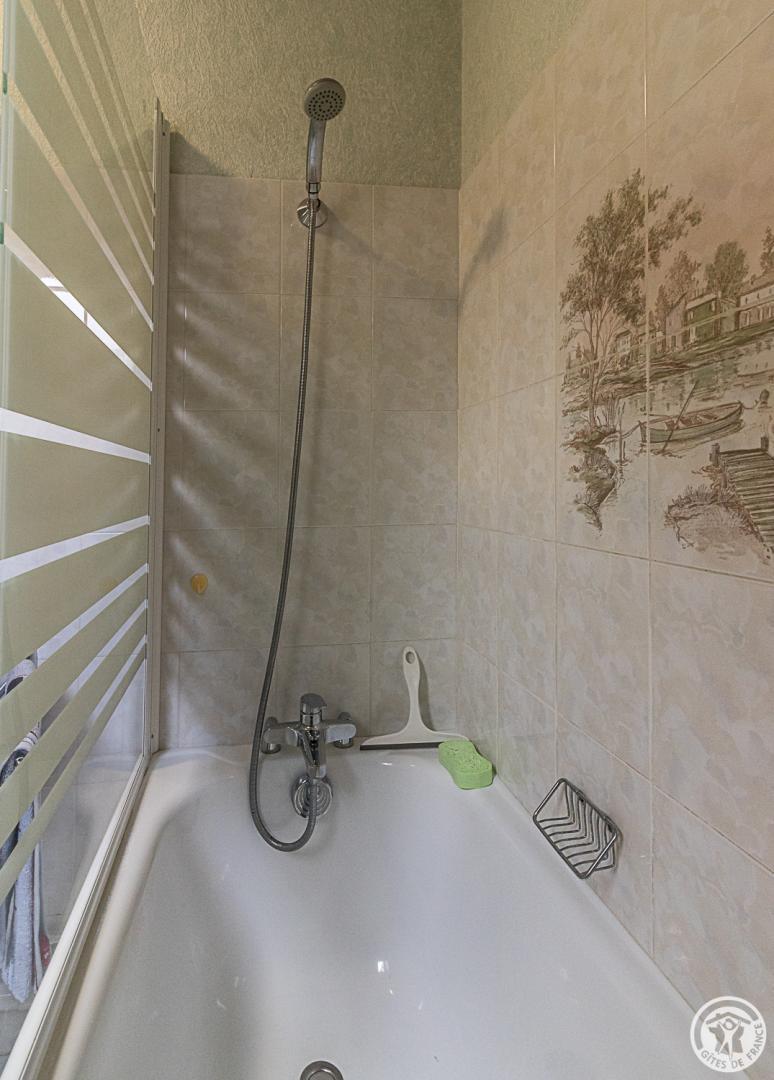 Un escalier extérieur conduit à l’appartement sous combles. La porte ouvre sur la salle de séjour séparée de la cuisine par un bar. Un couloir dessert 2 chambres offrant pour l’une un lit pour 2 personnes en 140cm, pour l’autre 2 lits pour 1 personne en 90cm. La salle de bains/WC se trouve côté cuisine. Chauffage électrique. Connexion Internet Wifi. Matériel bébé à la demande (lit et chaise haute).
