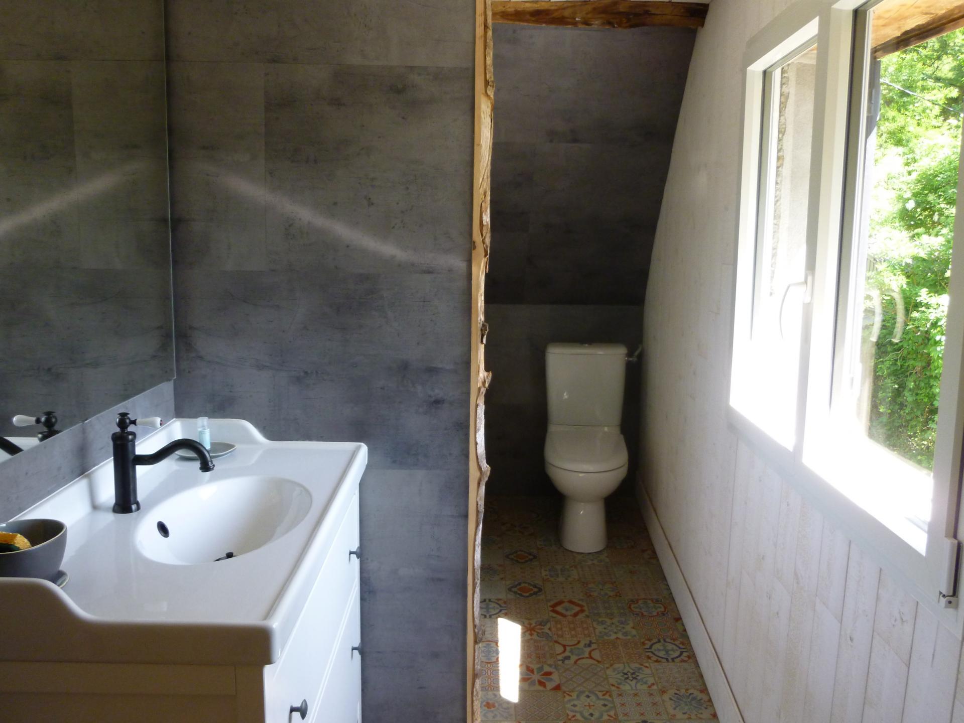 – Salle de bain avec baignoire et wc à l’étage et un wc au rez-de-chaussée.