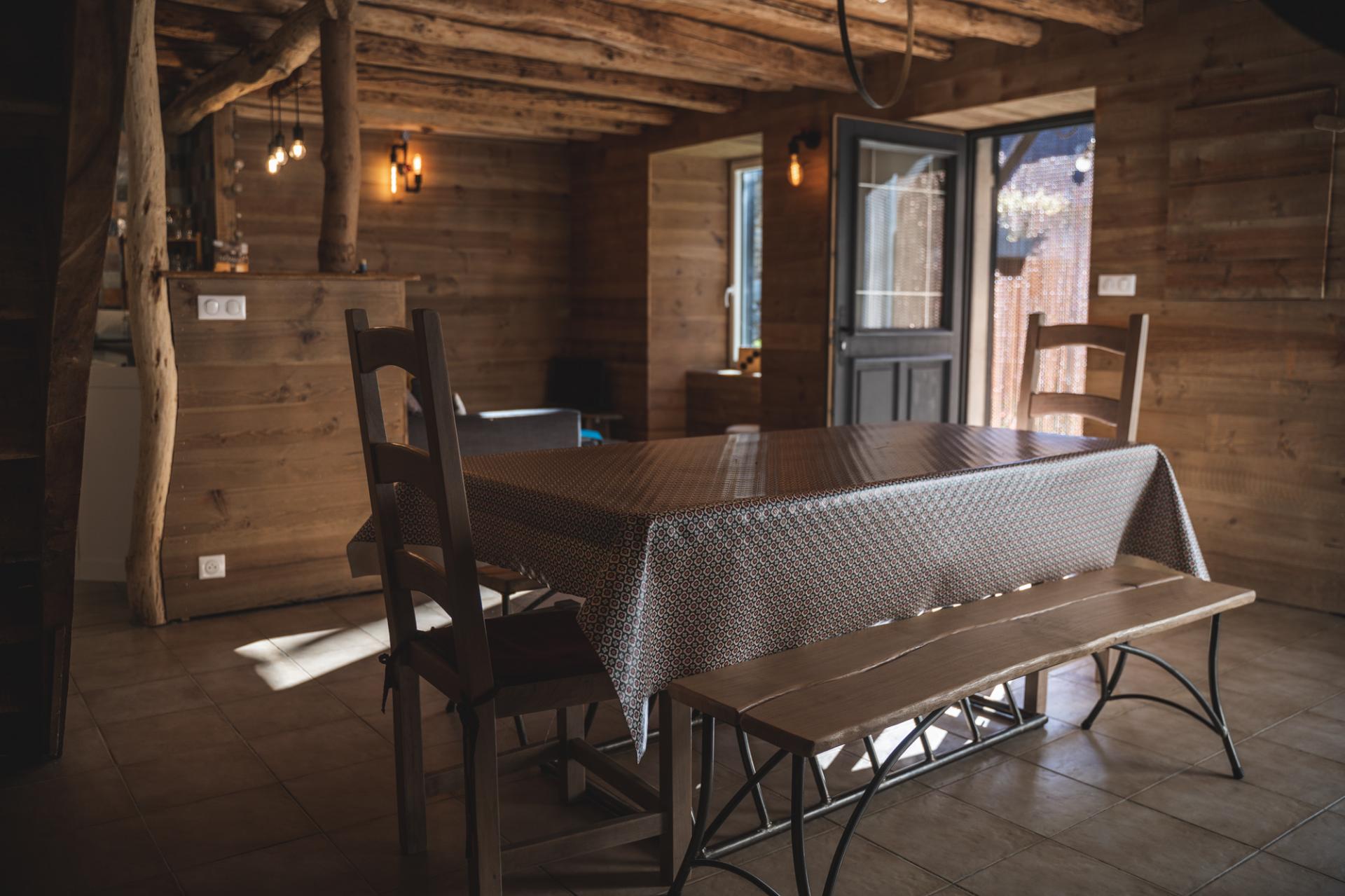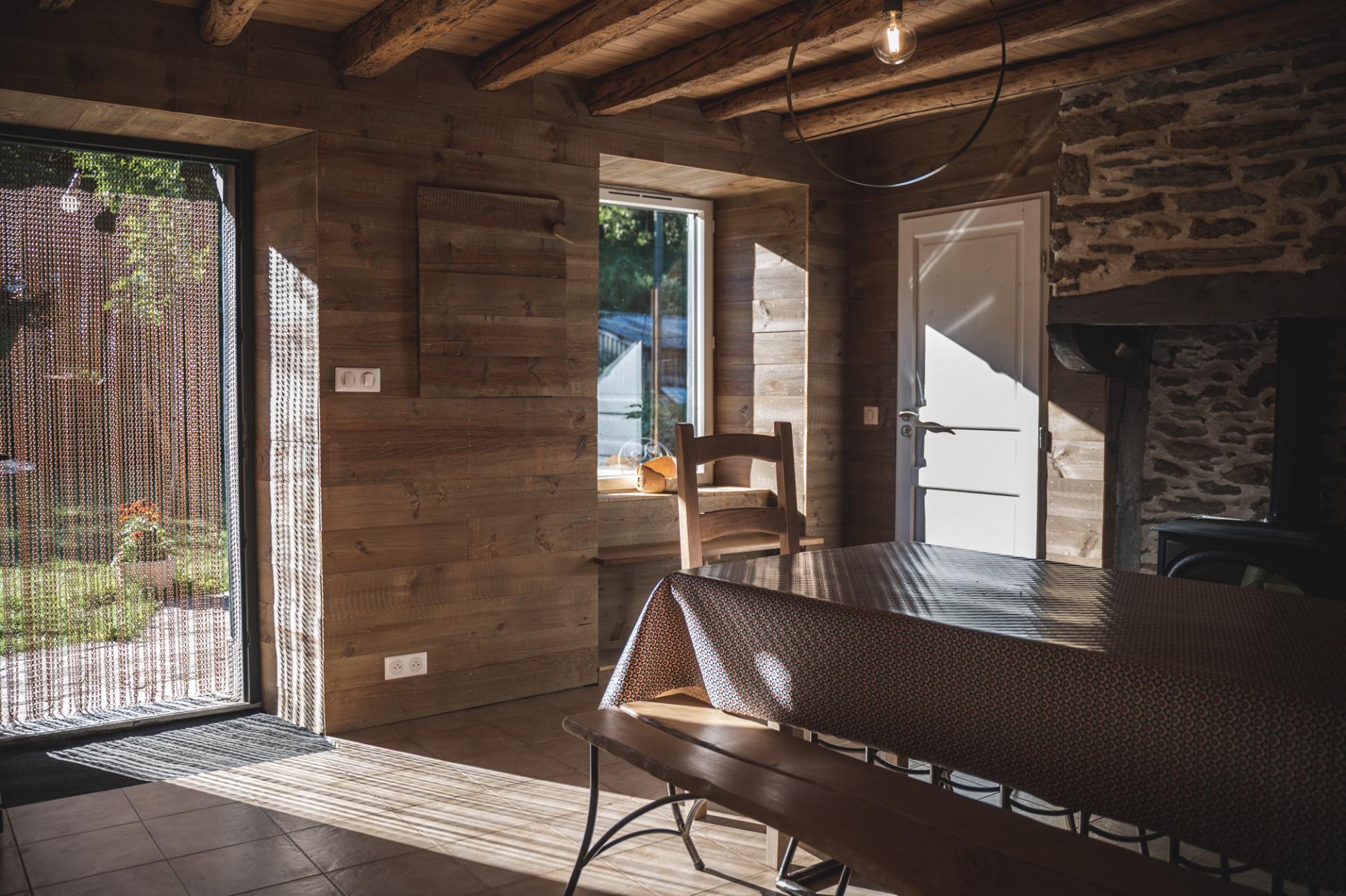 – Le salon chaleureux ouvert sur la cuisine et la salle à manger avec le poêle à bois.