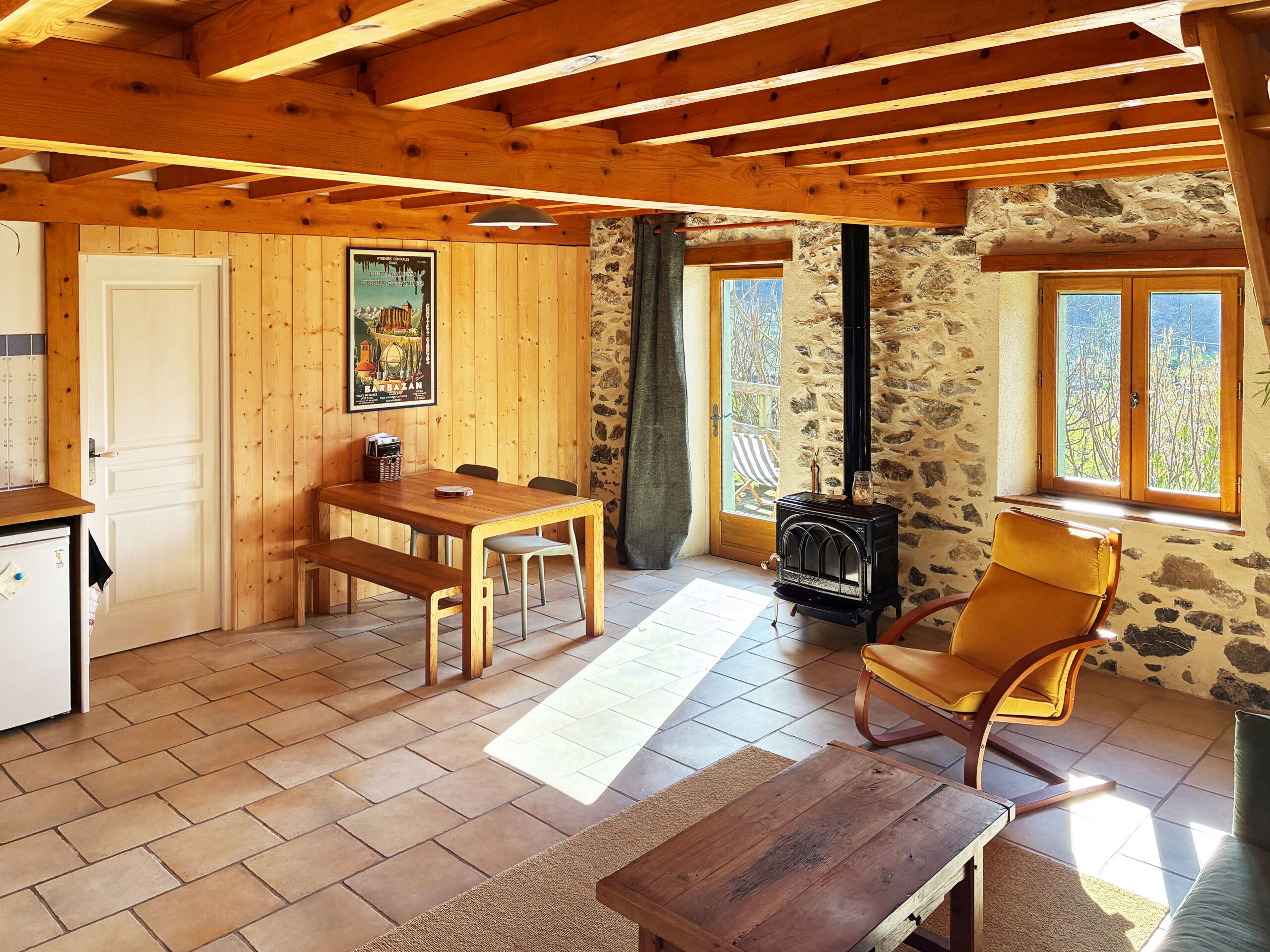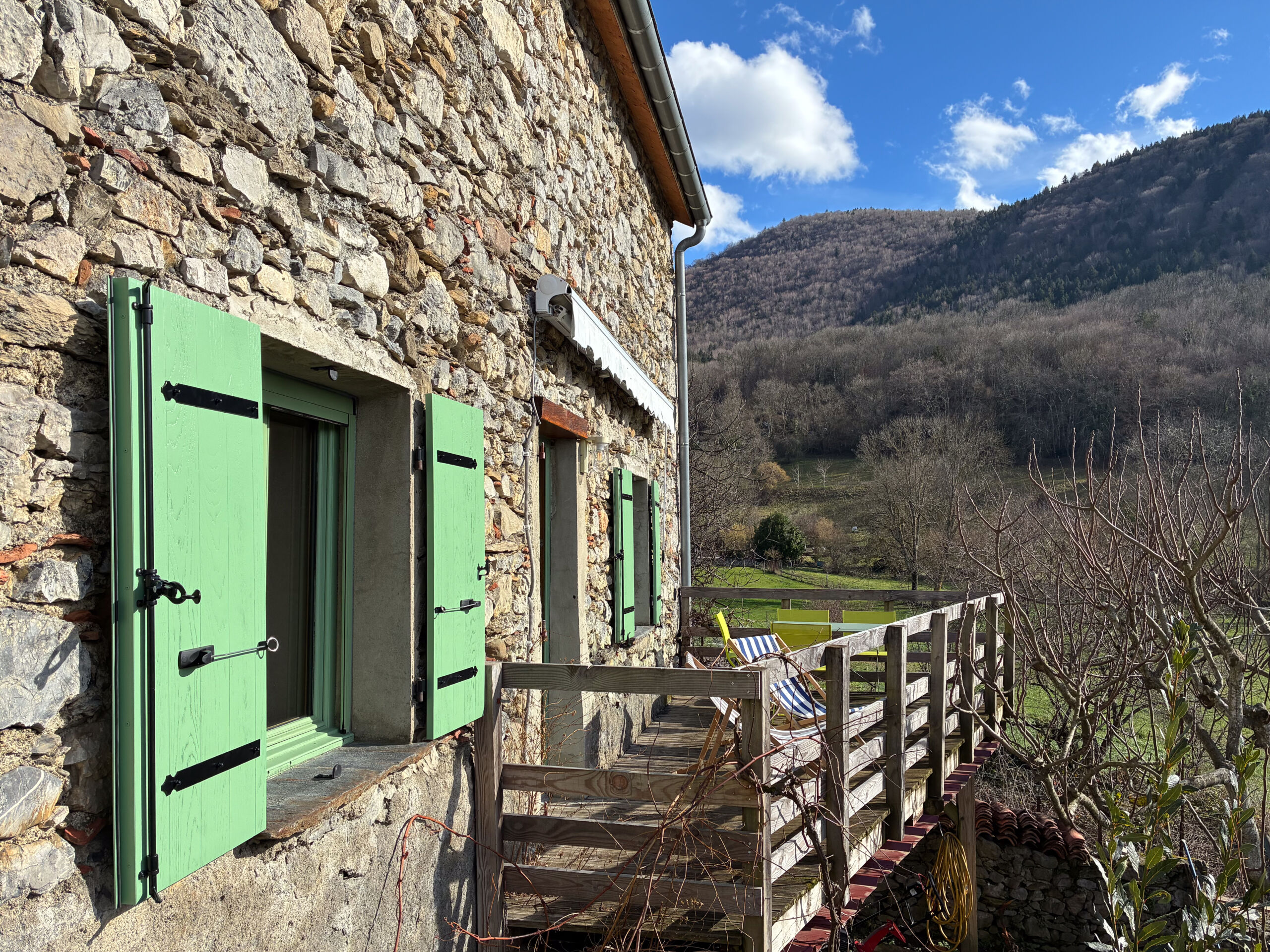 Terrasse côté Sud, vue sur les champs, vaches, chevaux et les montagnes de la Barousse. Aucun vis-à-vis.