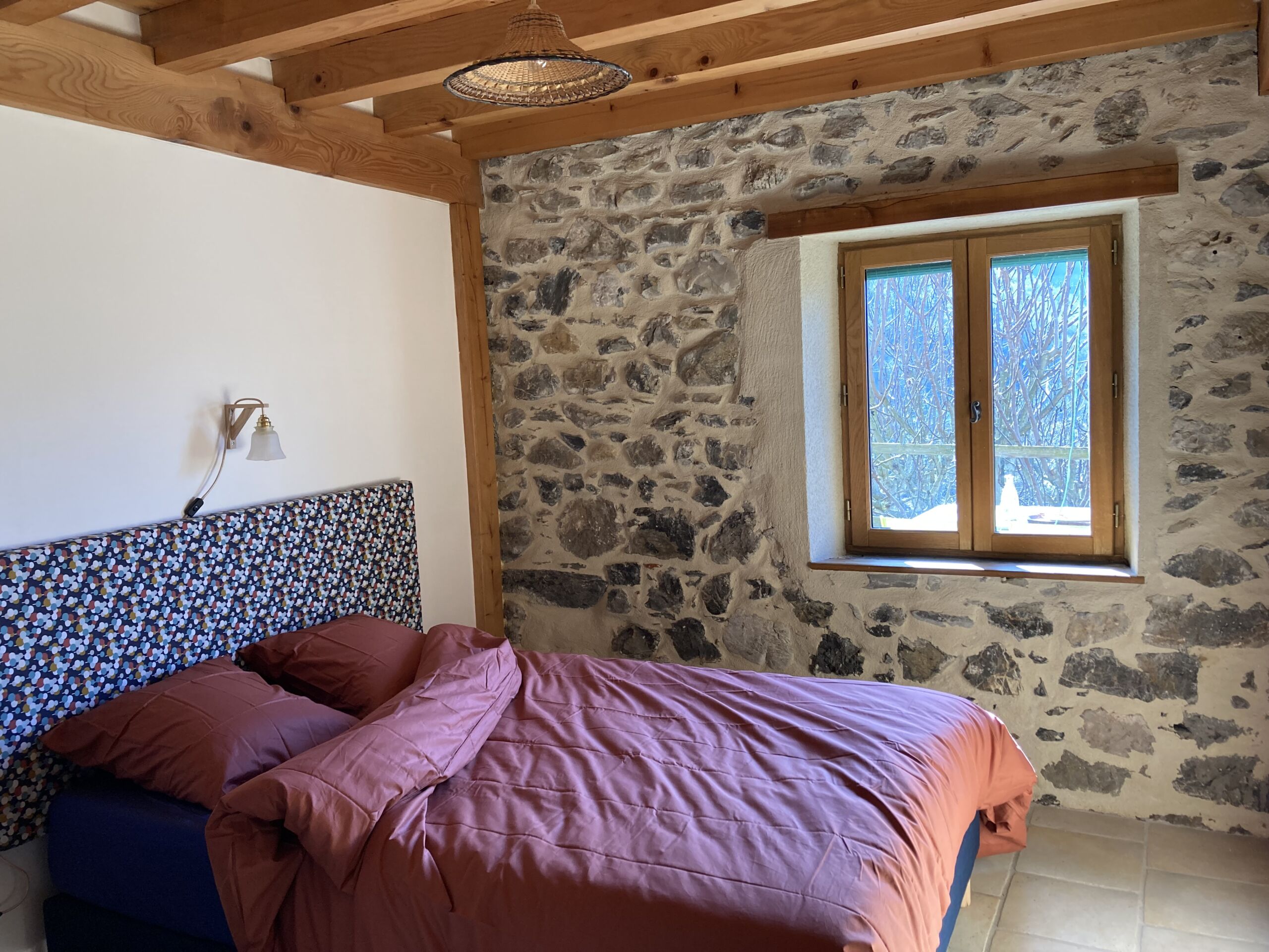 Chambre à coucher avec lit double en 140. Literie neuve Tediber, hyper confort ! Très au calme, isolé de la route, pas un bruit pour dormir comme un bébé! On entend juste la chouette et les p’tits oiseaux. Reste fraîche grâce aux murs en pierre épais.