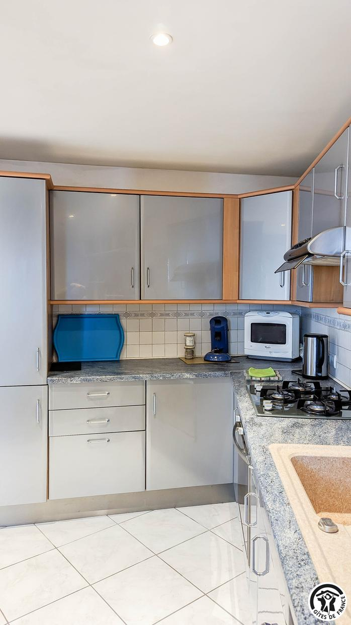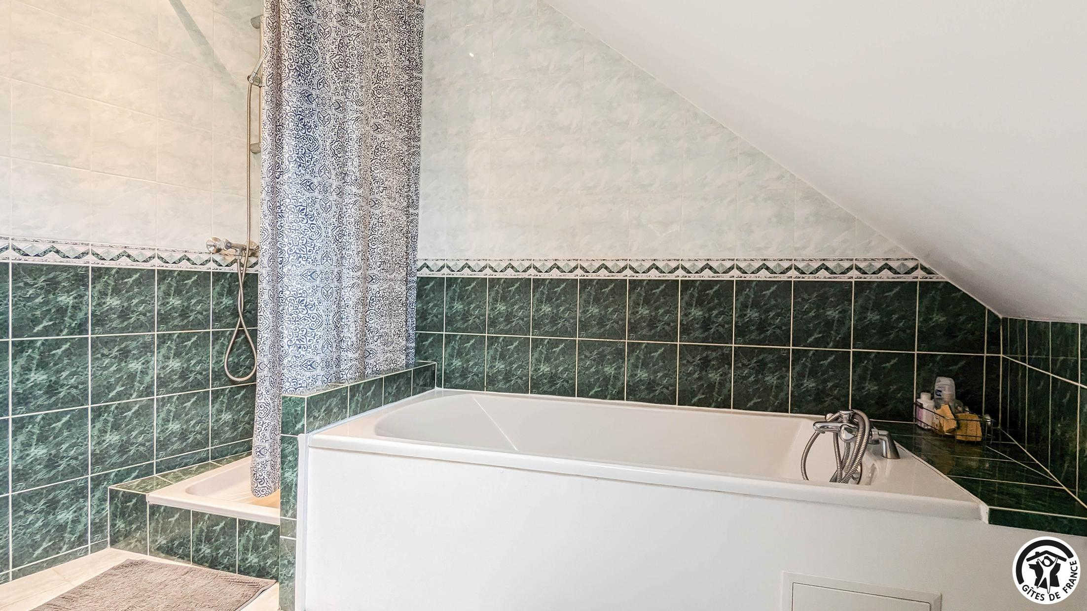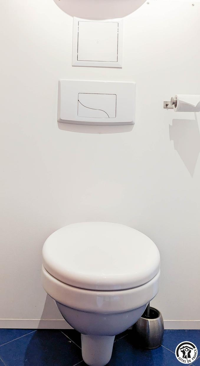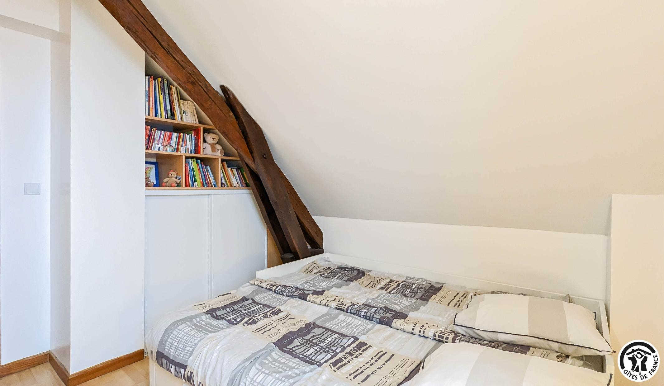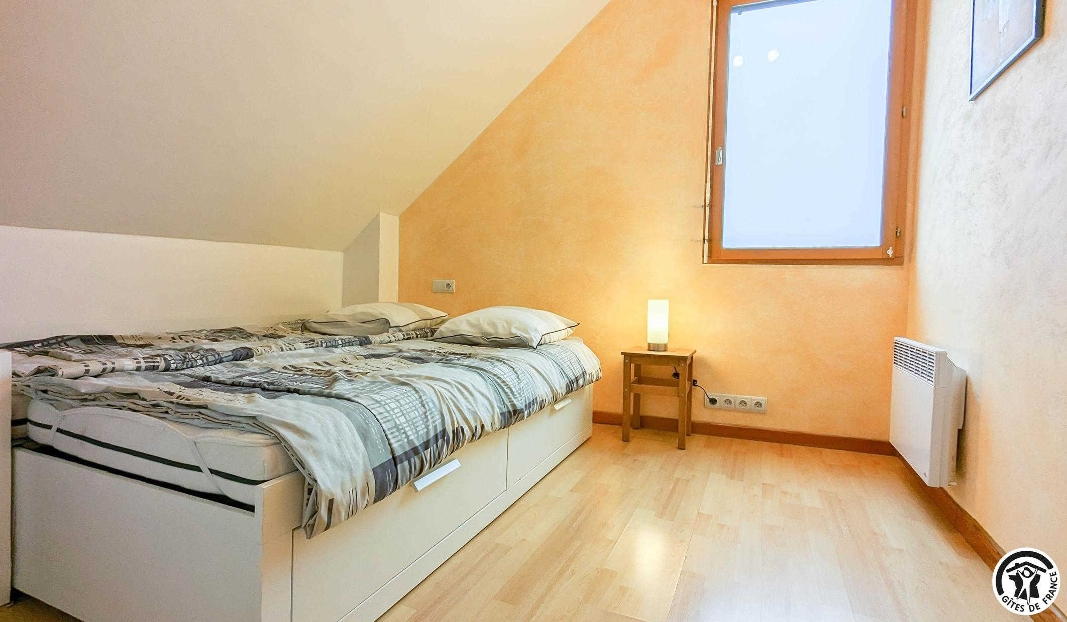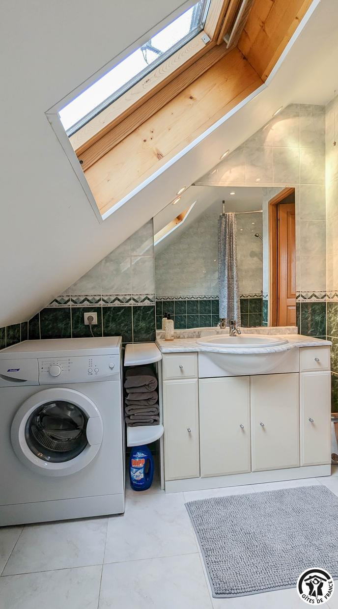 – à l’étage (escalier en colimaçon sécurisé) : 2 chambres (1 lit 2 personnes en 140cm) (2 lits gigognes 1 personne en 80cm), 1 WC indépendant, 1 salle de bains + douche.