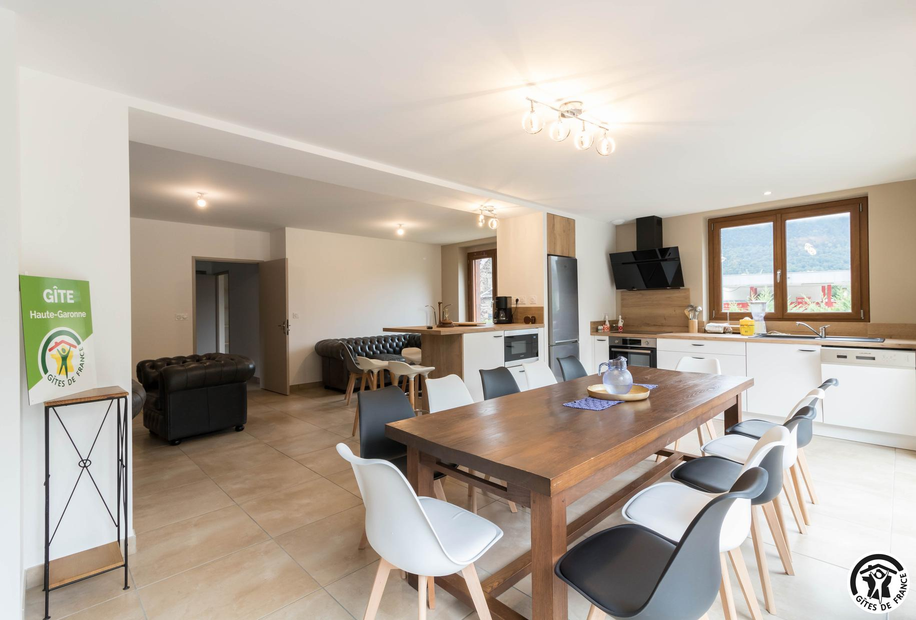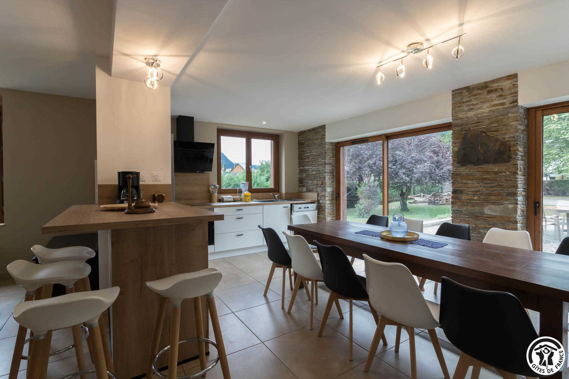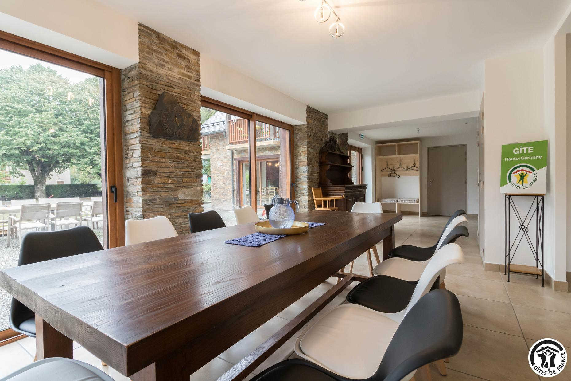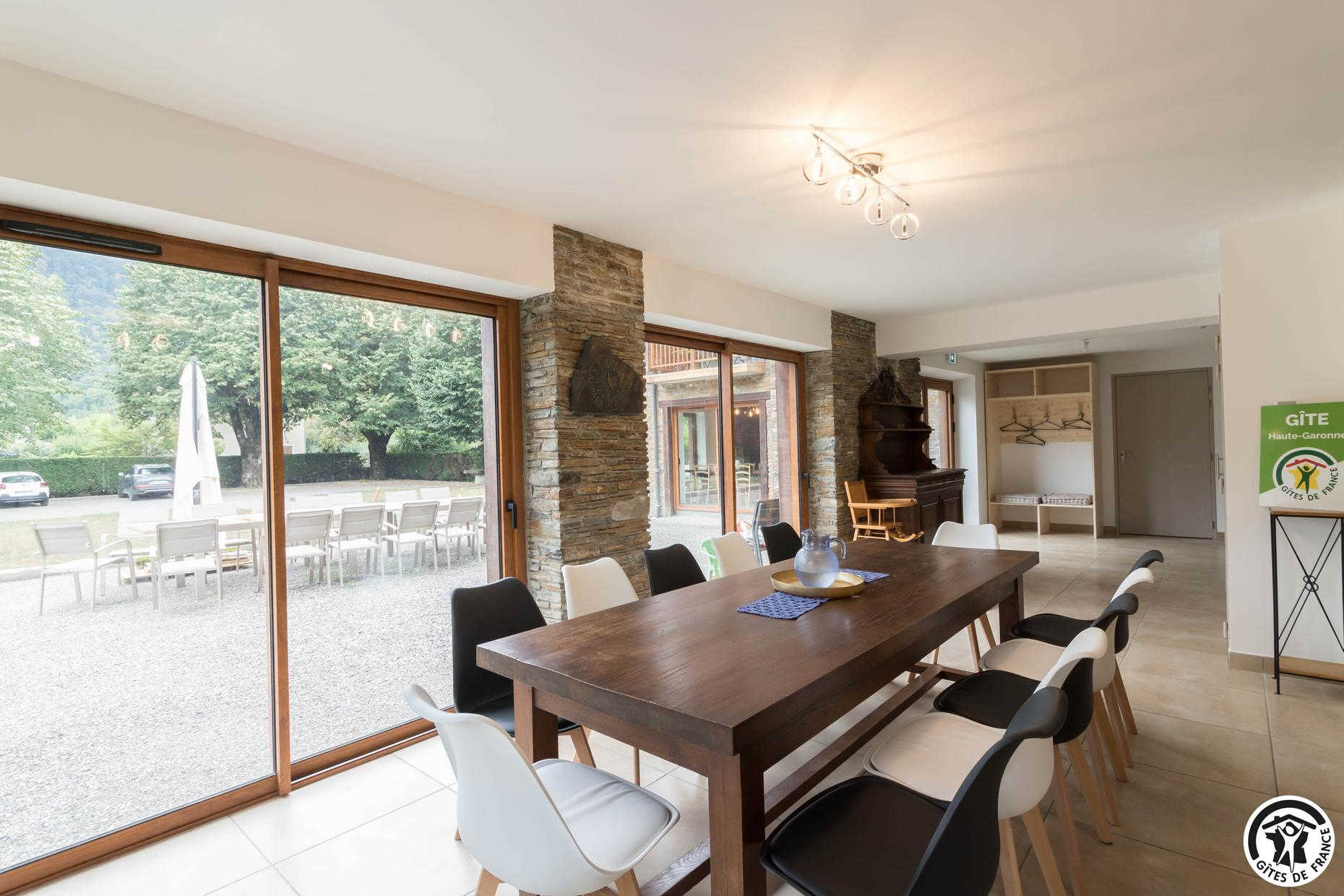 Superbe façade en pierres des Pyrénées. Gîte fait pour les groupes de 15 personnes : familles ou professionnels. Espace de coworking et salle de réunion sur place.