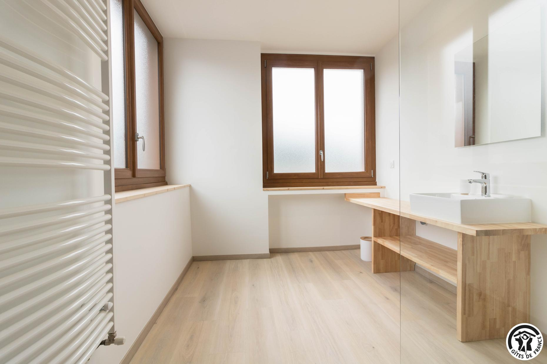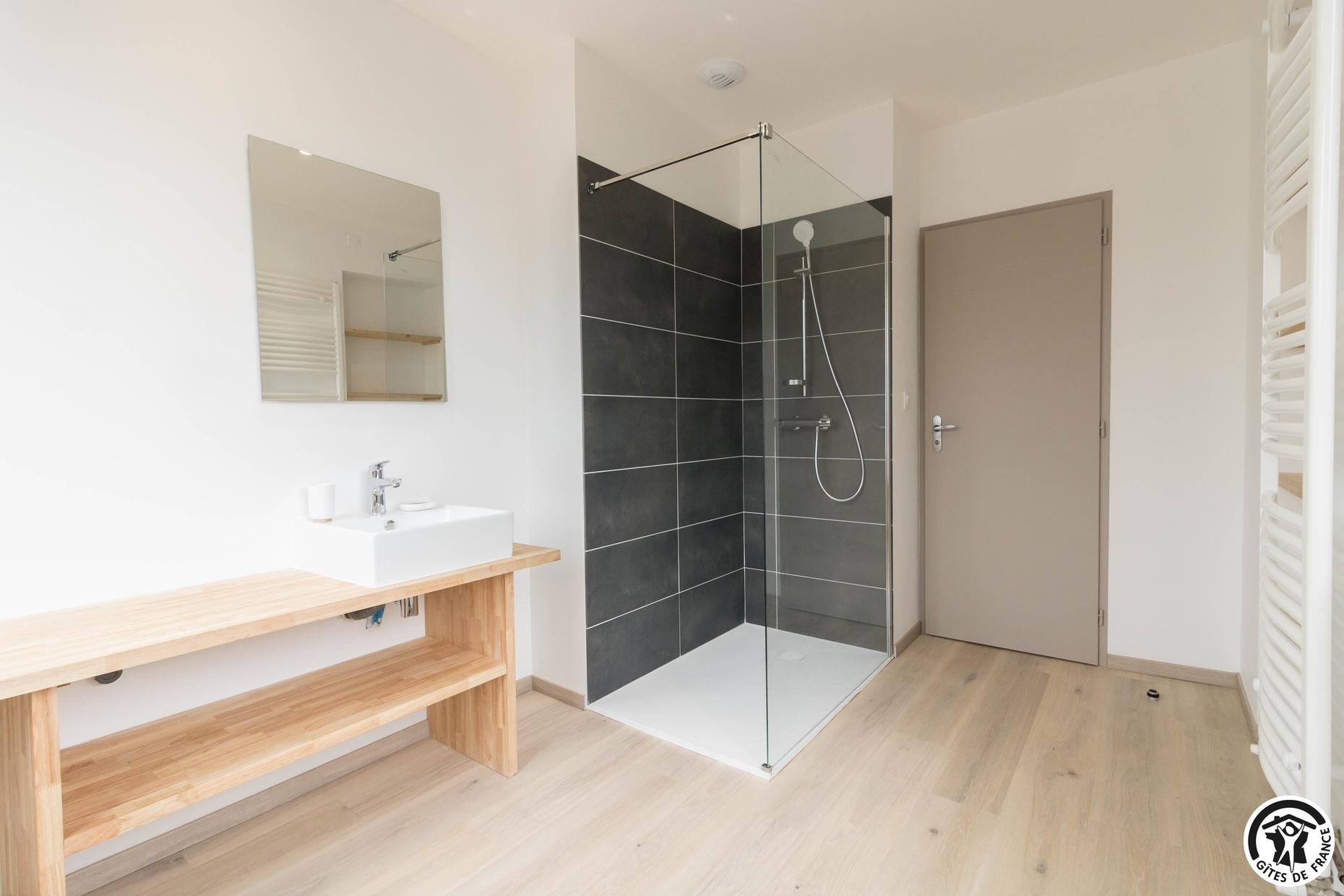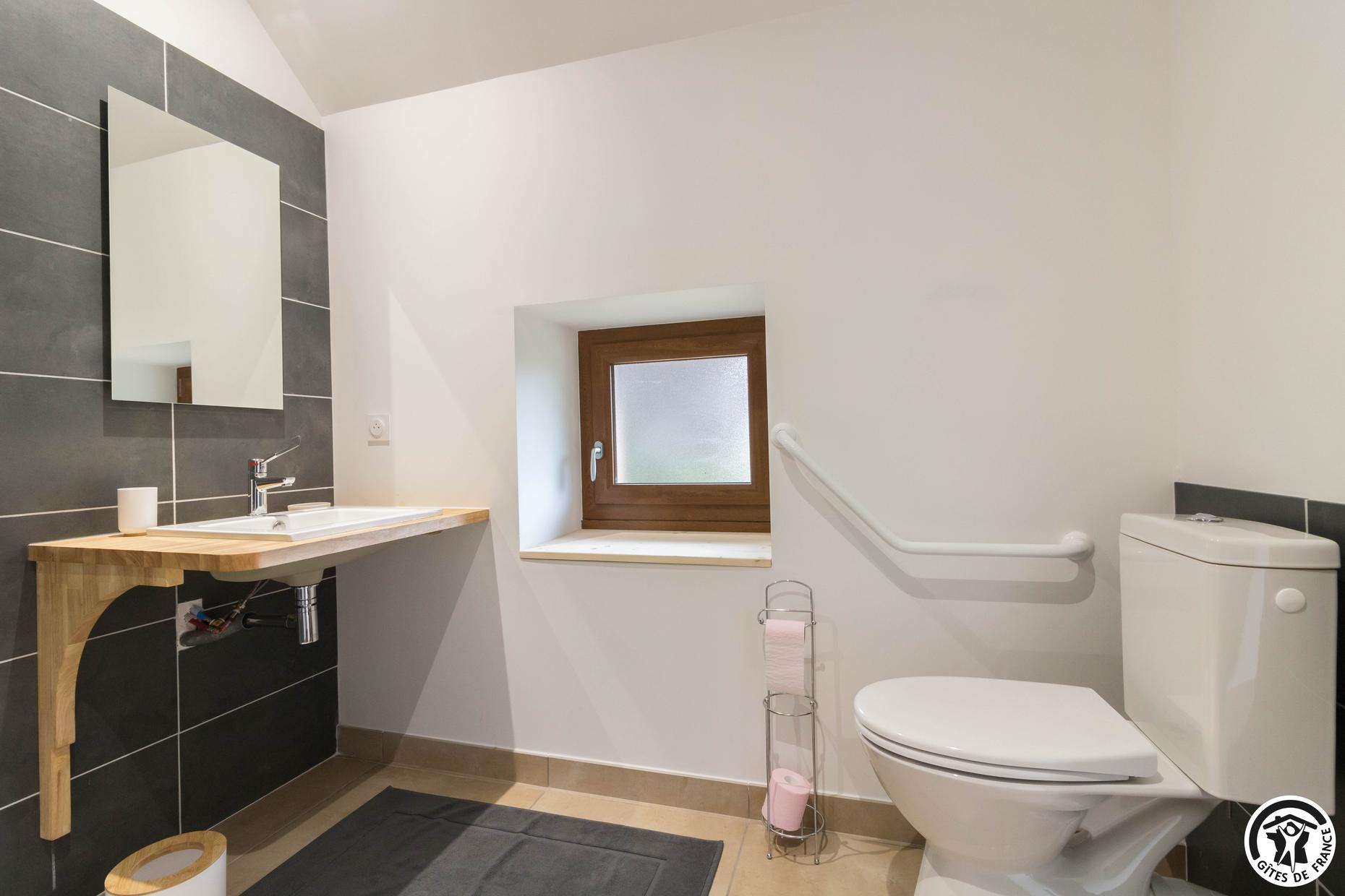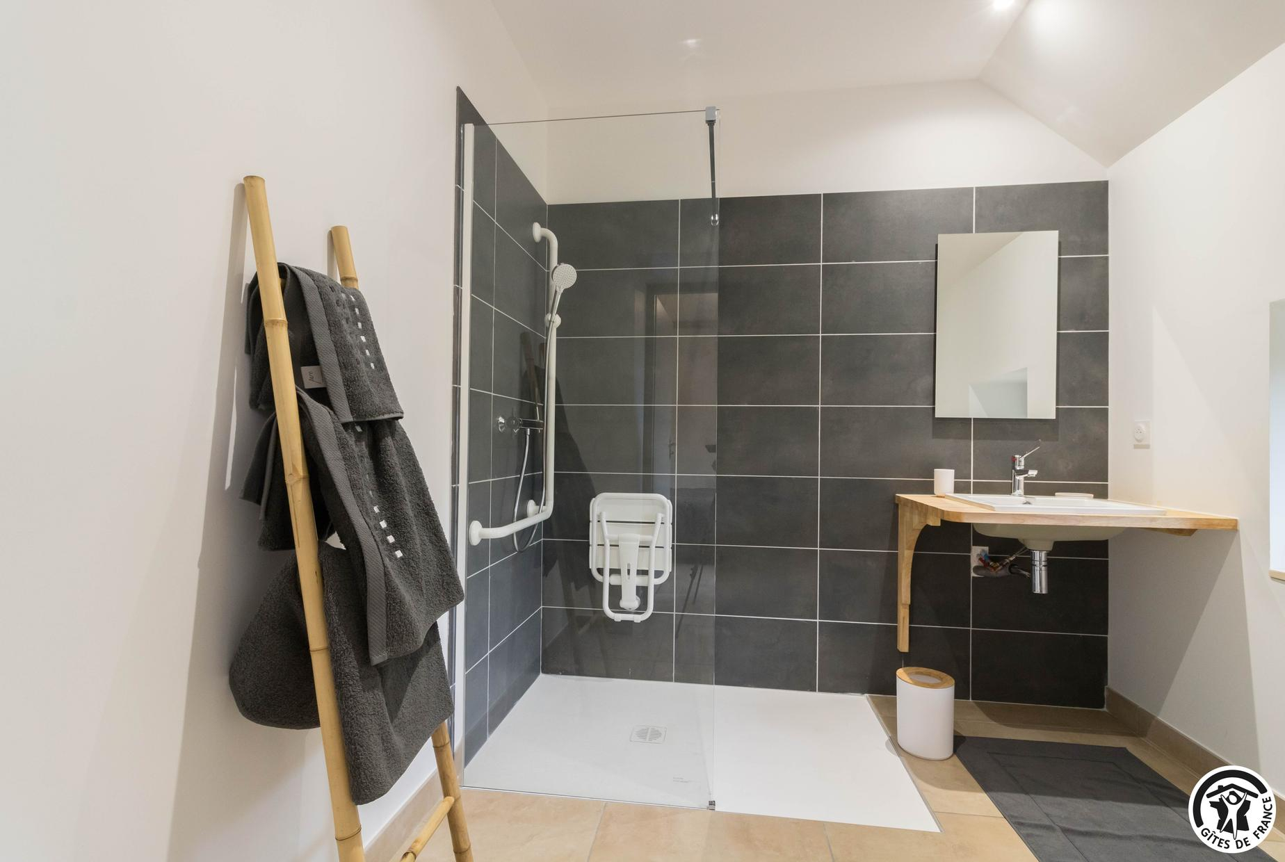 – Au rez-de-chaussée : entrée – espace repas/cuisine intégrée – salon – WC PMR indépendant – chambre PMR (1 lit double et 1 salle d’eau/WC). Le lave-linge est accessible au -1 ;