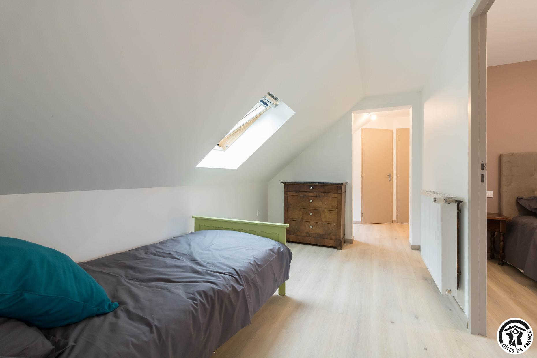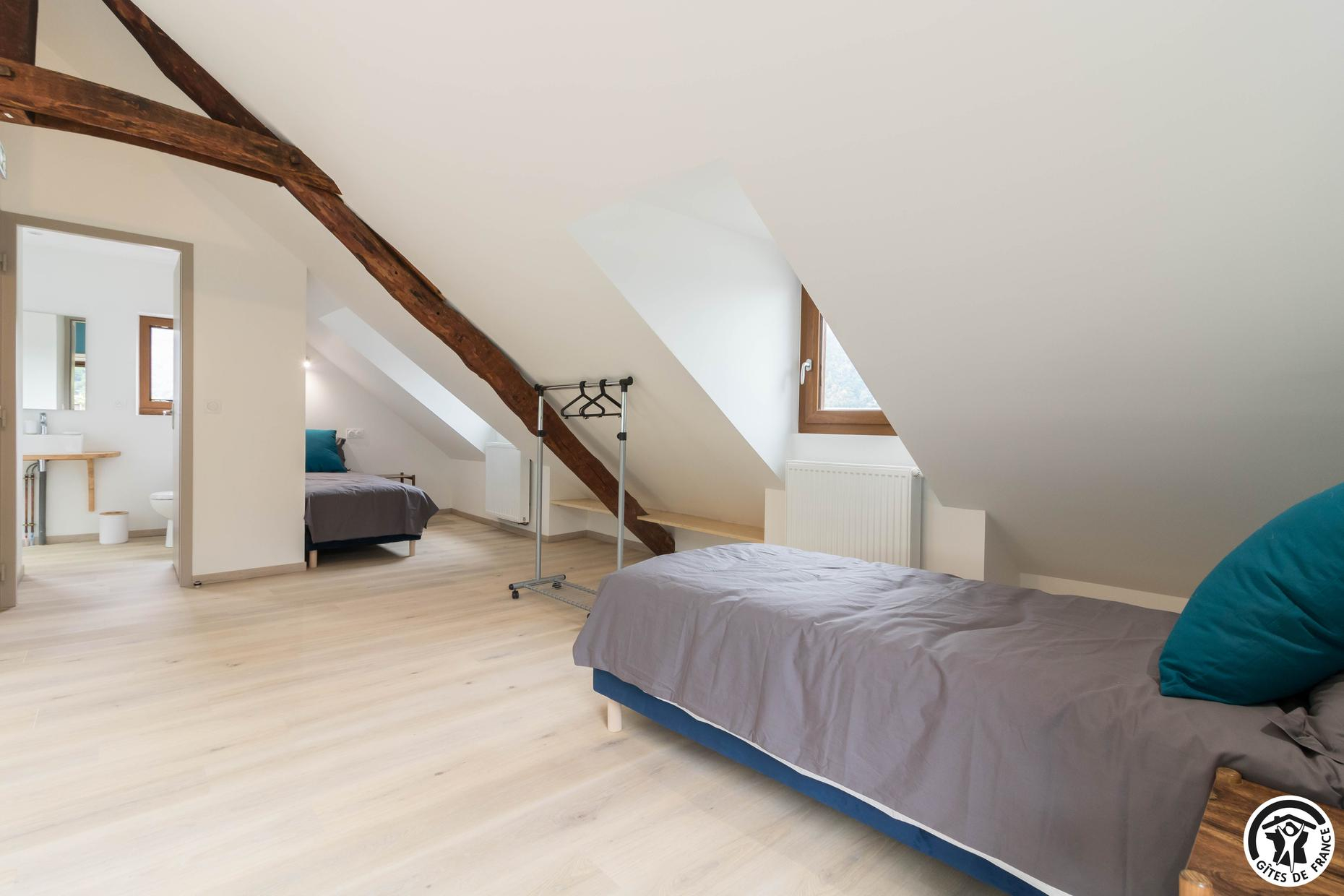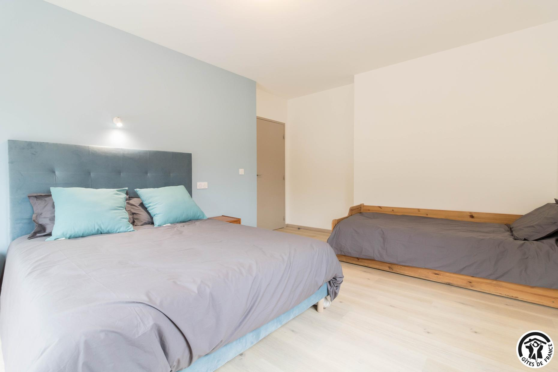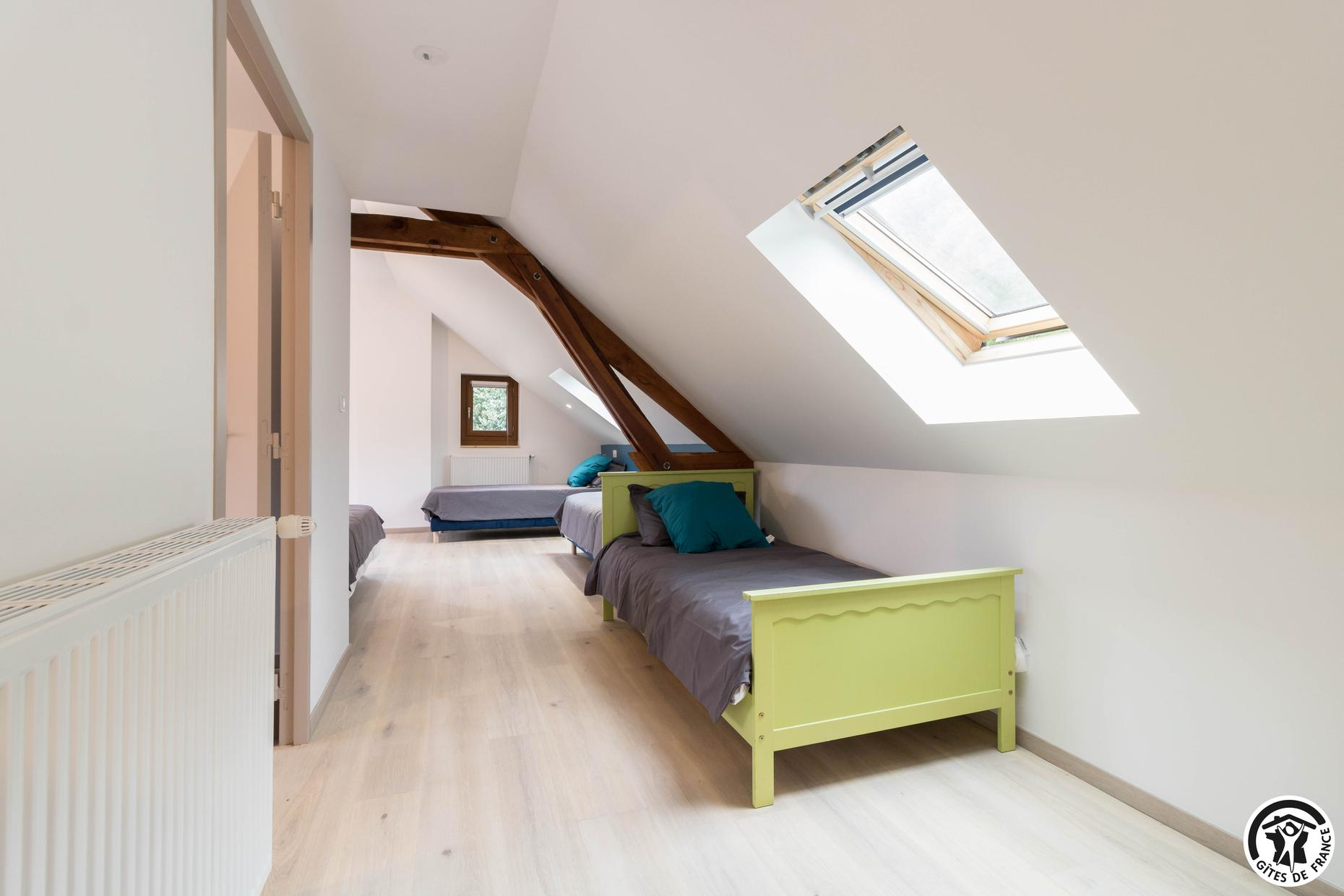 – Au deuxième étage : une chambre avec 1 lit double et 2 lits simples ainsi qu’une salle d’eau privative avec WC.