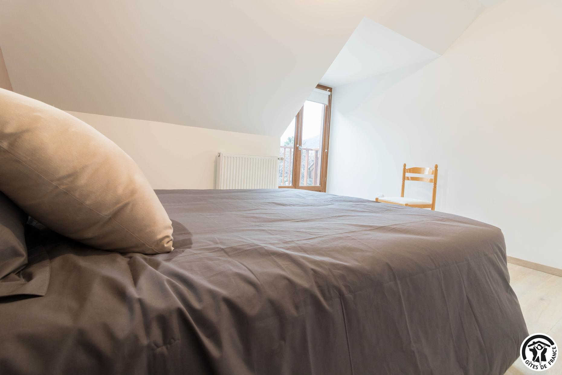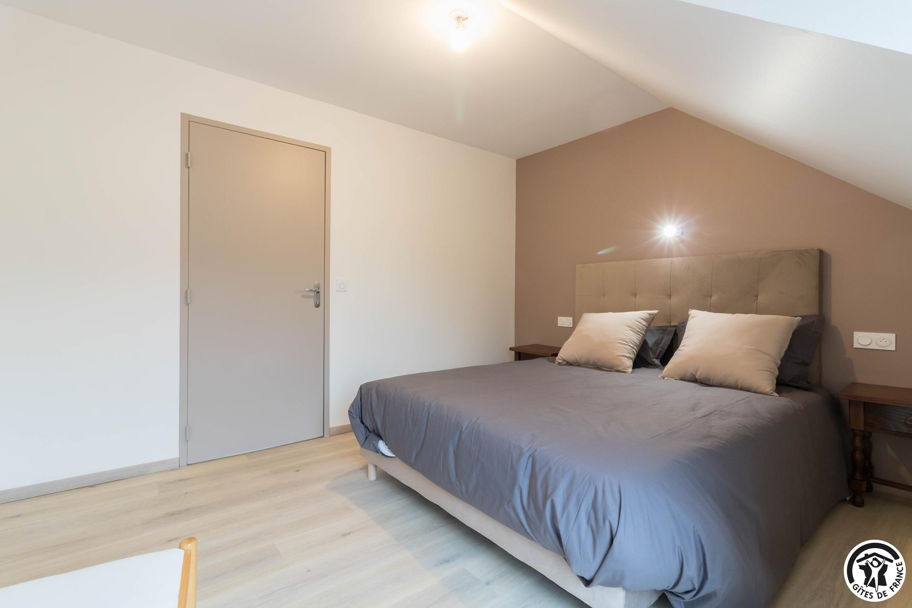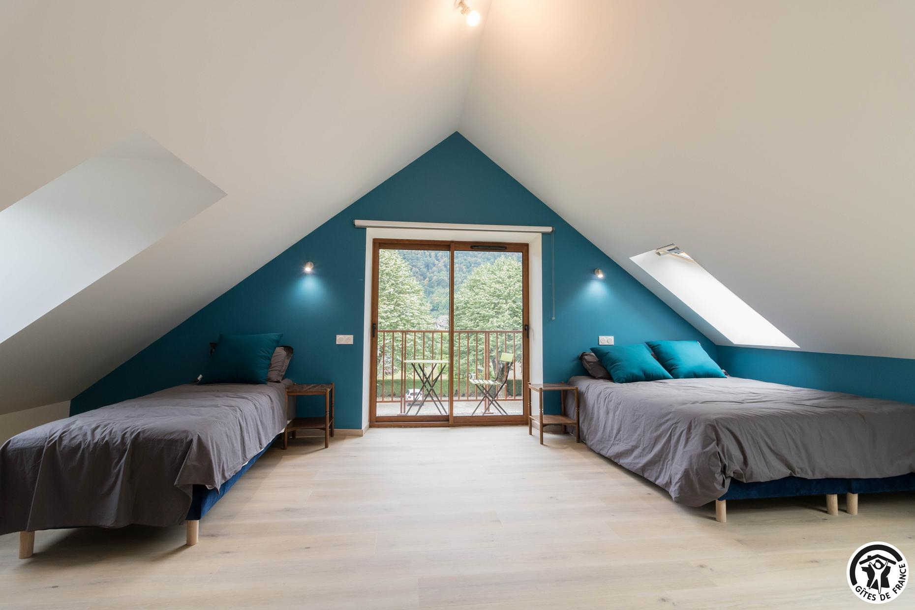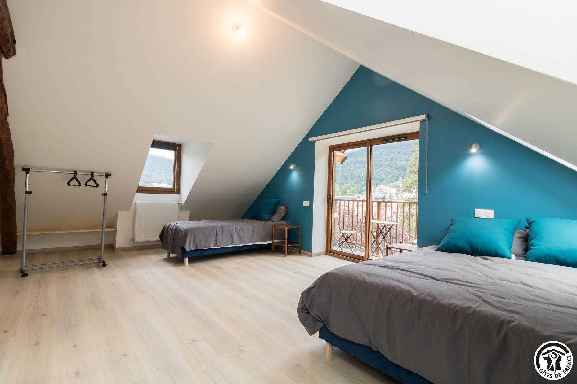 – Au deuxième étage : une chambre avec 1 lit double et 2 lits simples ainsi qu’une salle d’eau privative avec WC.