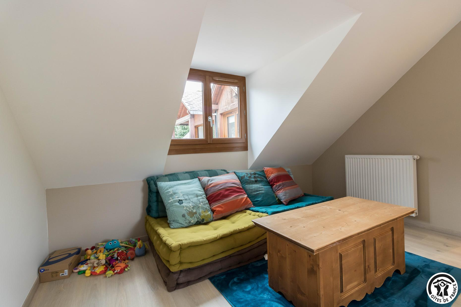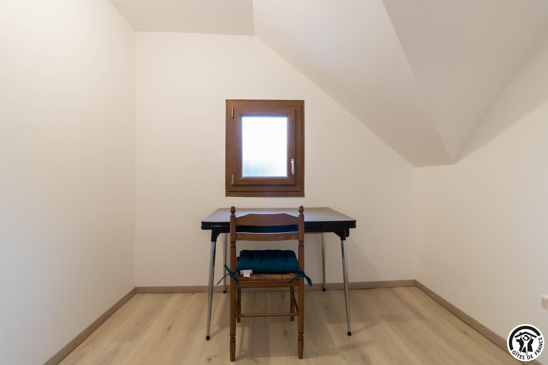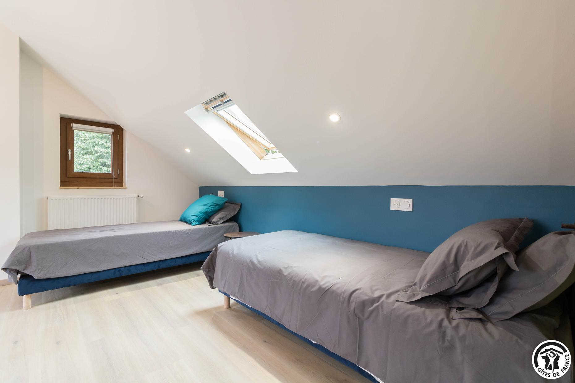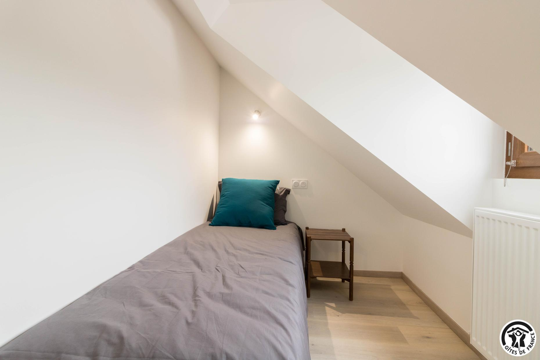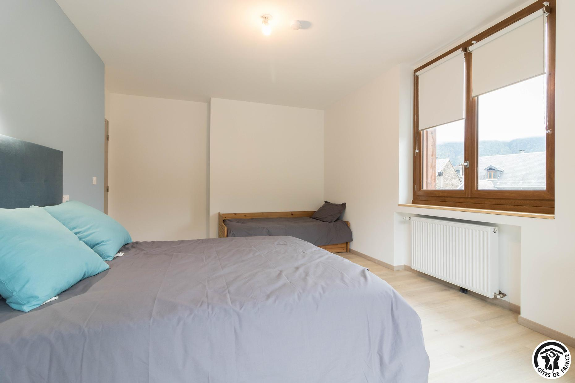 – Au deuxième étage : une chambre avec 1 lit double et 2 lits simples ainsi qu’une salle d’eau privative avec WC.