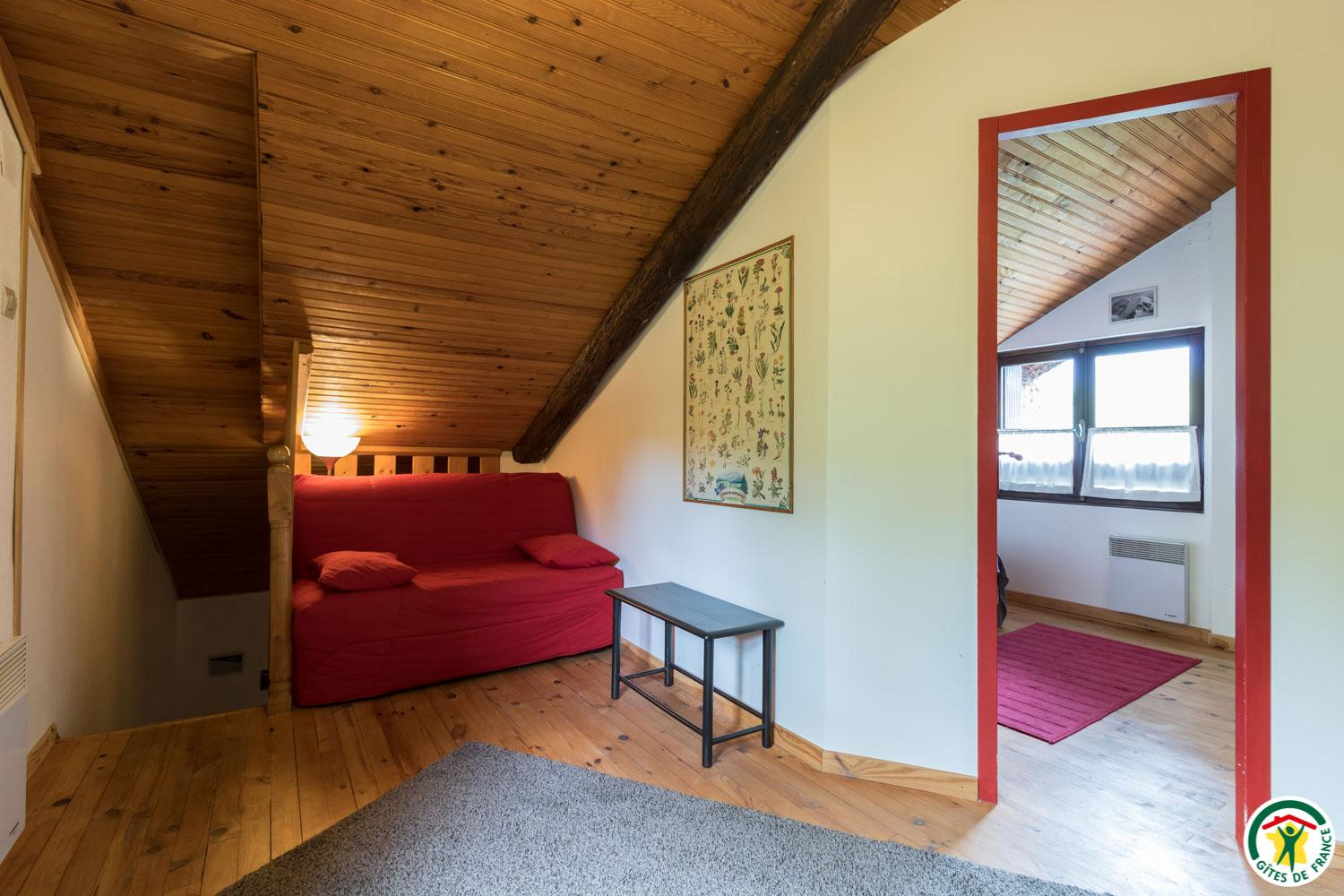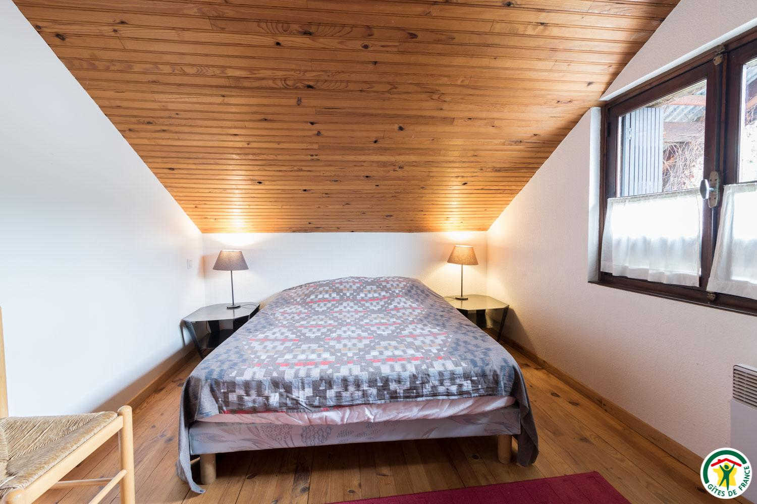 – à l’étage : mezzanine avec canapé convertible pour 2 personnes en 140*190cm, 2 chambres mansardées (1 lit double en 140cm chacune), salle d’eau/WC.