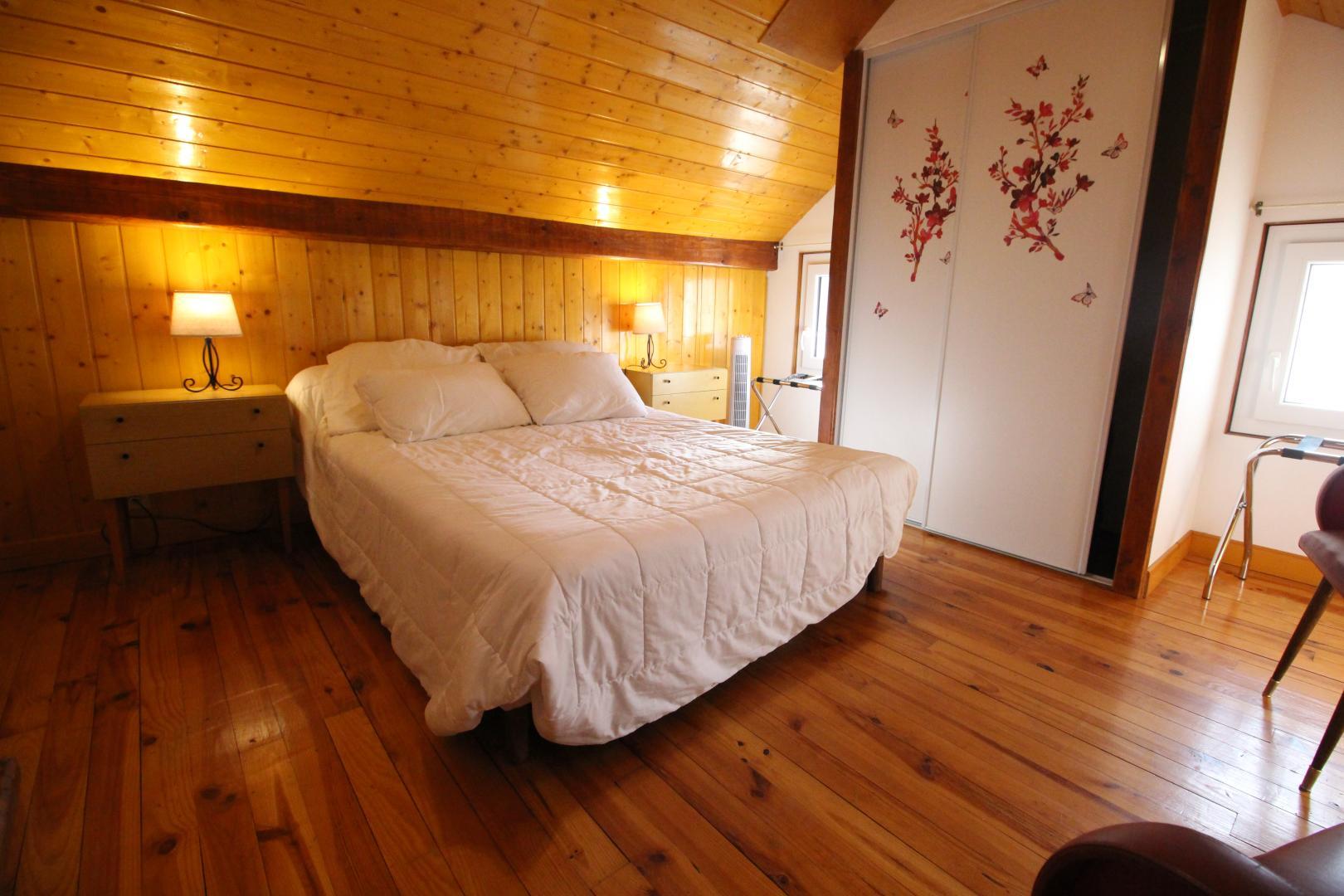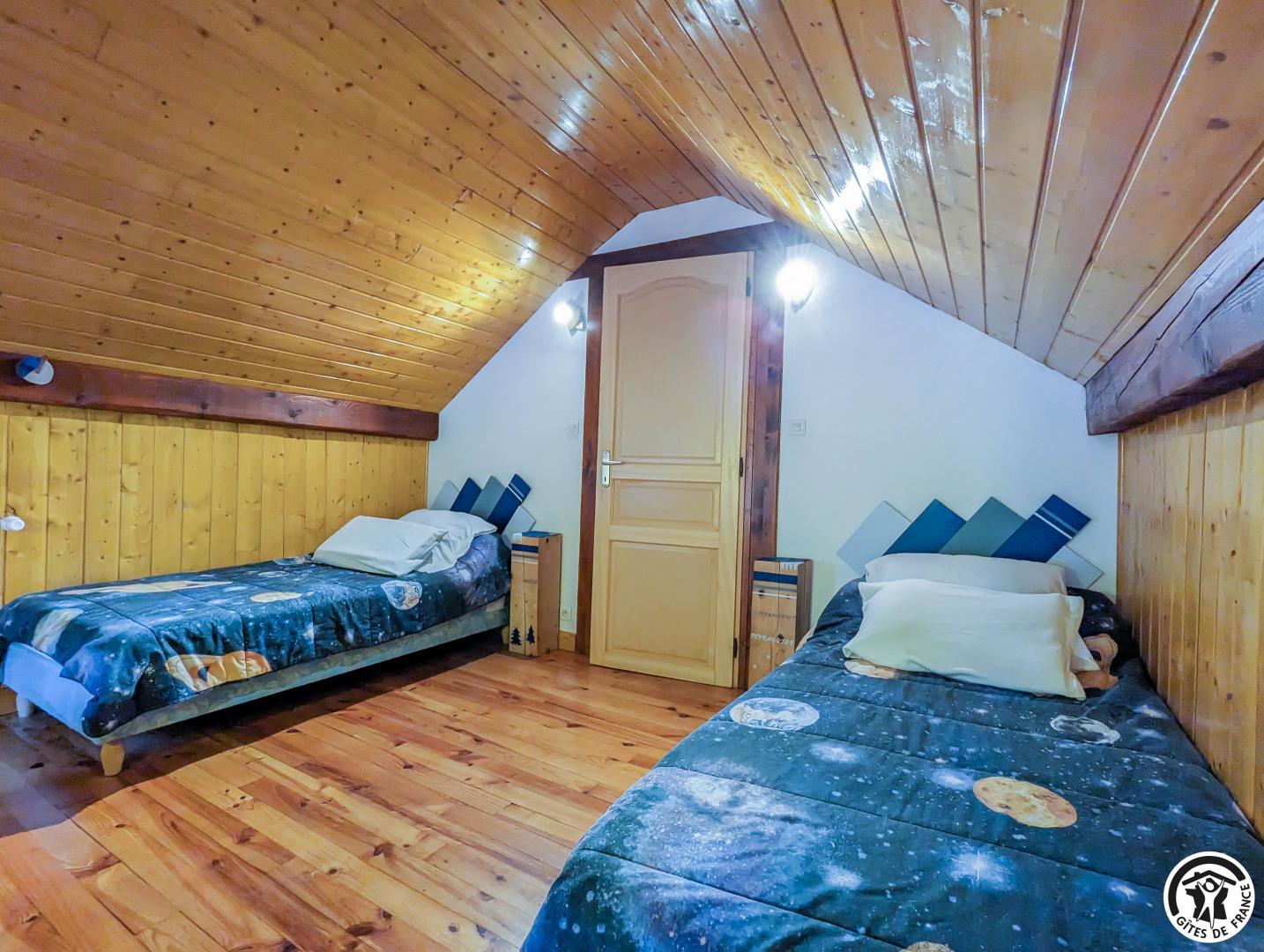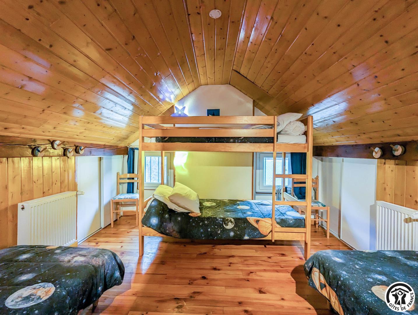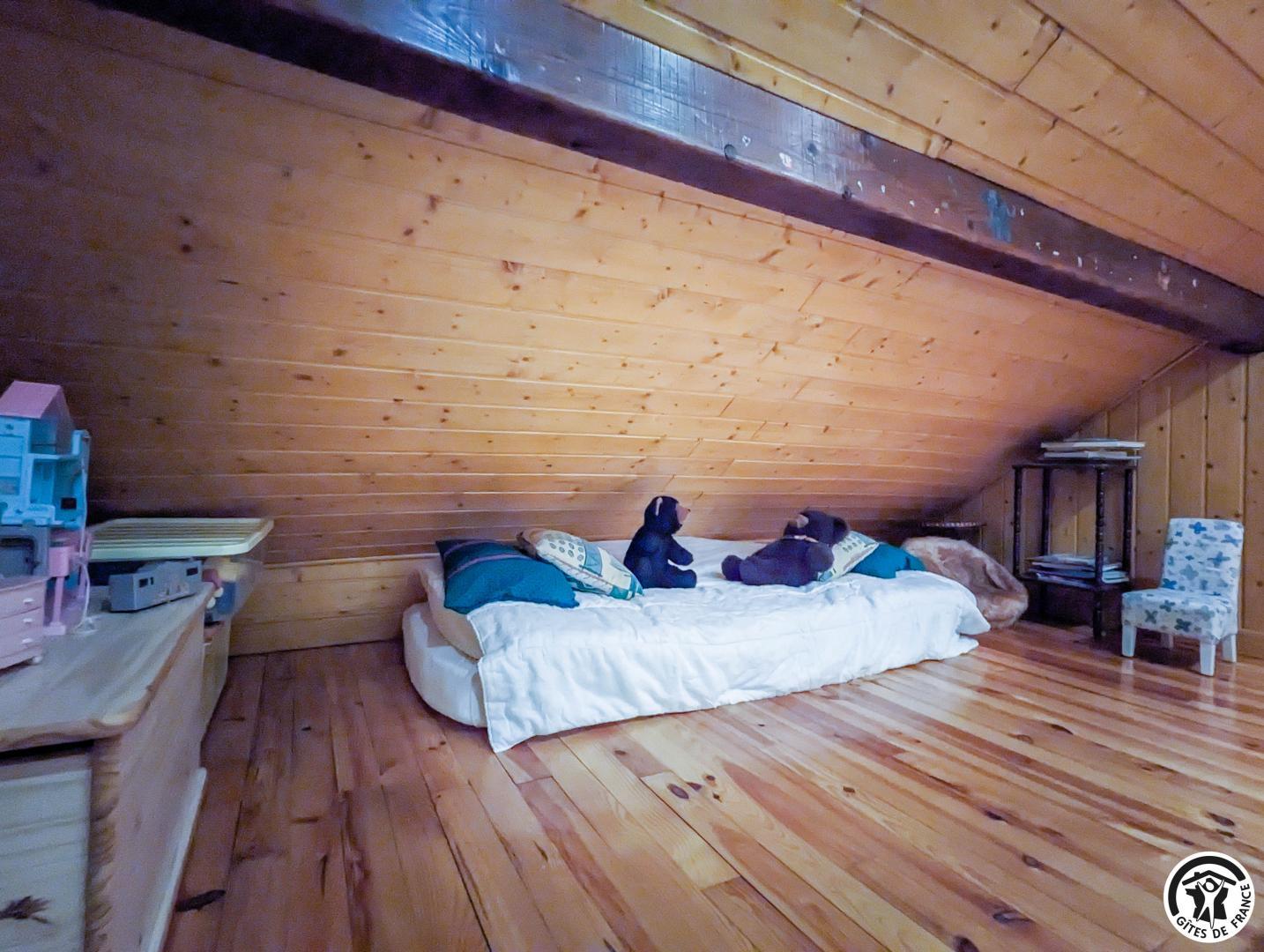 – au deuxième étage : 2 chambres mansardées (2 lits en 90 cm et 2 lits superposés en 90cm) (1 lit 2 personnes en 140cm), salle de bains, WC séparé et coin-jeux pour enfants