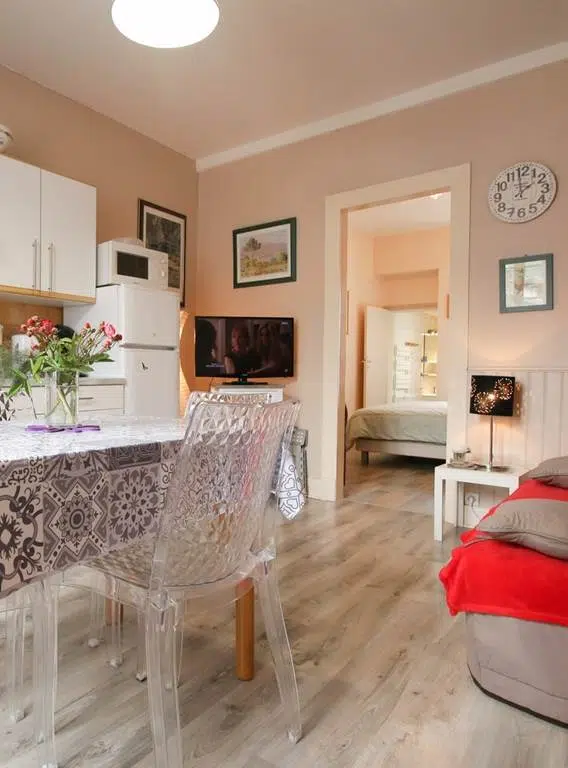 L’appartement est située au centre-ville et tous les déplacements peuvent s’effectuer à pied. Une supérette se trouve juste en face la maison pour l’approvisionnement ou le dépannage.