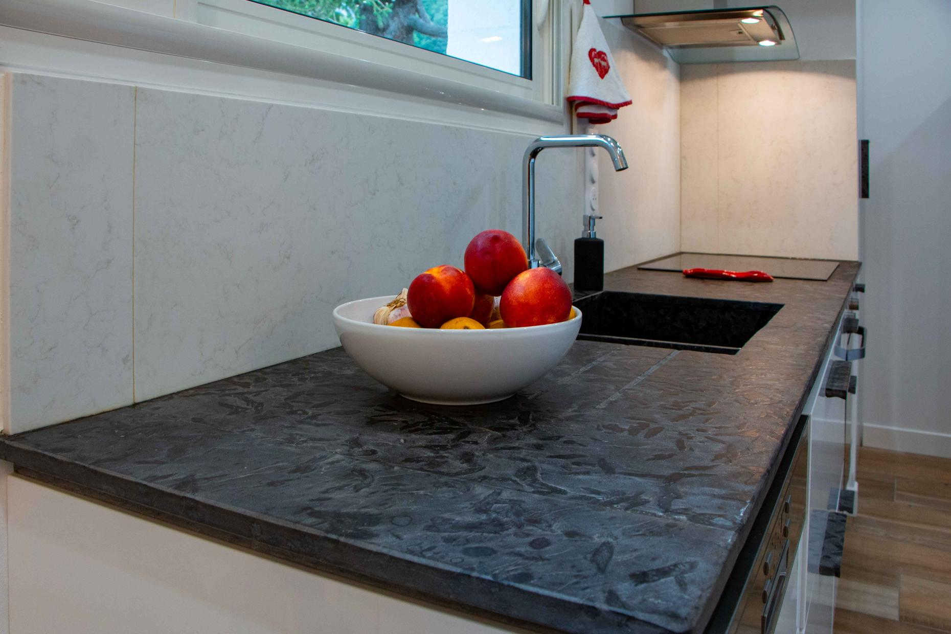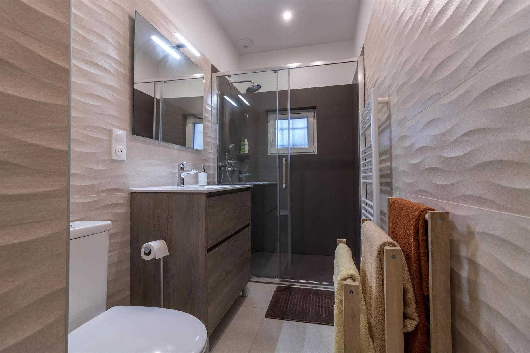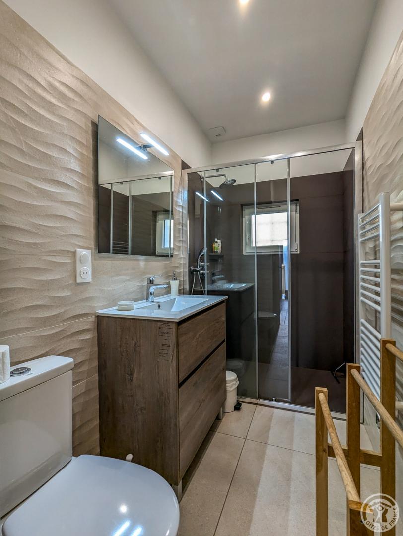 Accès à la maison par trois marches, entrée, grande pièce à vivre très agréable et lumineuse avec espace salon, espace repas et cuisine intégrée ouverte sur le séjour, chambre « Art Populaire » (1 lit pour 2 personnes en 160cm avec sa salle d’eau privative : douche à l’italienne de 140 x 90 /lavabo/WC), chambre « Aux Oiseaux » (1 lit pour 2 personnes en 160cm avec salle d’eau commune, communicante : douche à l’italienne de 140 x 90/lavabo/WC), chambre « De L’herbier » (2 lits pour 1 personne en 90cm, possibilité de les jumeler) et chambre de 10m2 « Explorateurs » (4 lits 1 personne en 90x200cm superposés), Salle d’eau commune : douche à l’italienne de 120 x 90/lavabo. WC indépendant avec lave-mains.
